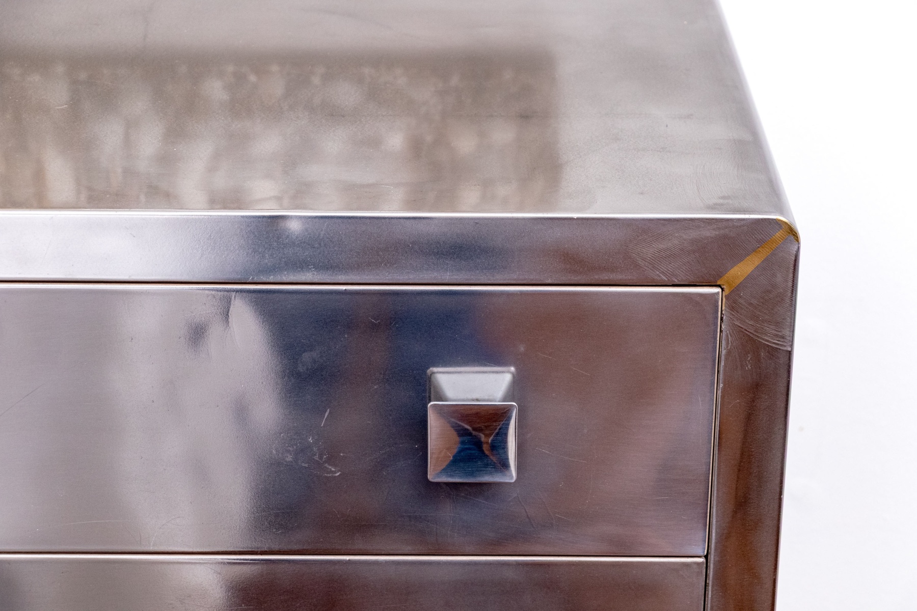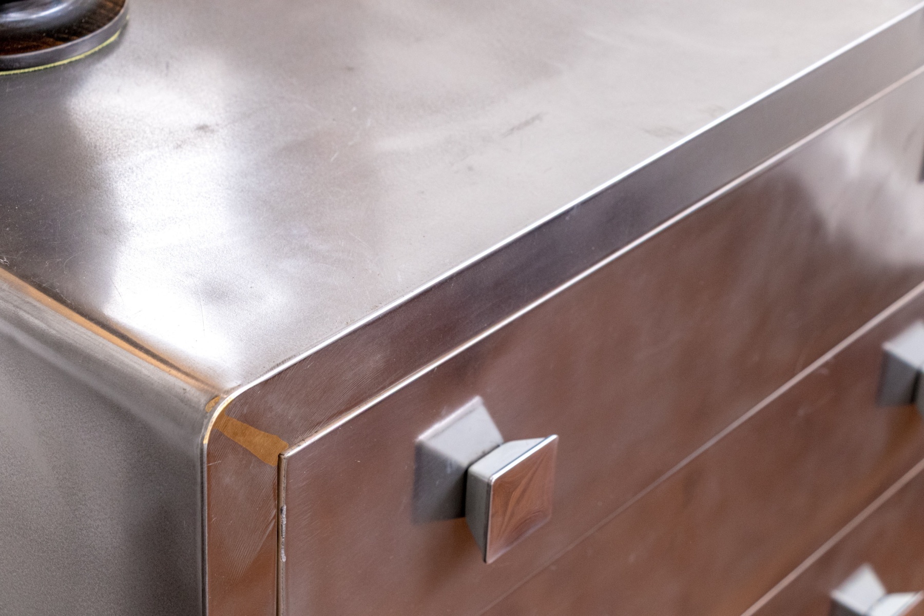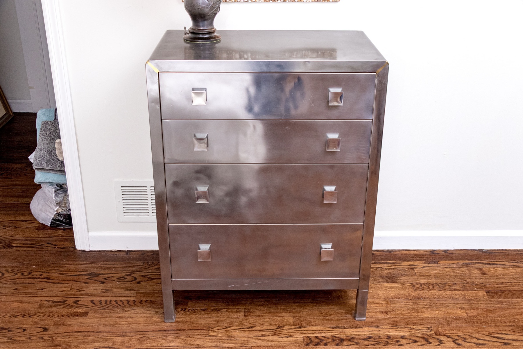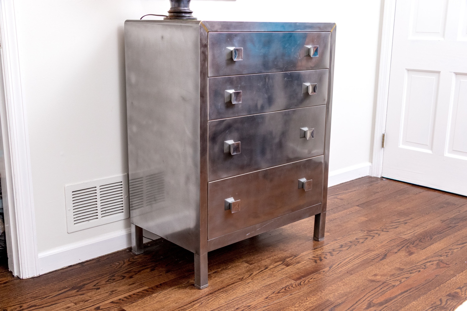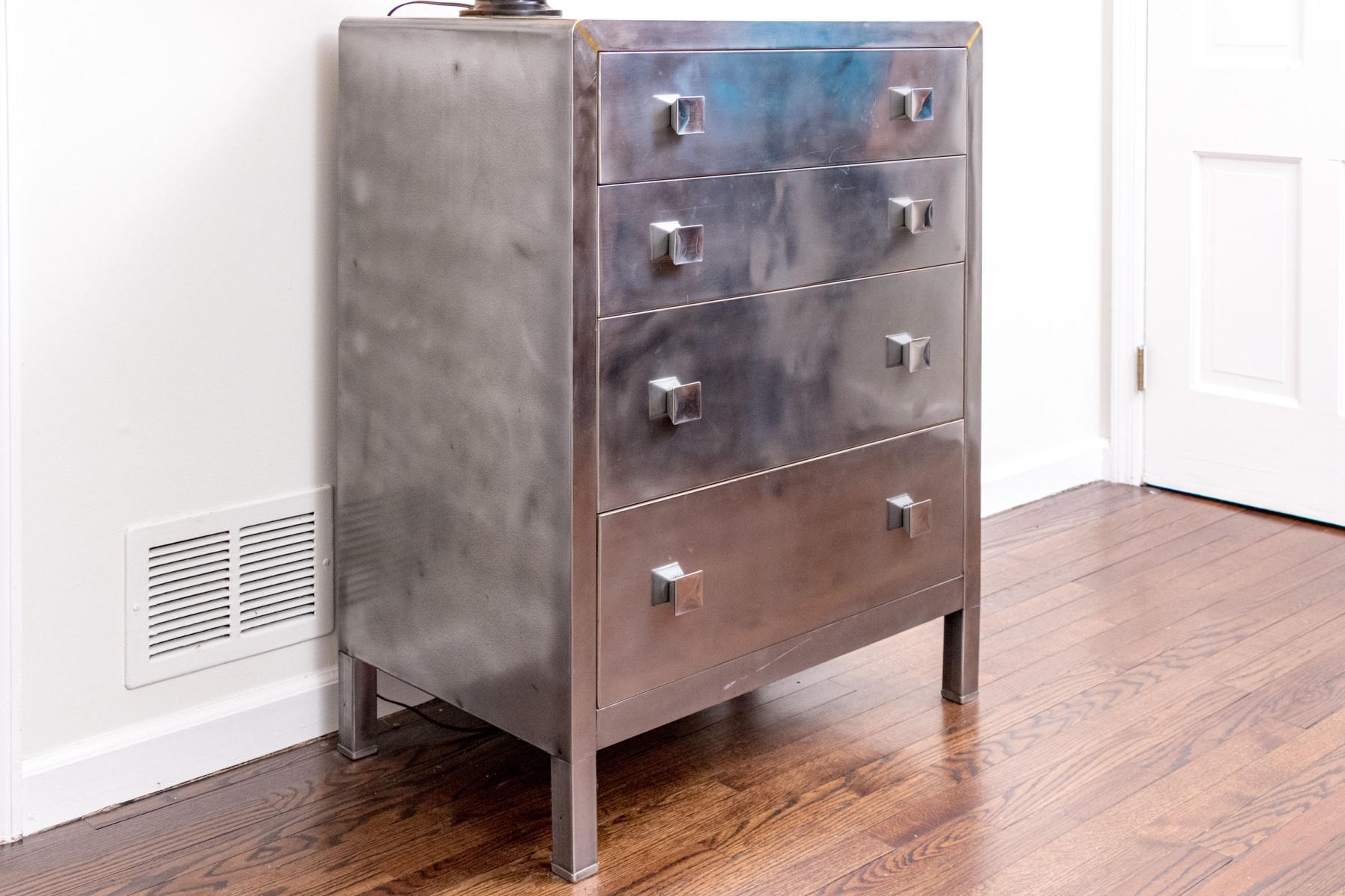 A fabulous Simons Furniture Art Deco chest of drawers circa 1940's clad in gray aluminum throughout for a striking industrial chic flare. The chest features two short and two tall drawers, each adorned with square knobs. The case sports rounded top edges contrasting nicely with straight legs finishing with capped feet.
