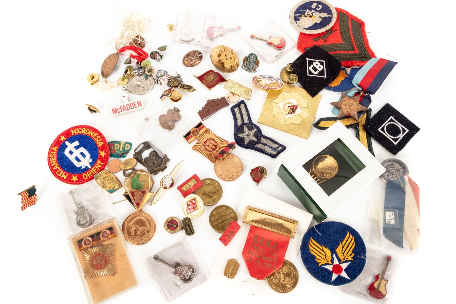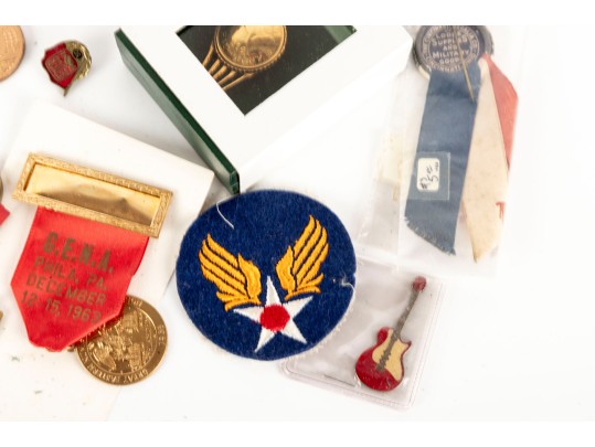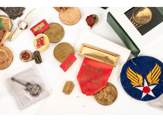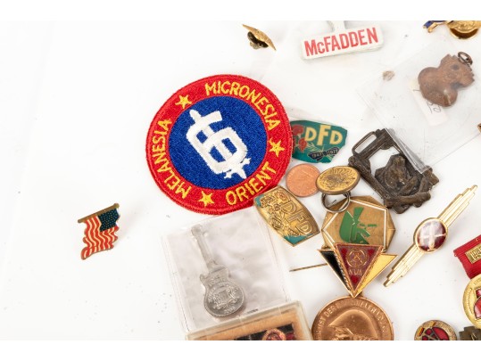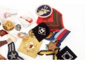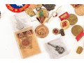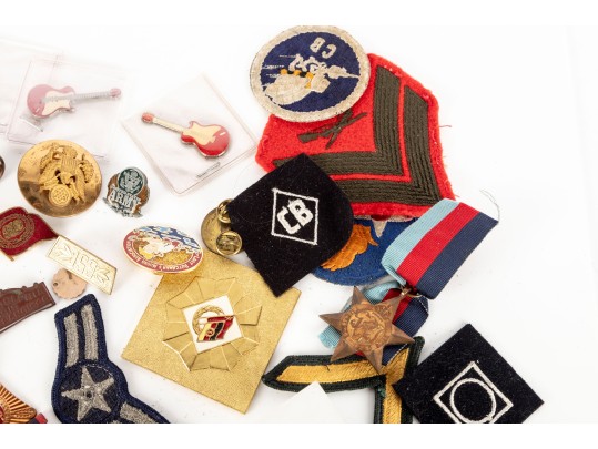 A small collection of vintage soviet military/service medals, wings, badges, etc. Refer to photos for contents and details. Informational identification pamphlets included.