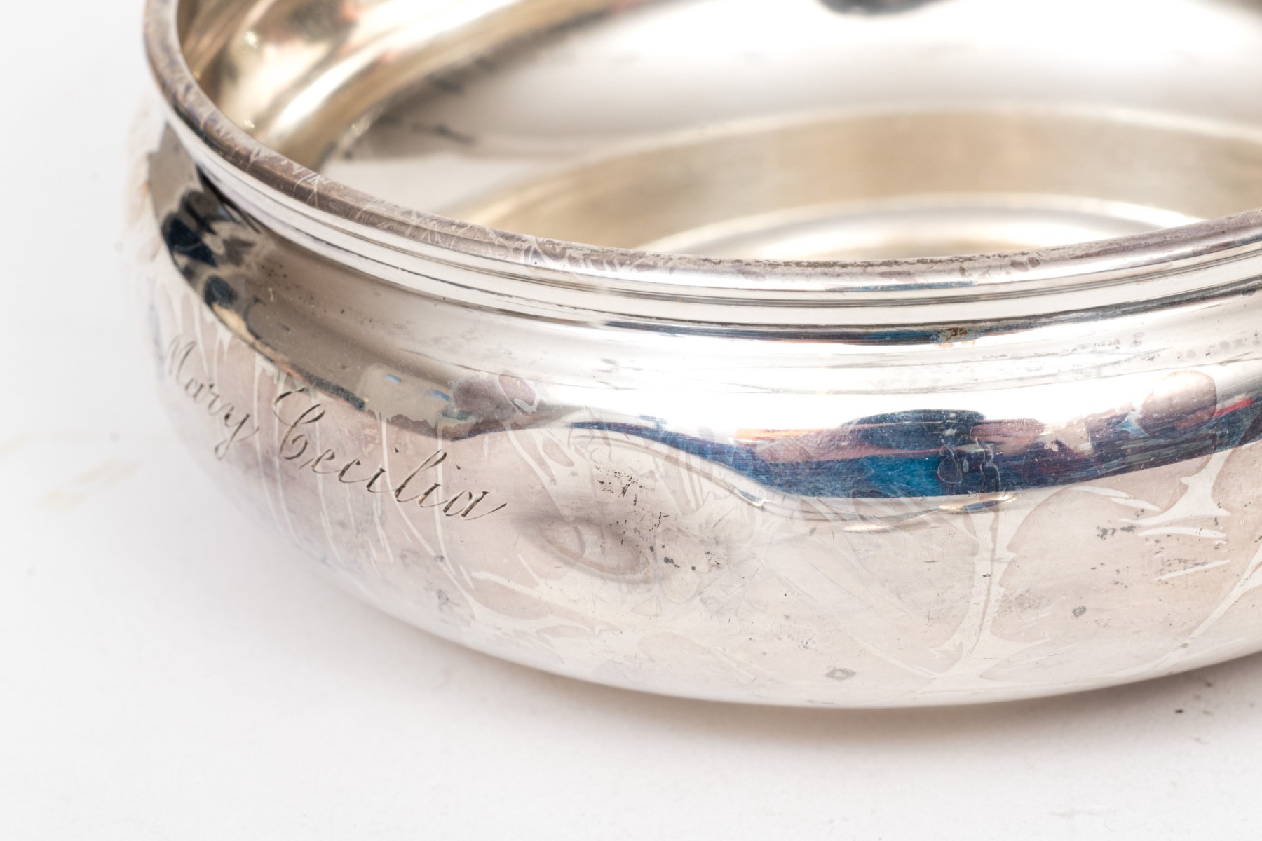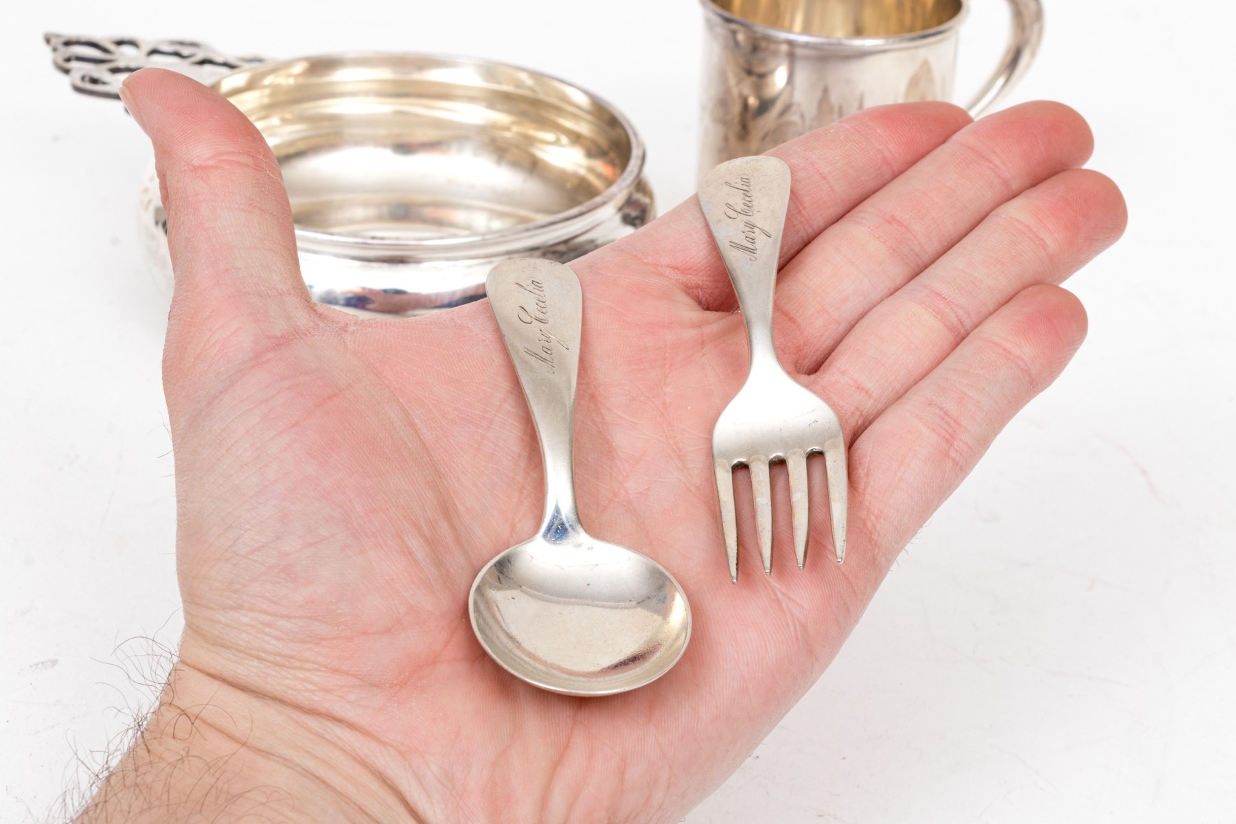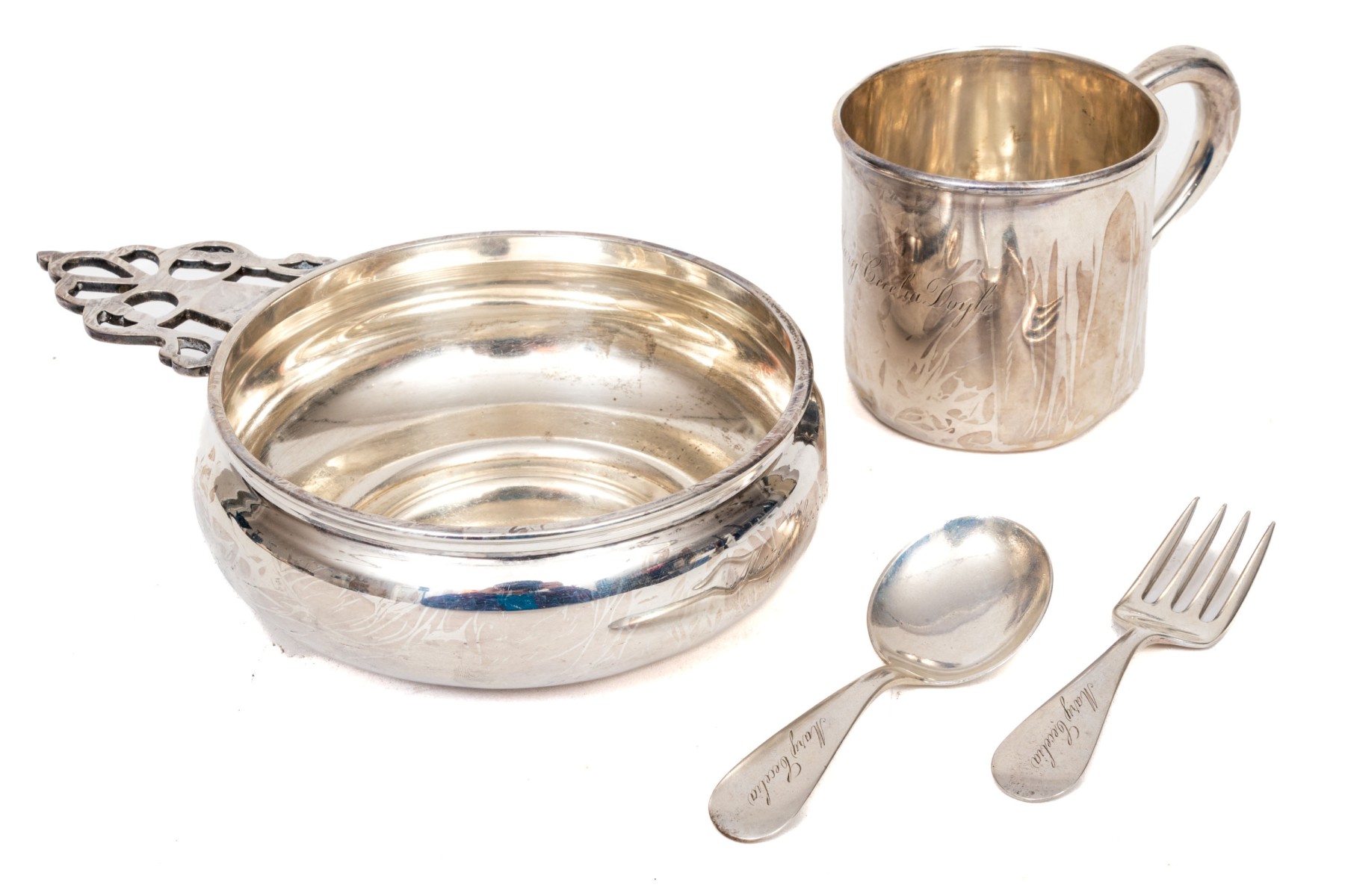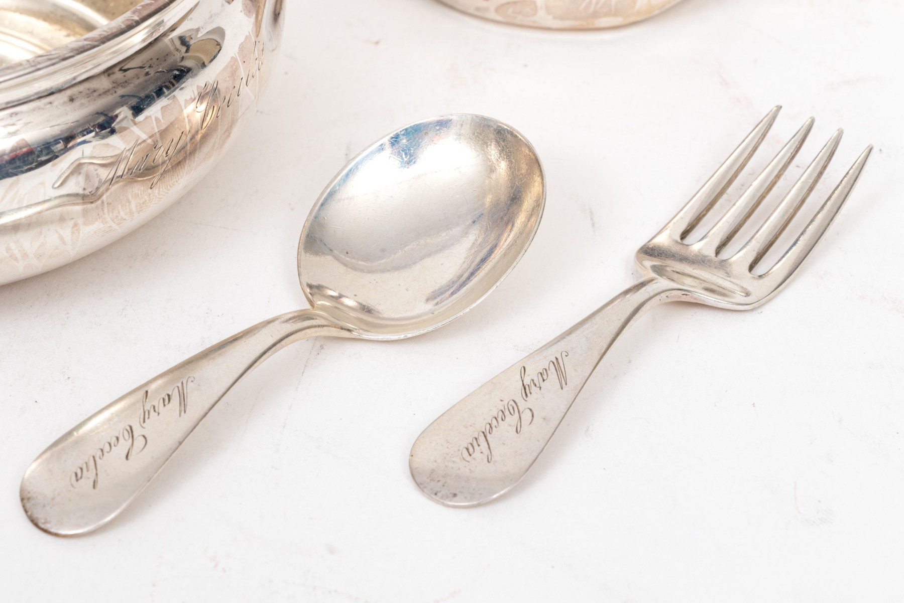 Group of sterling silver baby cup and bowl with spoon and fork. Polished finish and personalized engraving.