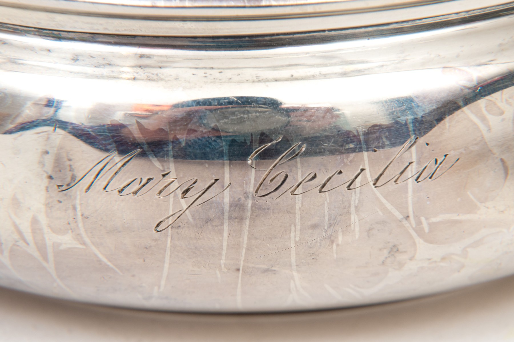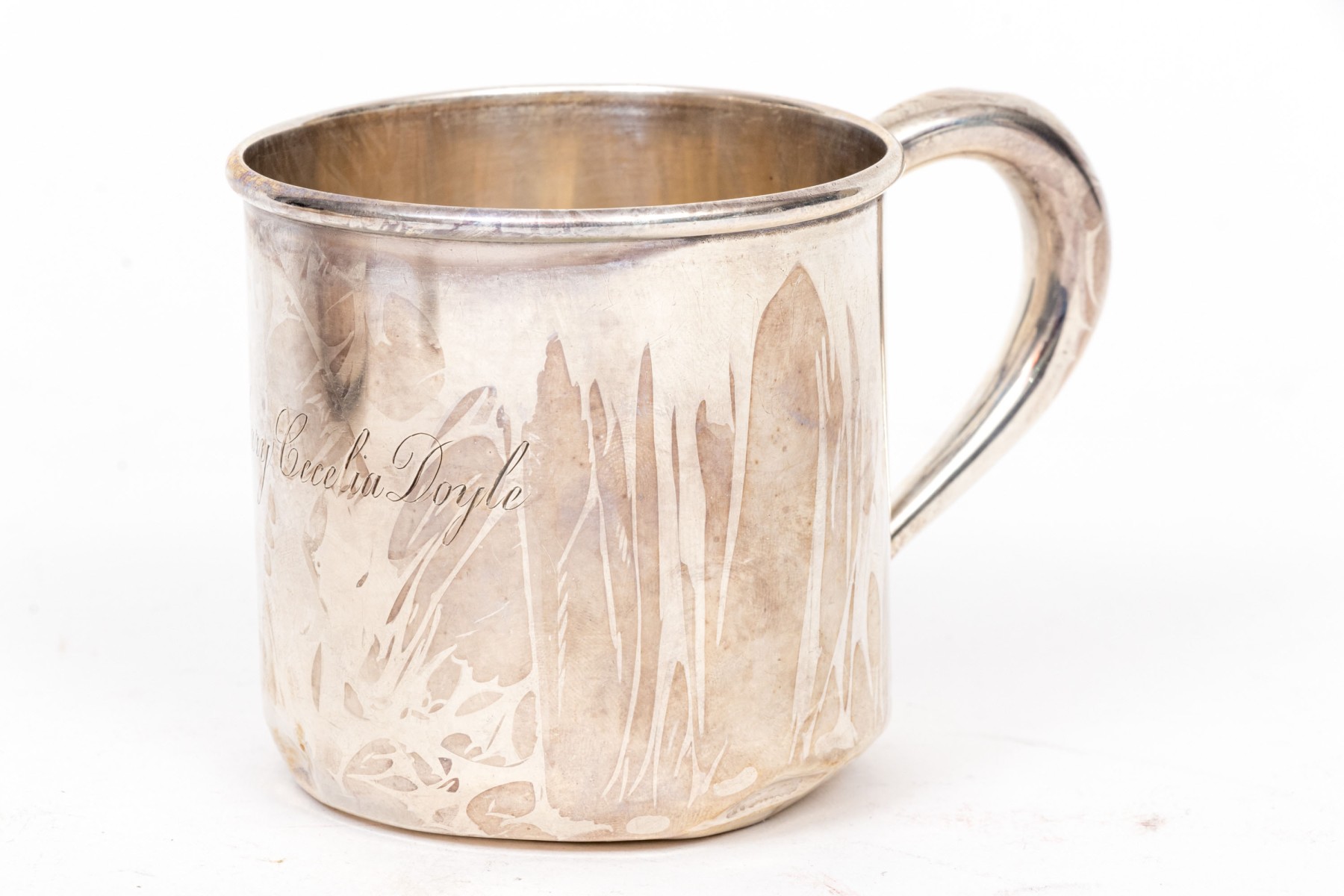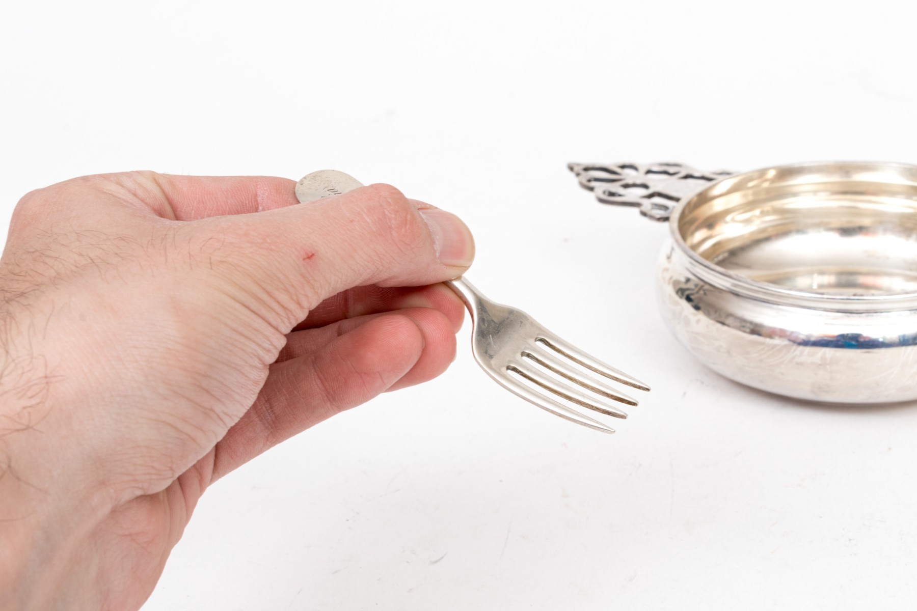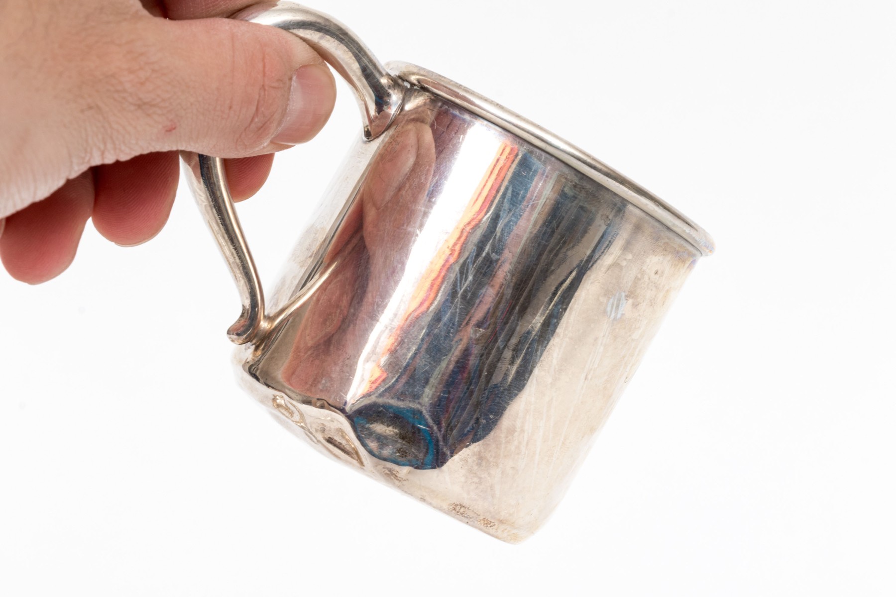 Group of sterling silver baby cup and bowl with spoon and fork. Polished finish and personalized engraving.