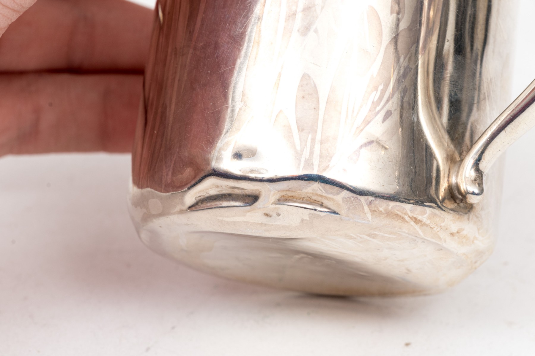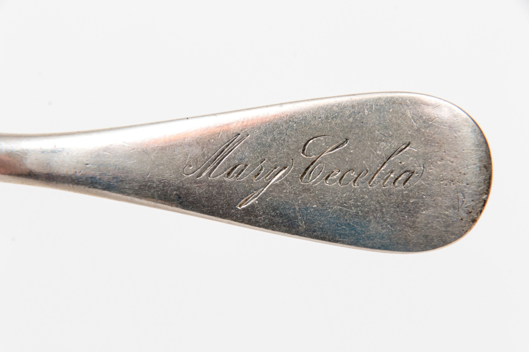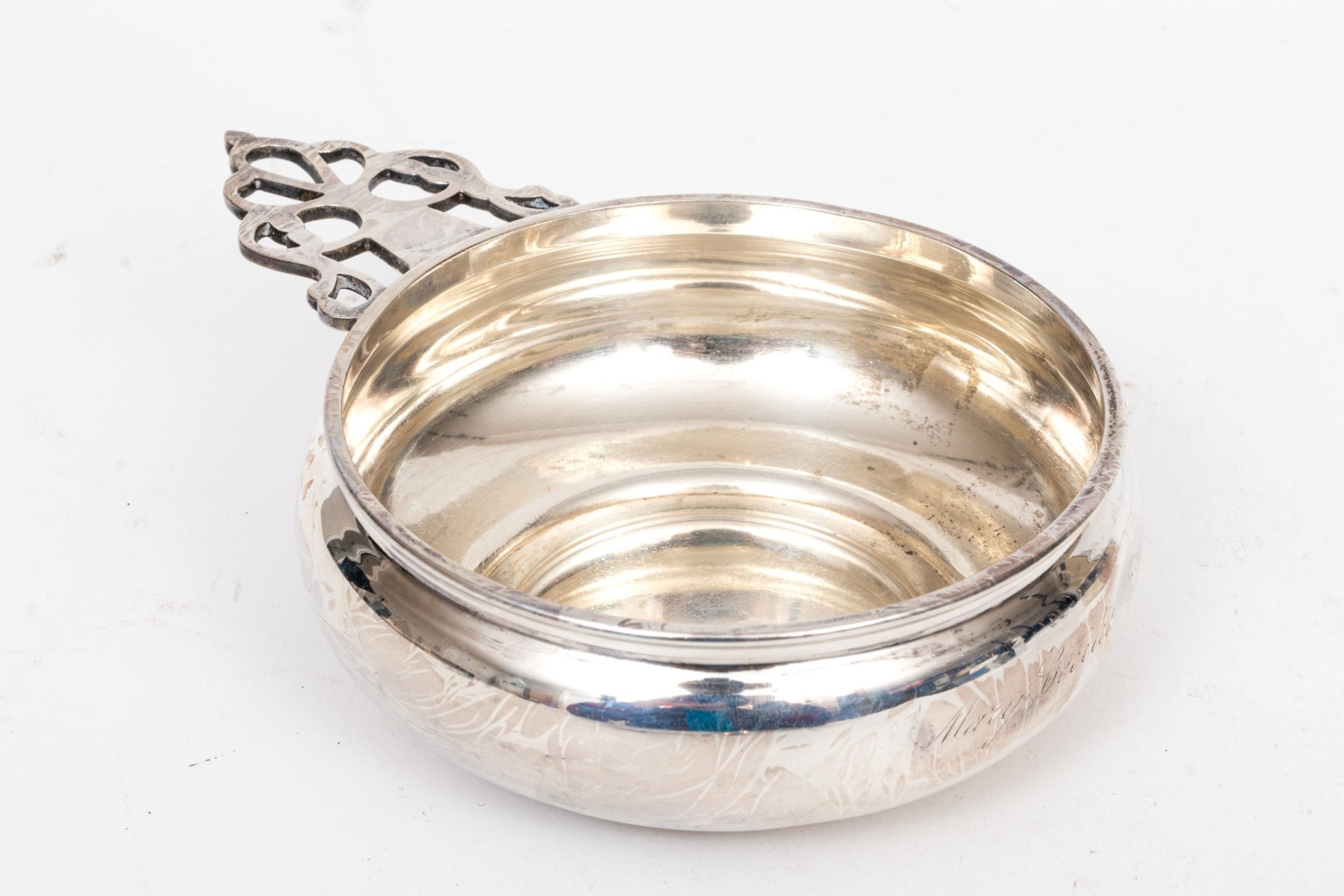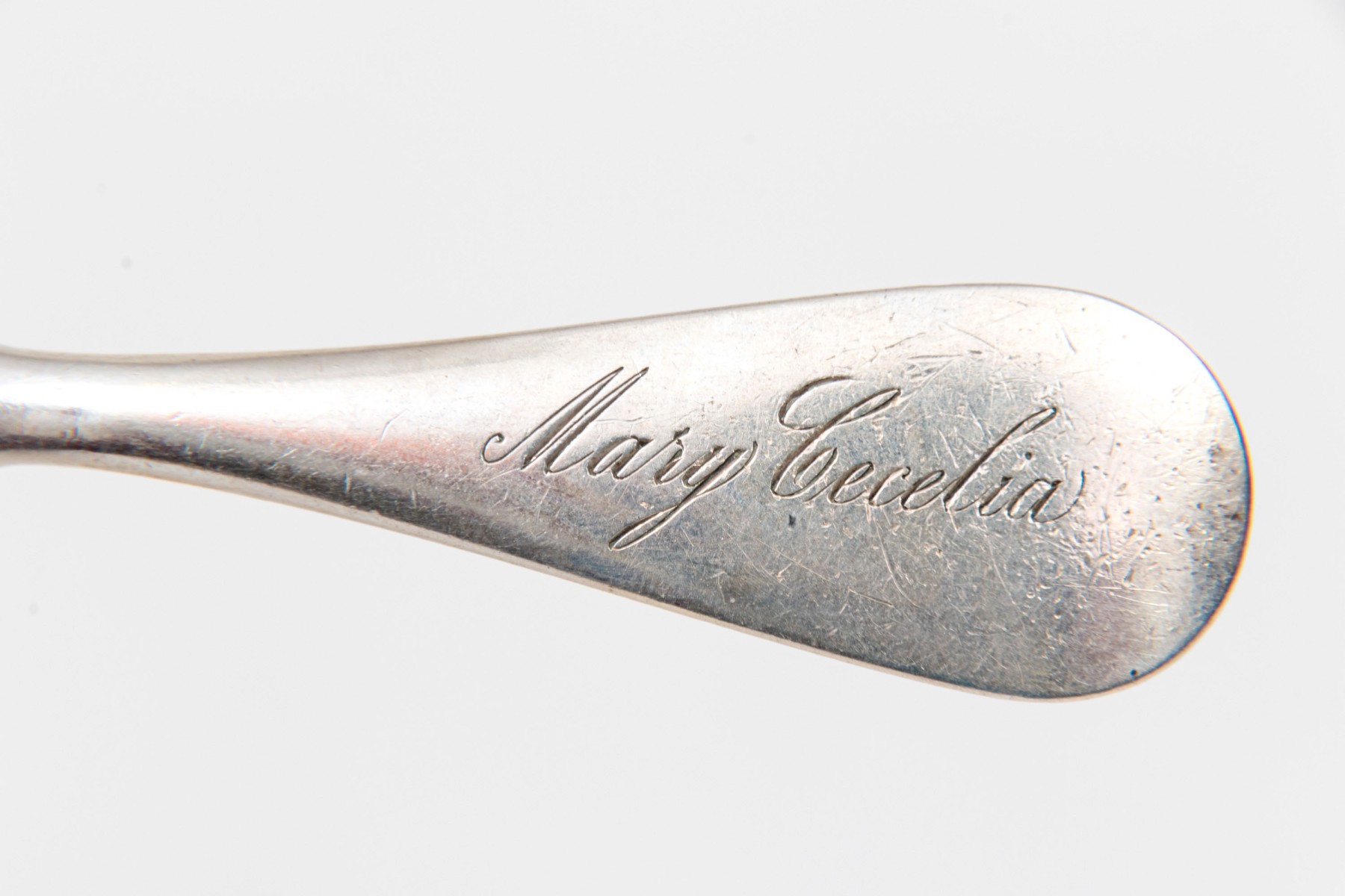 Group of sterling silver baby cup and bowl with spoon and fork. Polished finish and personalized engraving.