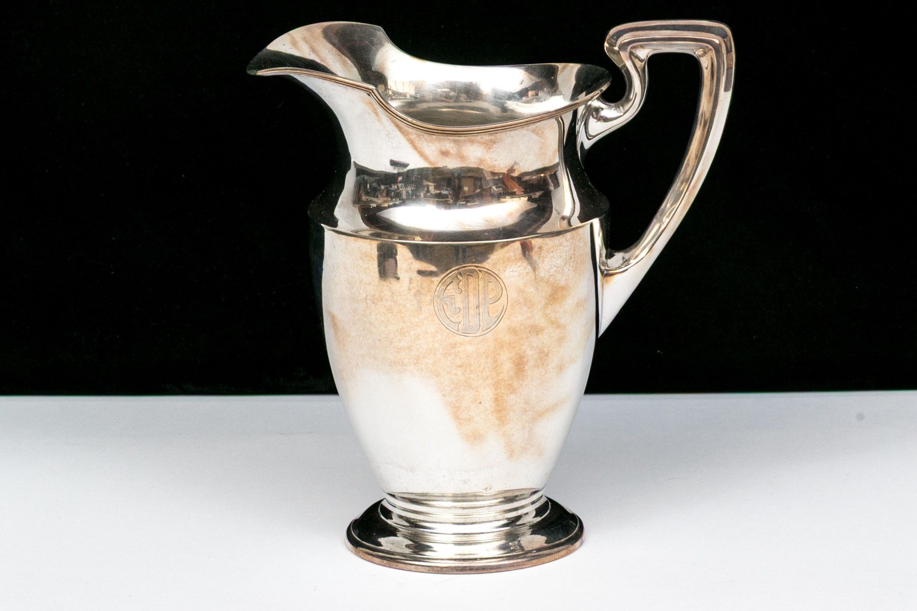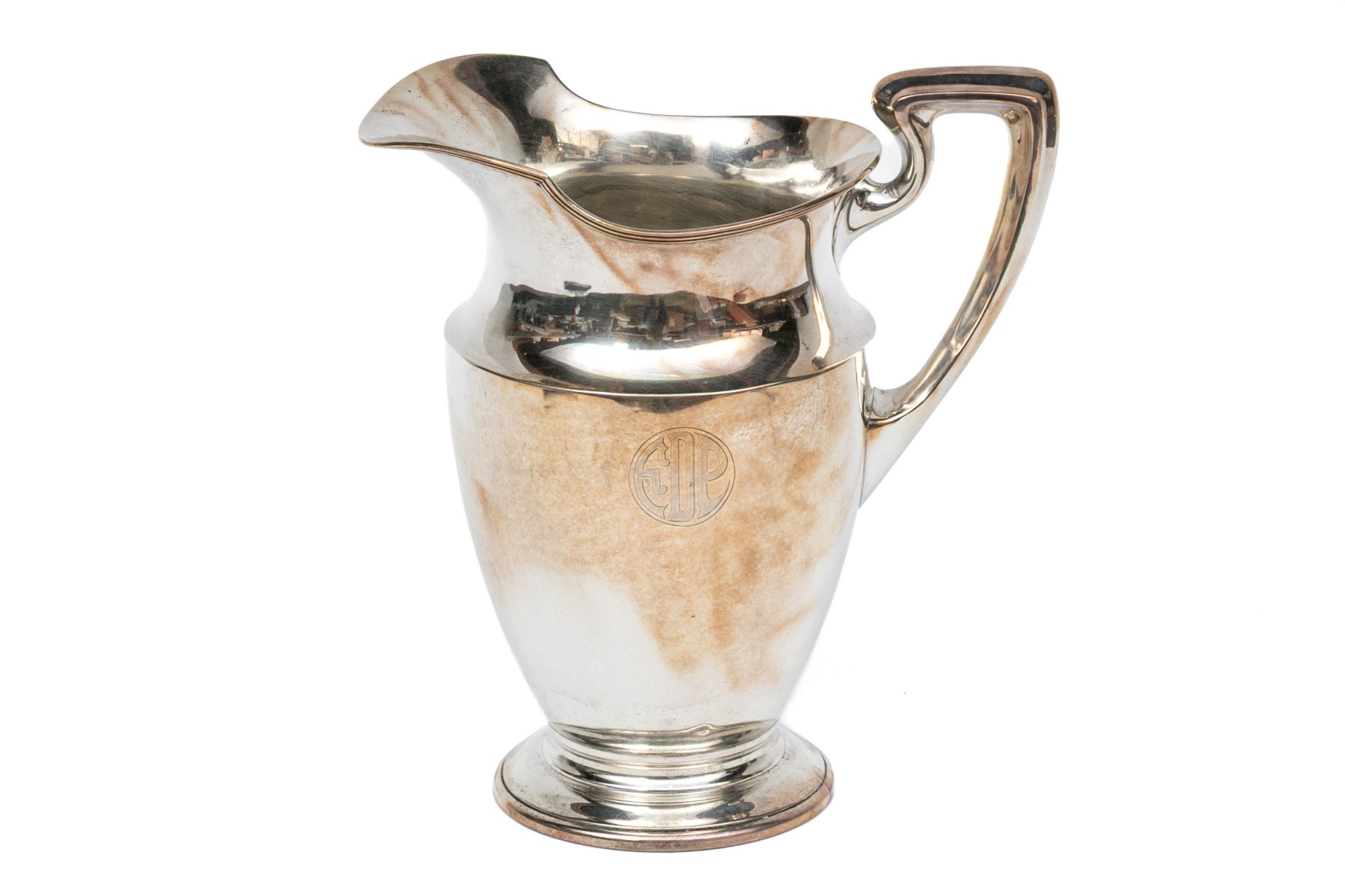 A fine helmet shaped 4 pint pitcher with angular handles and raised foot. Monogrammed.