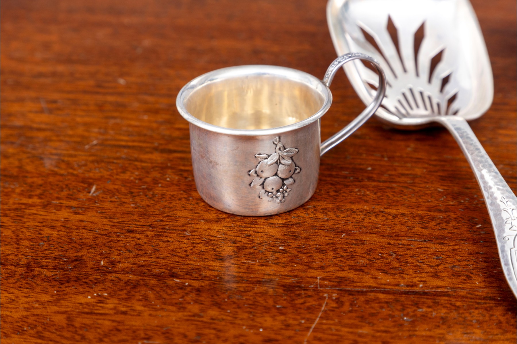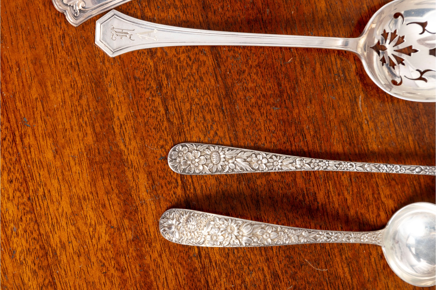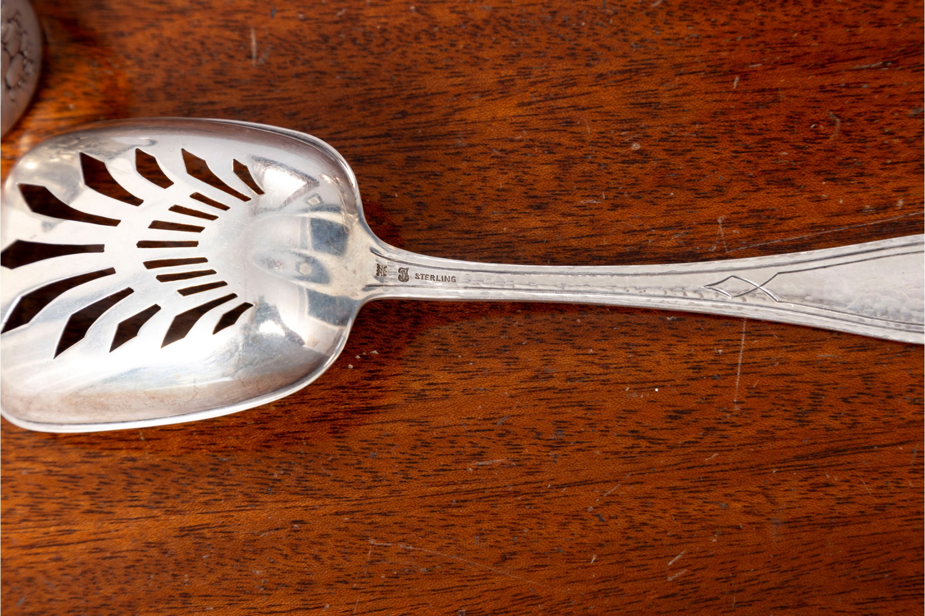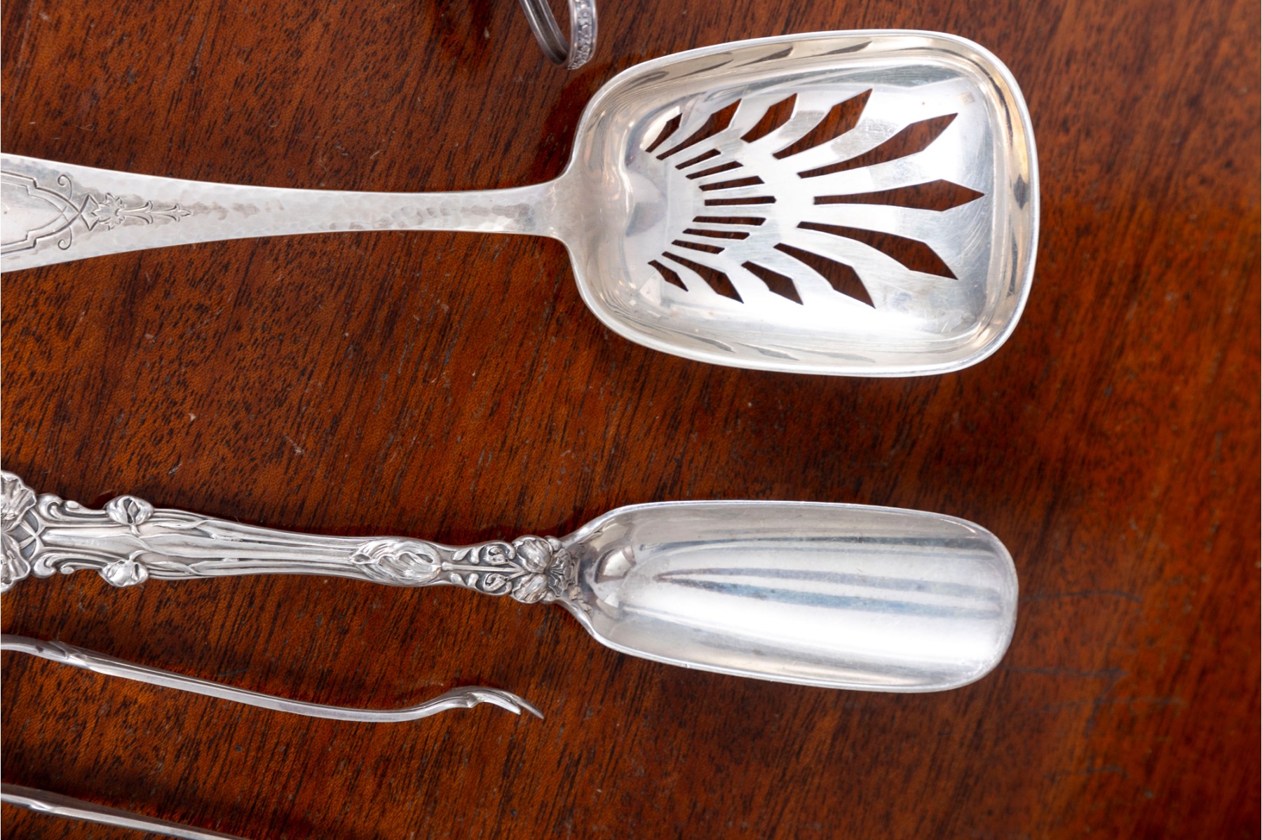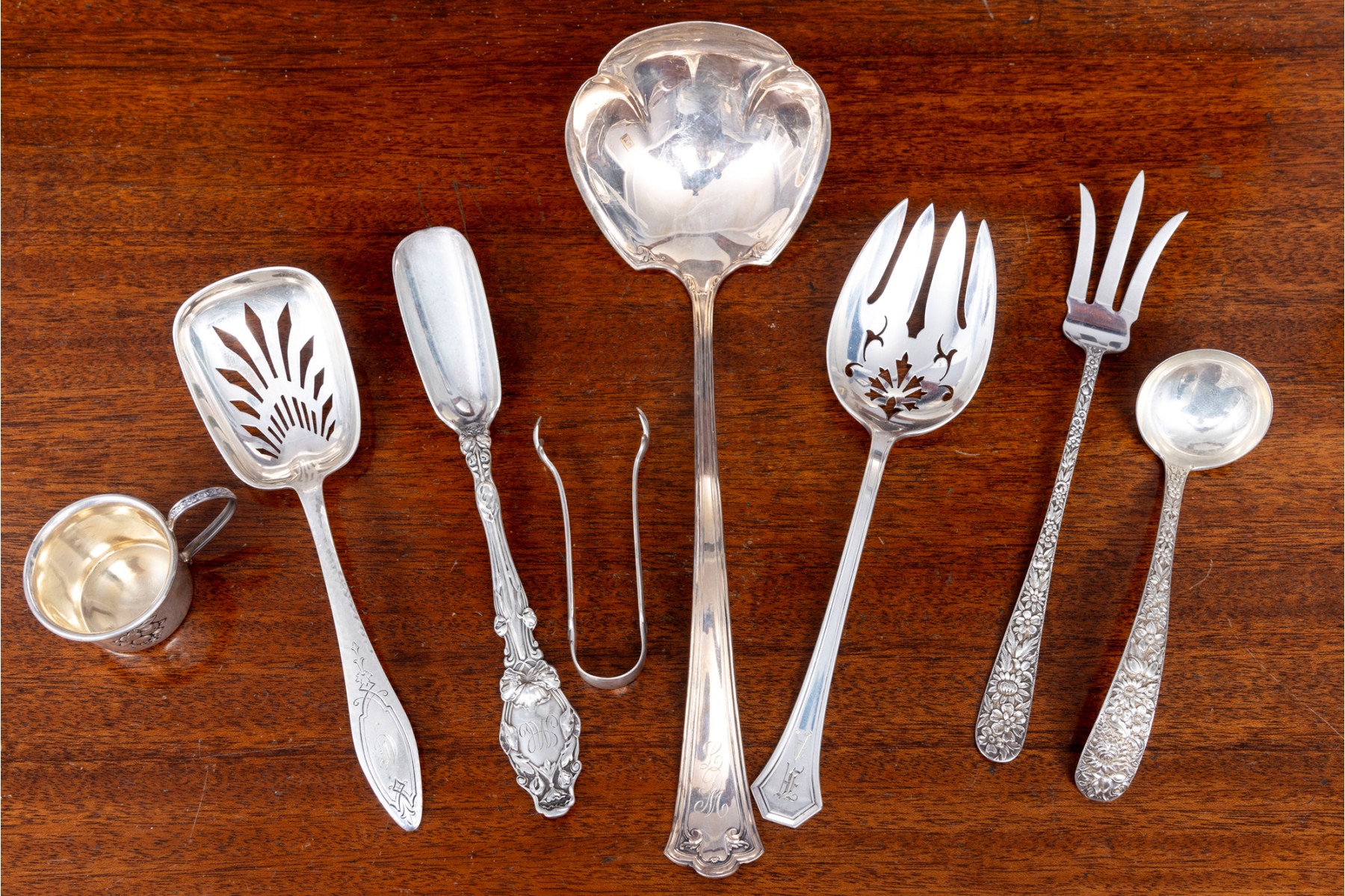 A small collection of eight antique sterling silver utensils & more from varying makers. Contents as shown. See photos for details.