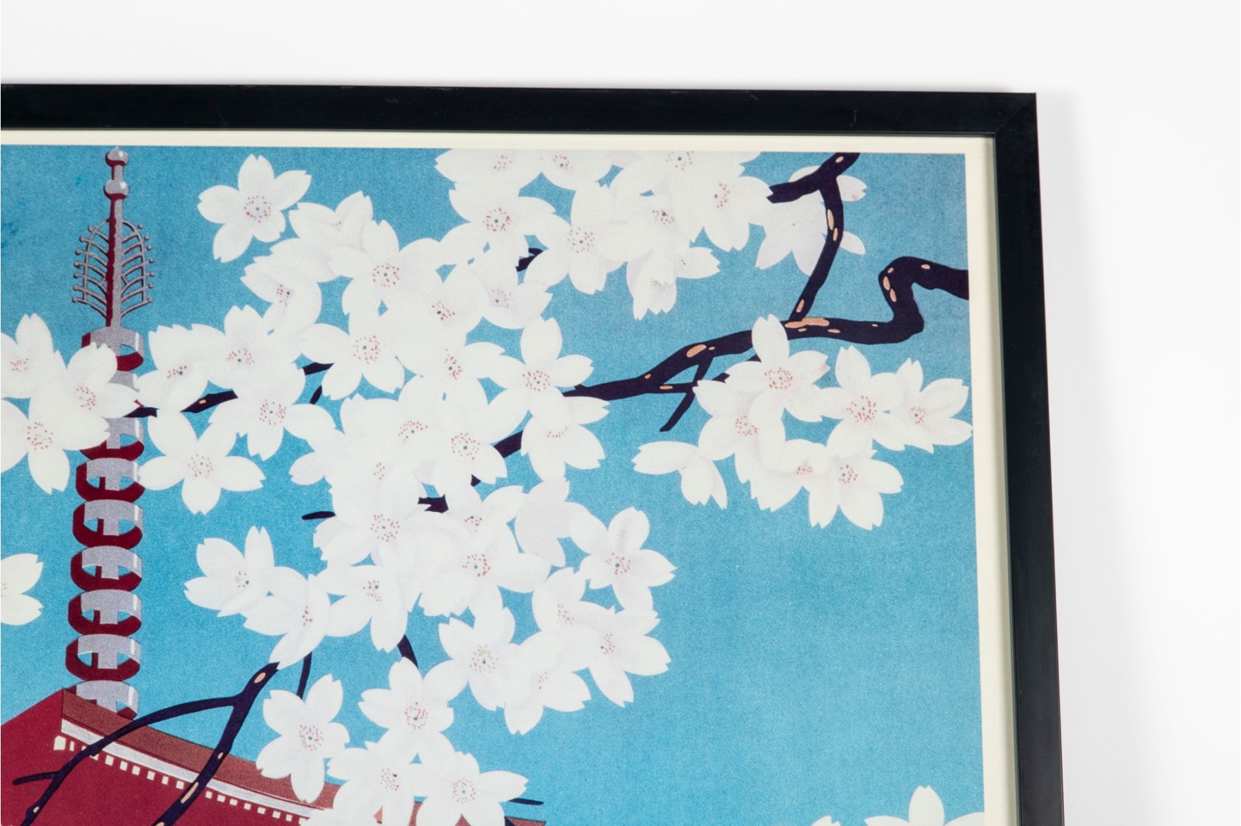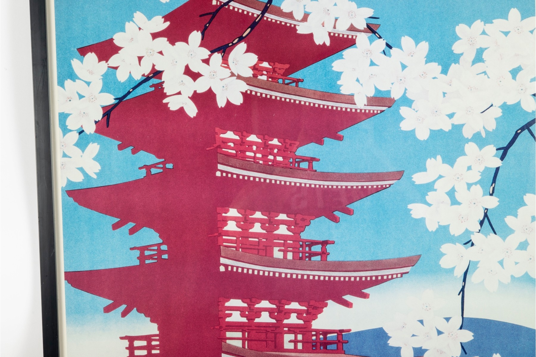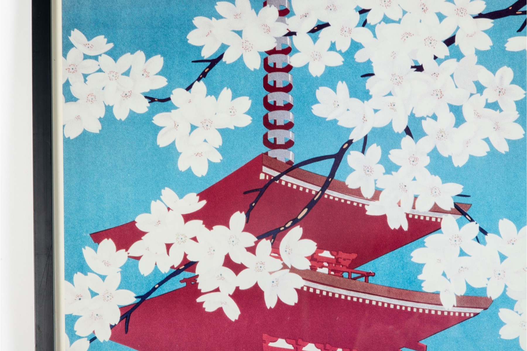 A striking vintage-style travel poster featuring a vivid red Japanese pagoda framed by blooming white cherry blossoms against a gradient blue sky. The bold, graphic composition captures the iconic imagery of Japan with a modernist touch.