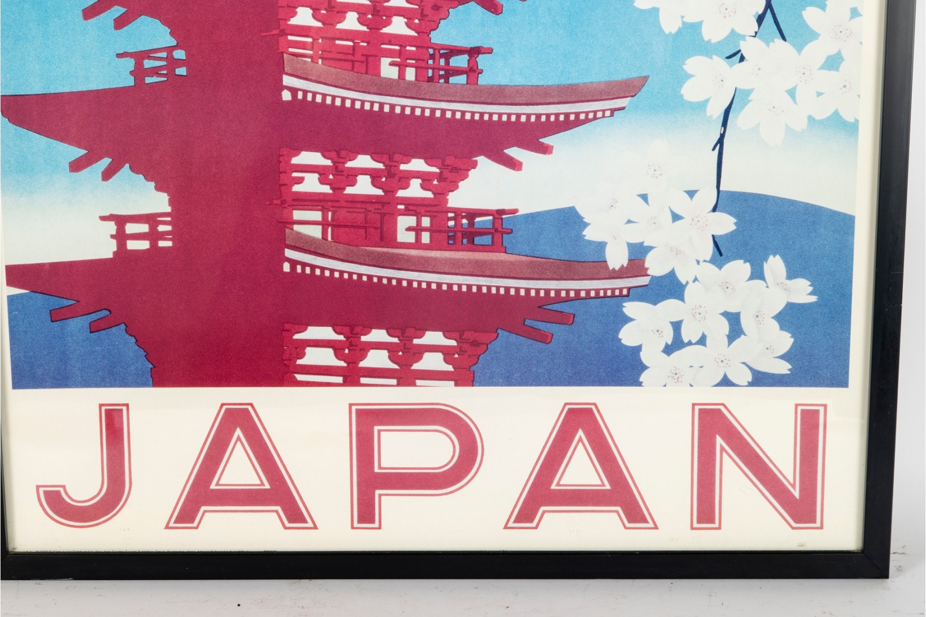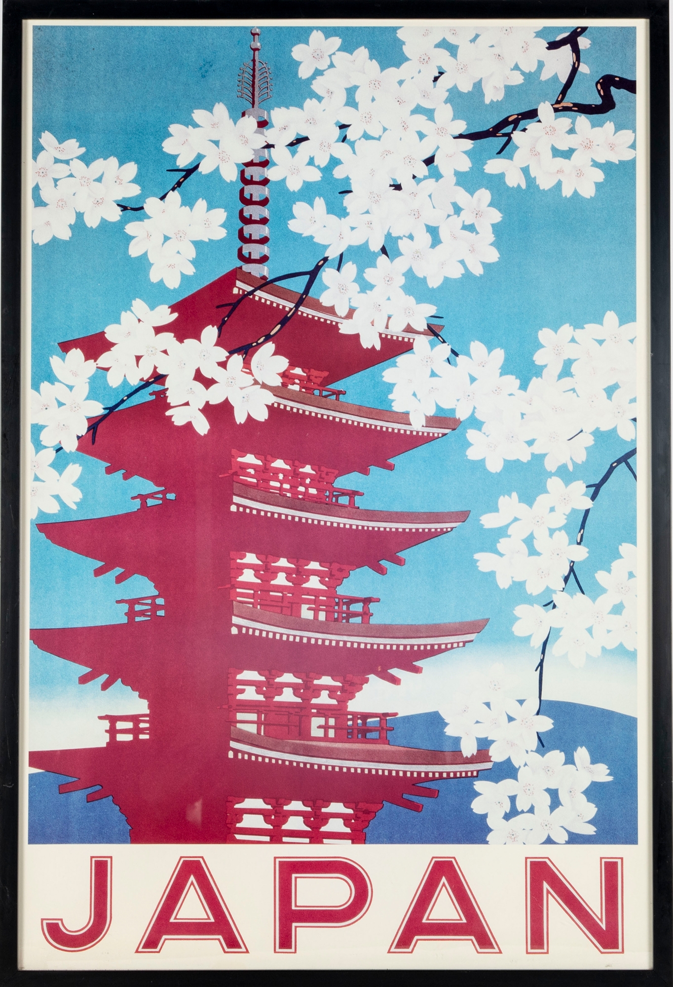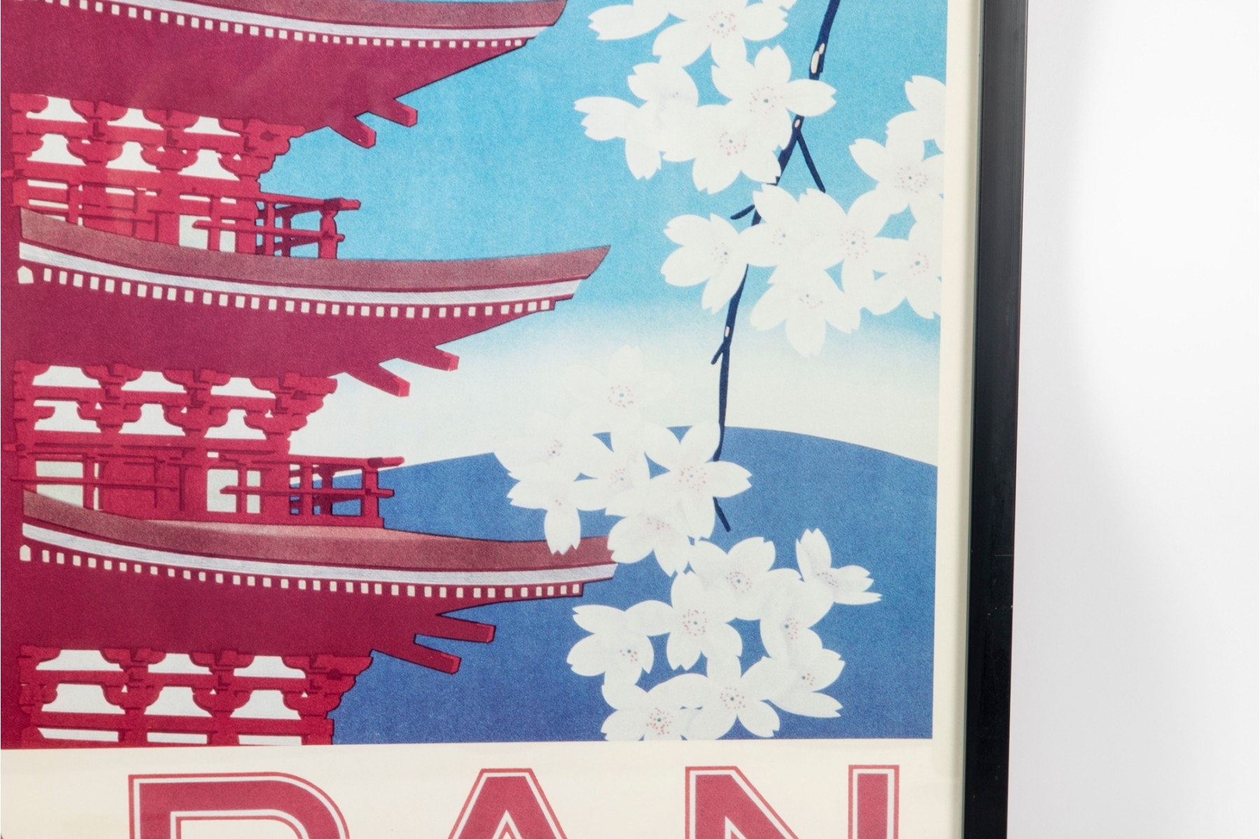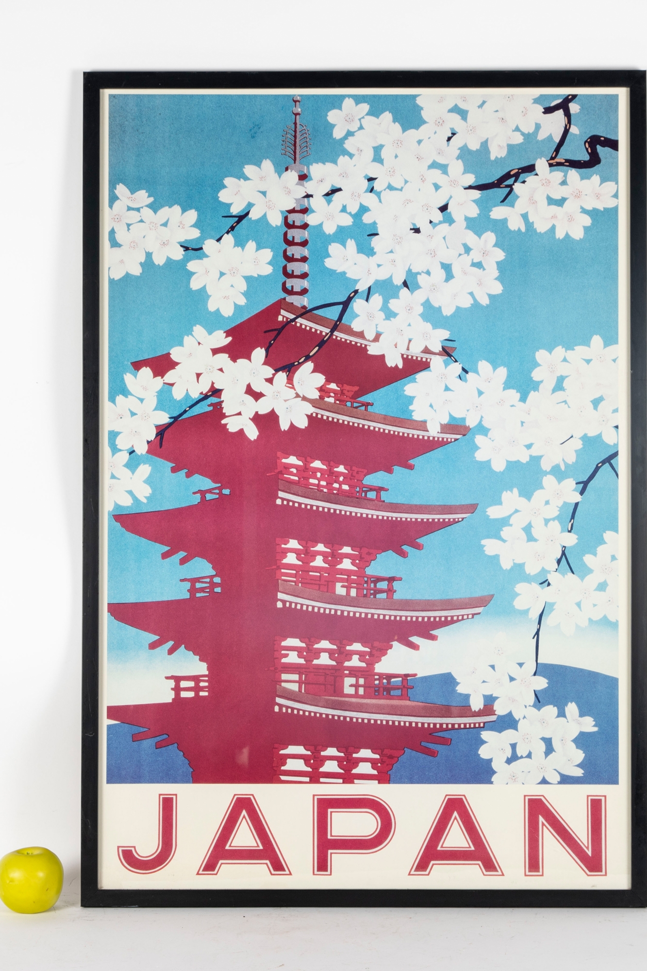A striking vintage-style travel poster featuring a vivid red Japanese pagoda framed by blooming white cherry blossoms against a gradient blue sky. The bold, graphic composition captures the iconic imagery of Japan with a modernist touch.