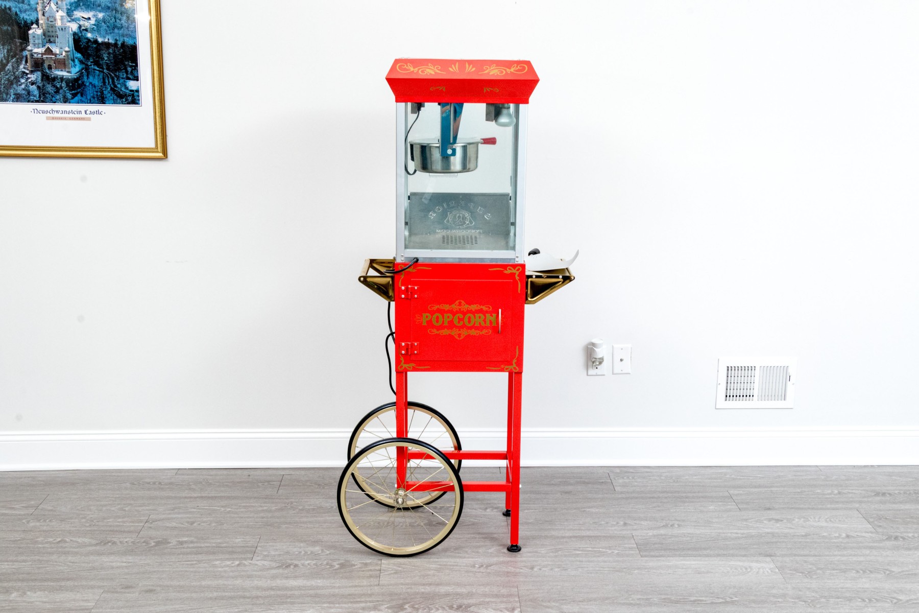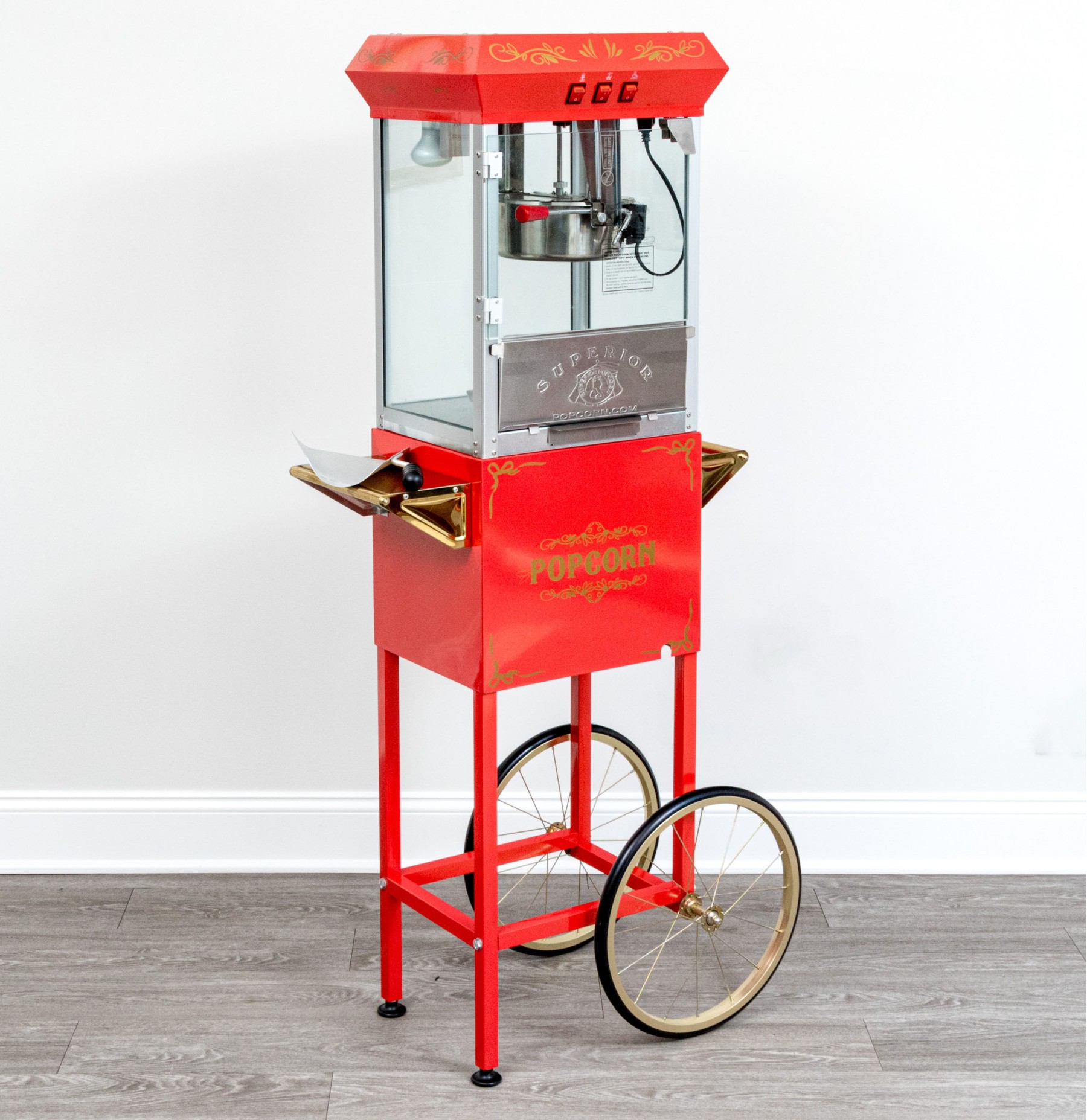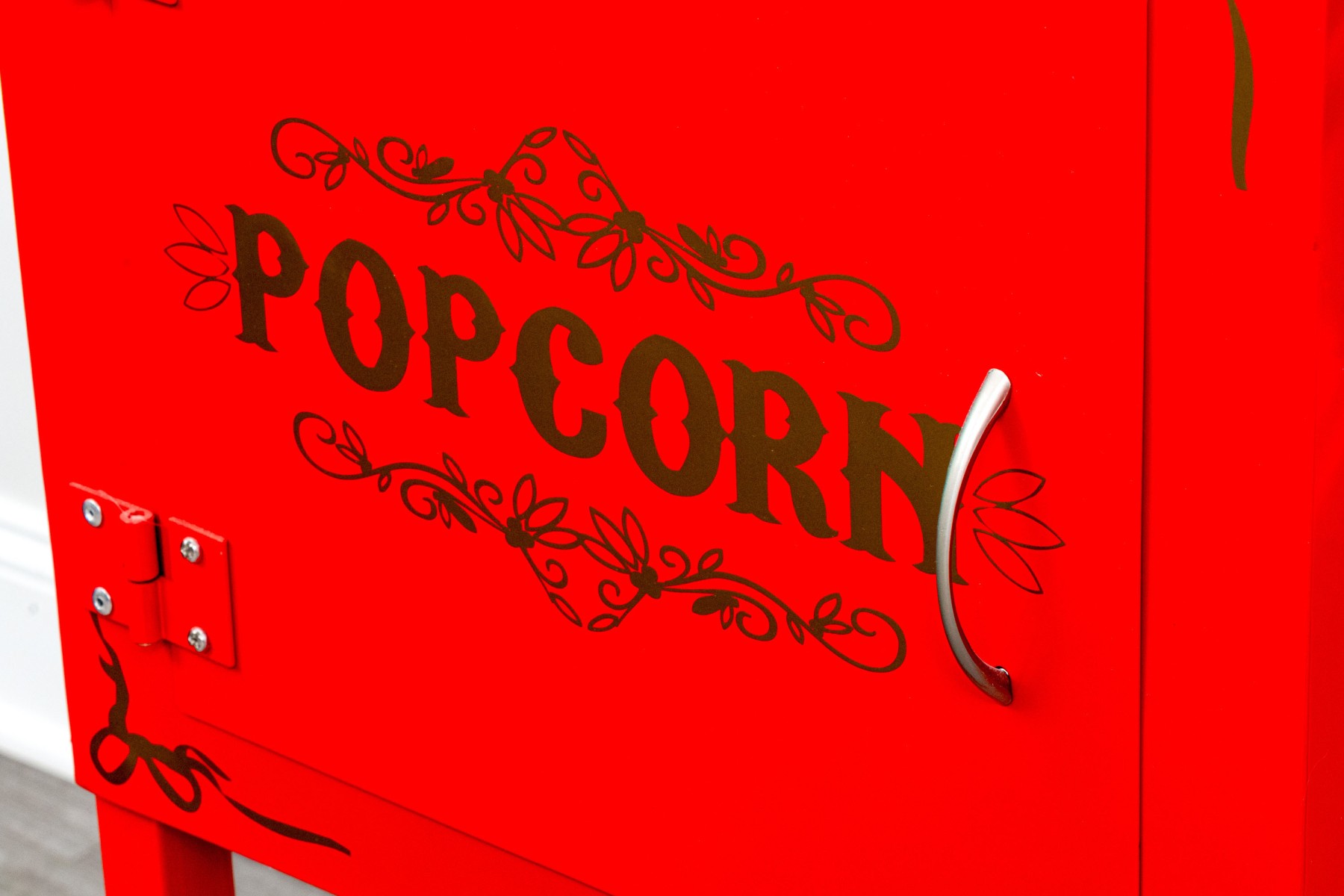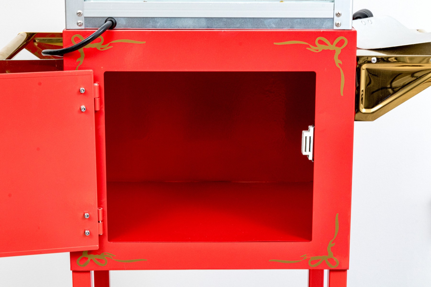 A fun, vintage Superior popcorn cart in classic form, featuring a vibrant red stainless steel frame with gilt embellishments. Features a three-switch design. A hinged door offers generous storage space. The cart is finished with oversized wheels for easy transport.