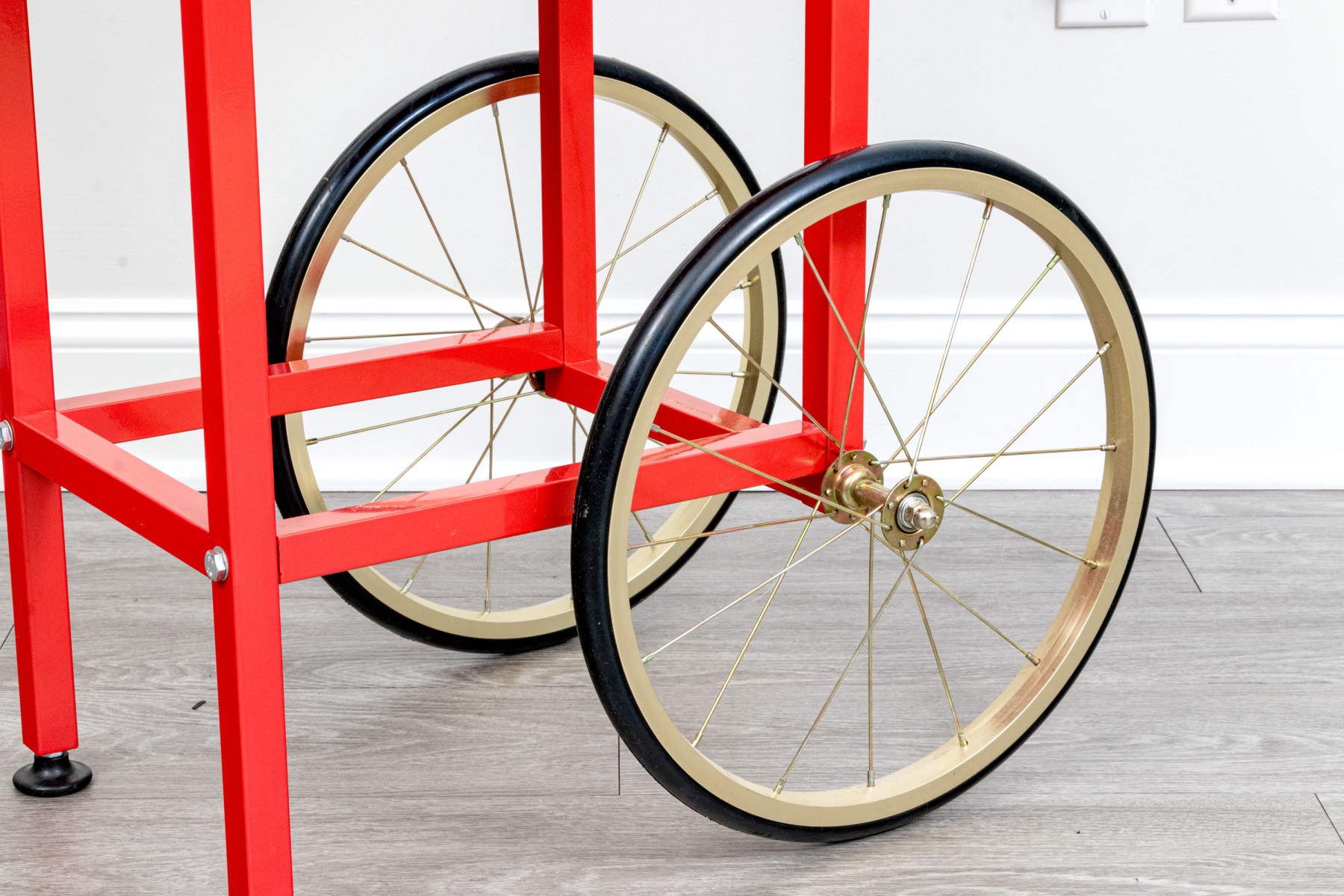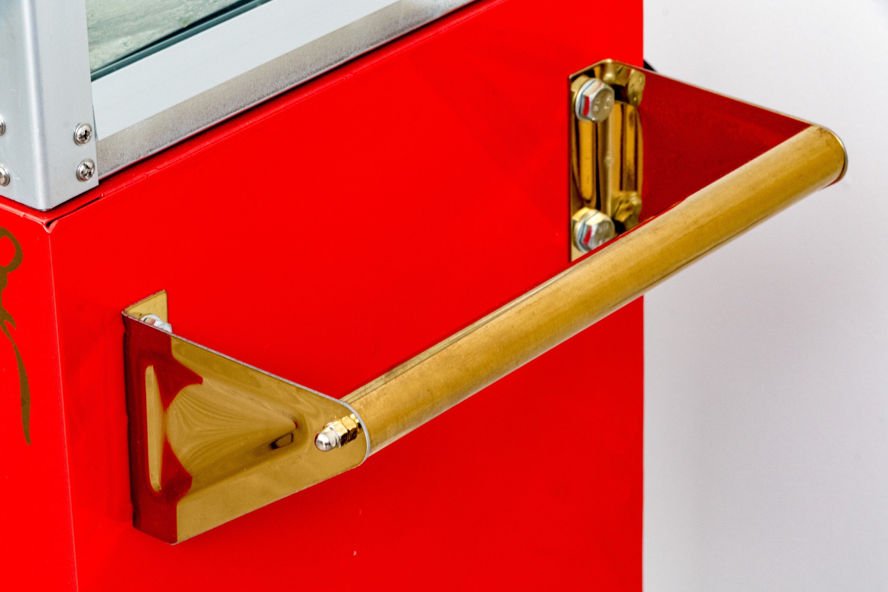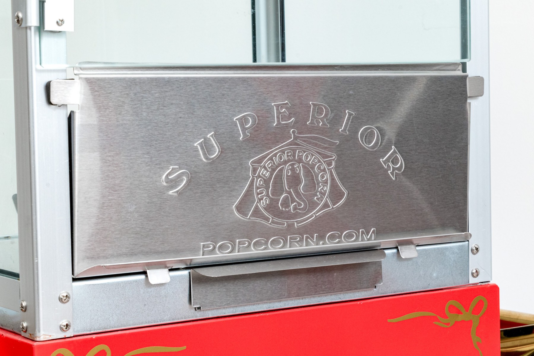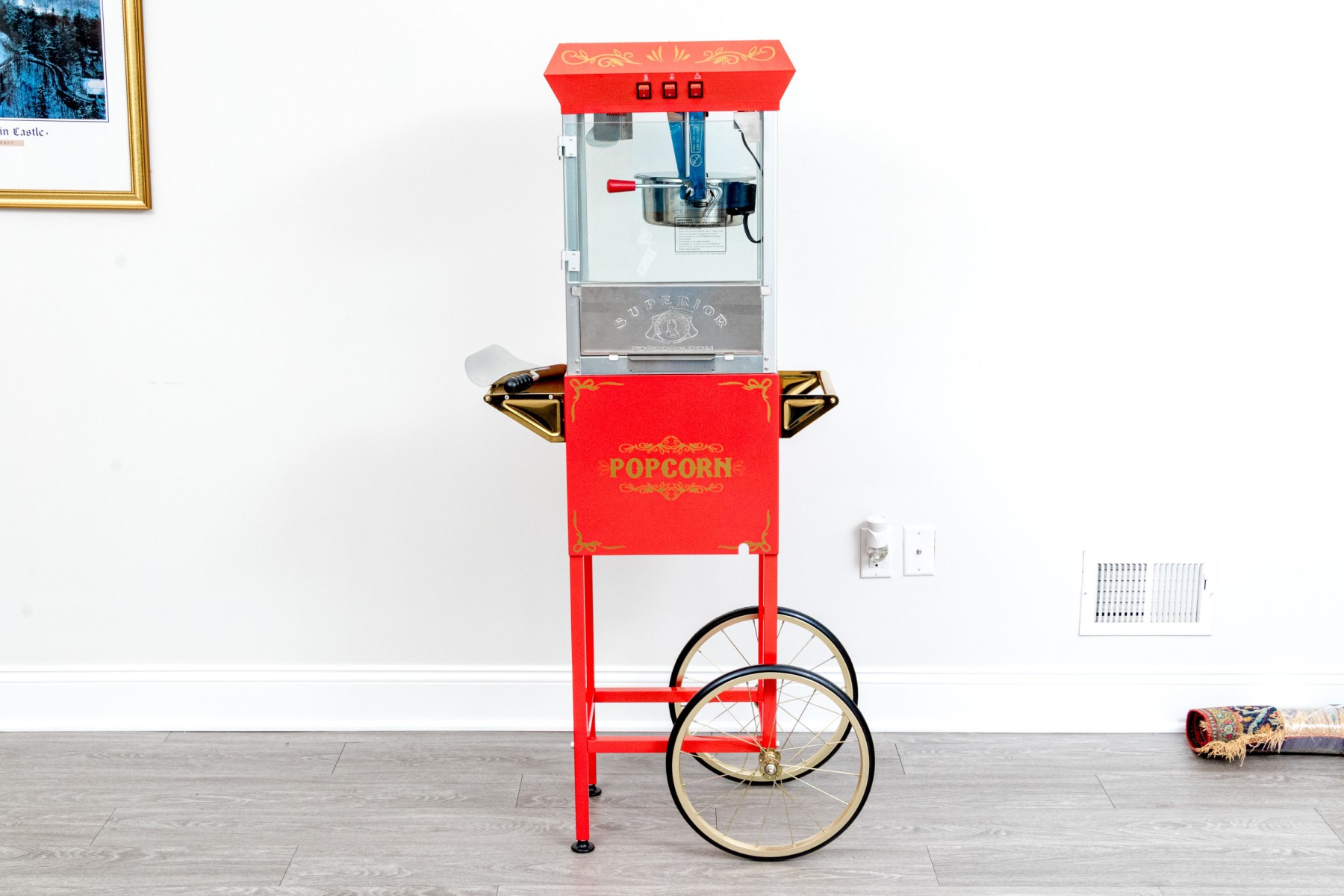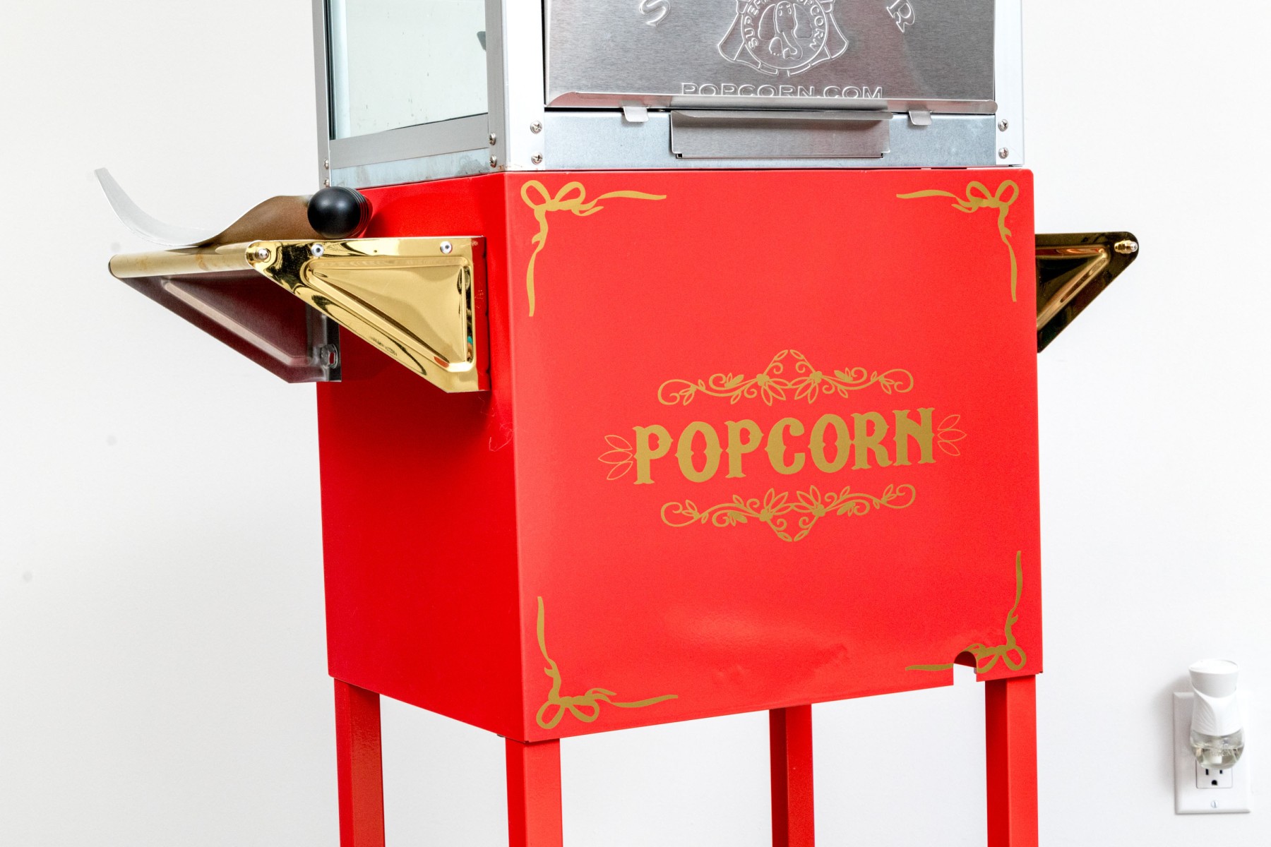 A fun, vintage Superior popcorn cart in classic form, featuring a vibrant red stainless steel frame with gilt embellishments. Features a three-switch design. A hinged door offers generous storage space. The cart is finished with oversized wheels for easy transport.