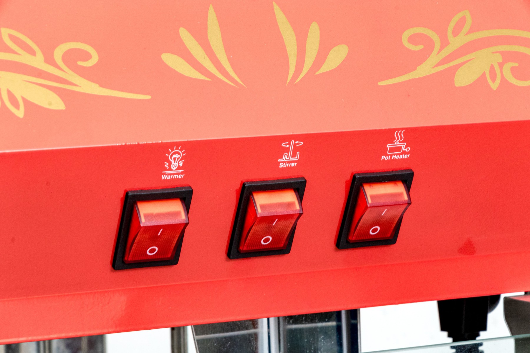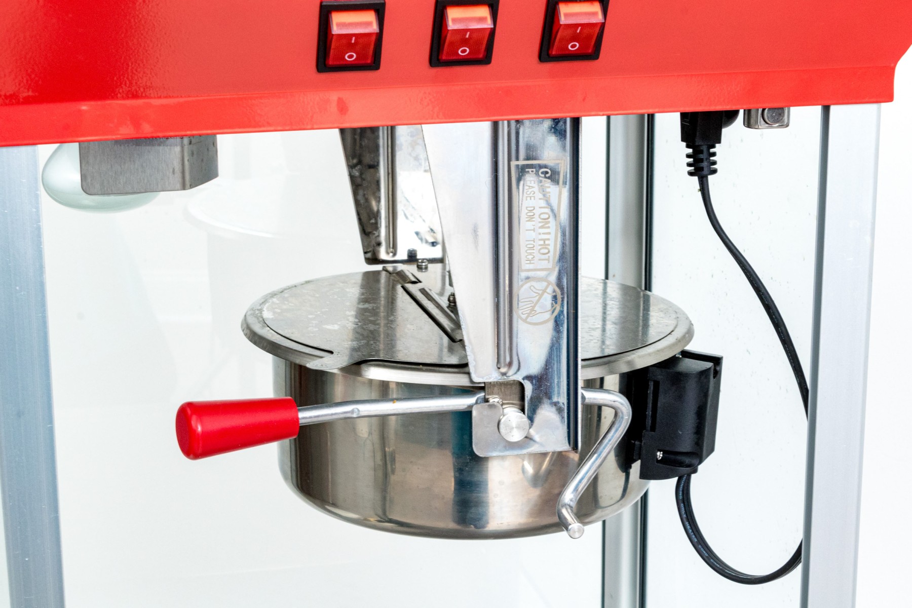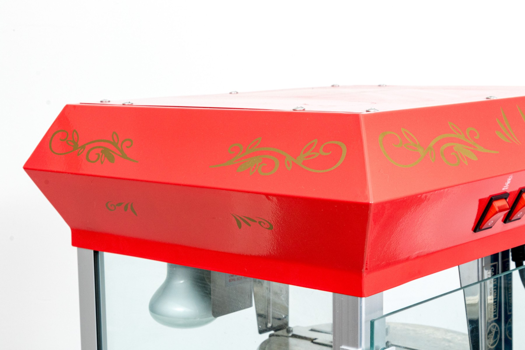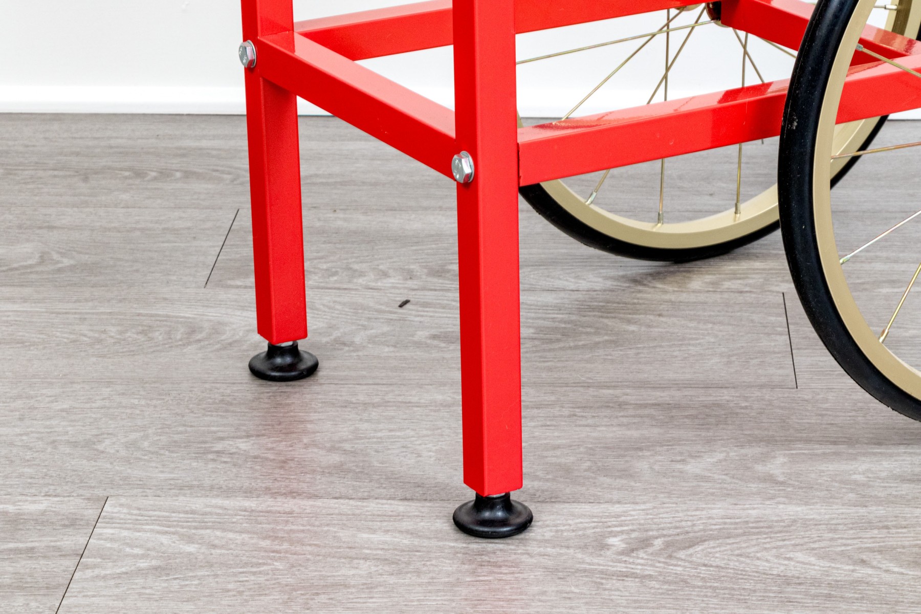 A fun, vintage Superior popcorn cart in classic form, featuring a vibrant red stainless steel frame with gilt embellishments. Features a three-switch design. A hinged door offers generous storage space. The cart is finished with oversized wheels for easy transport.