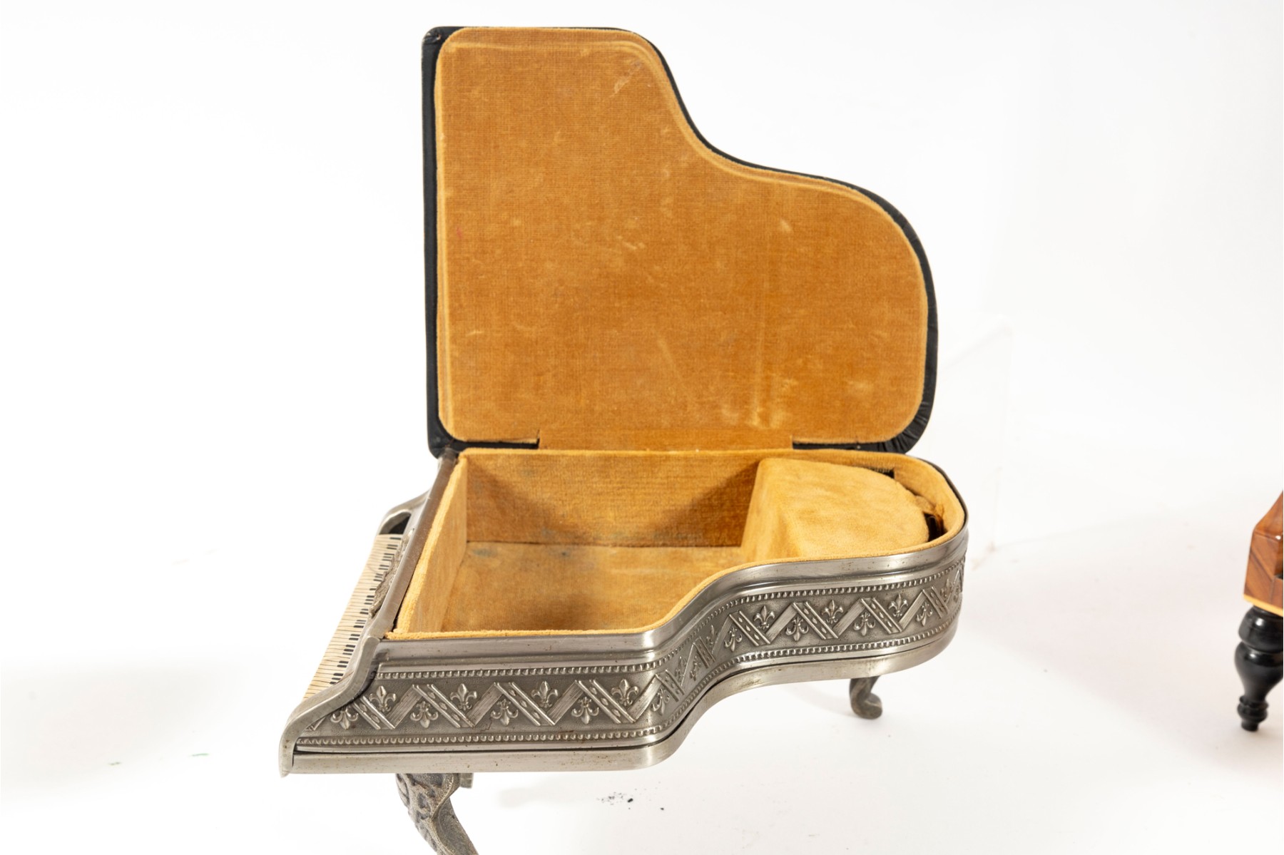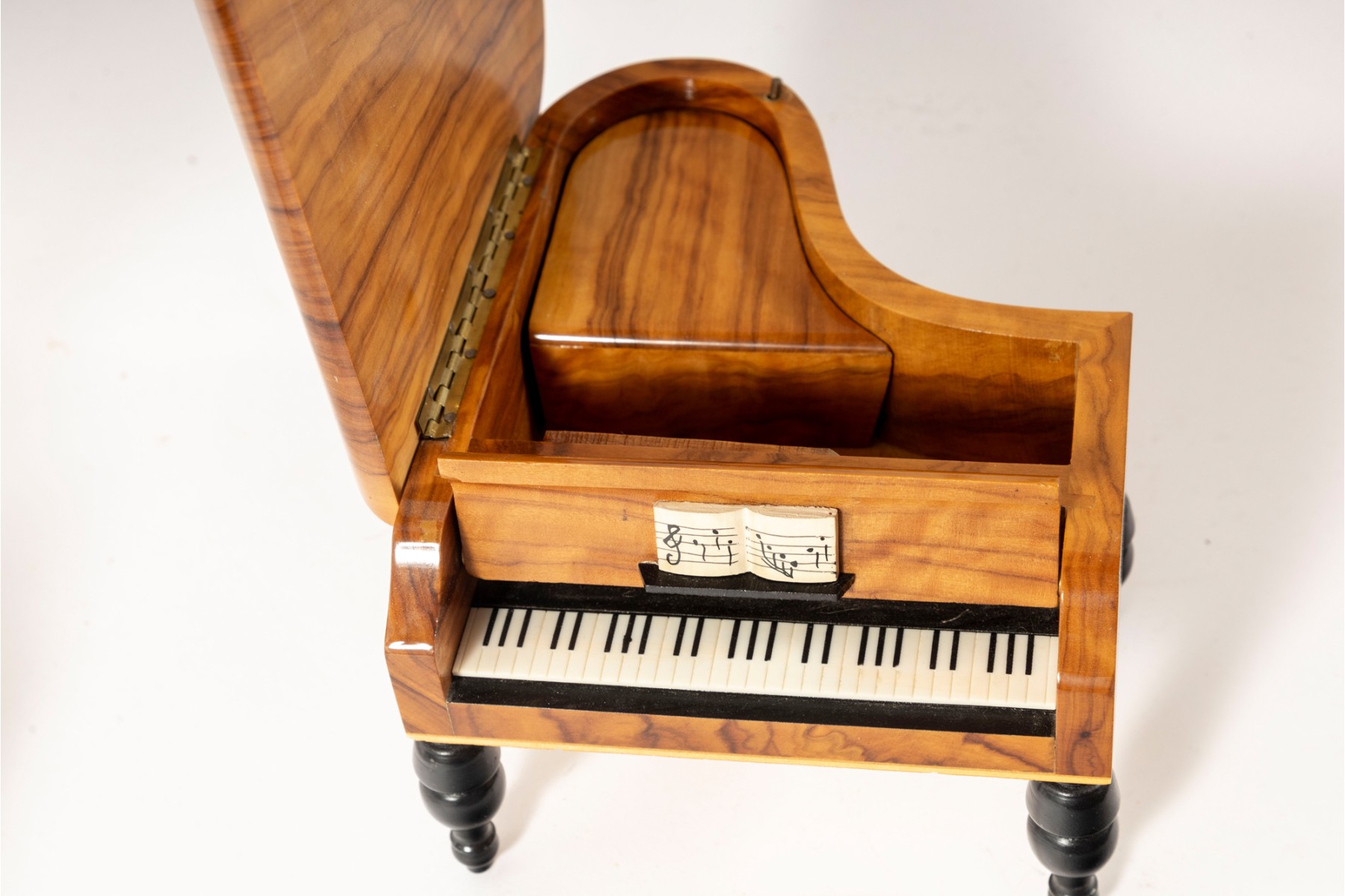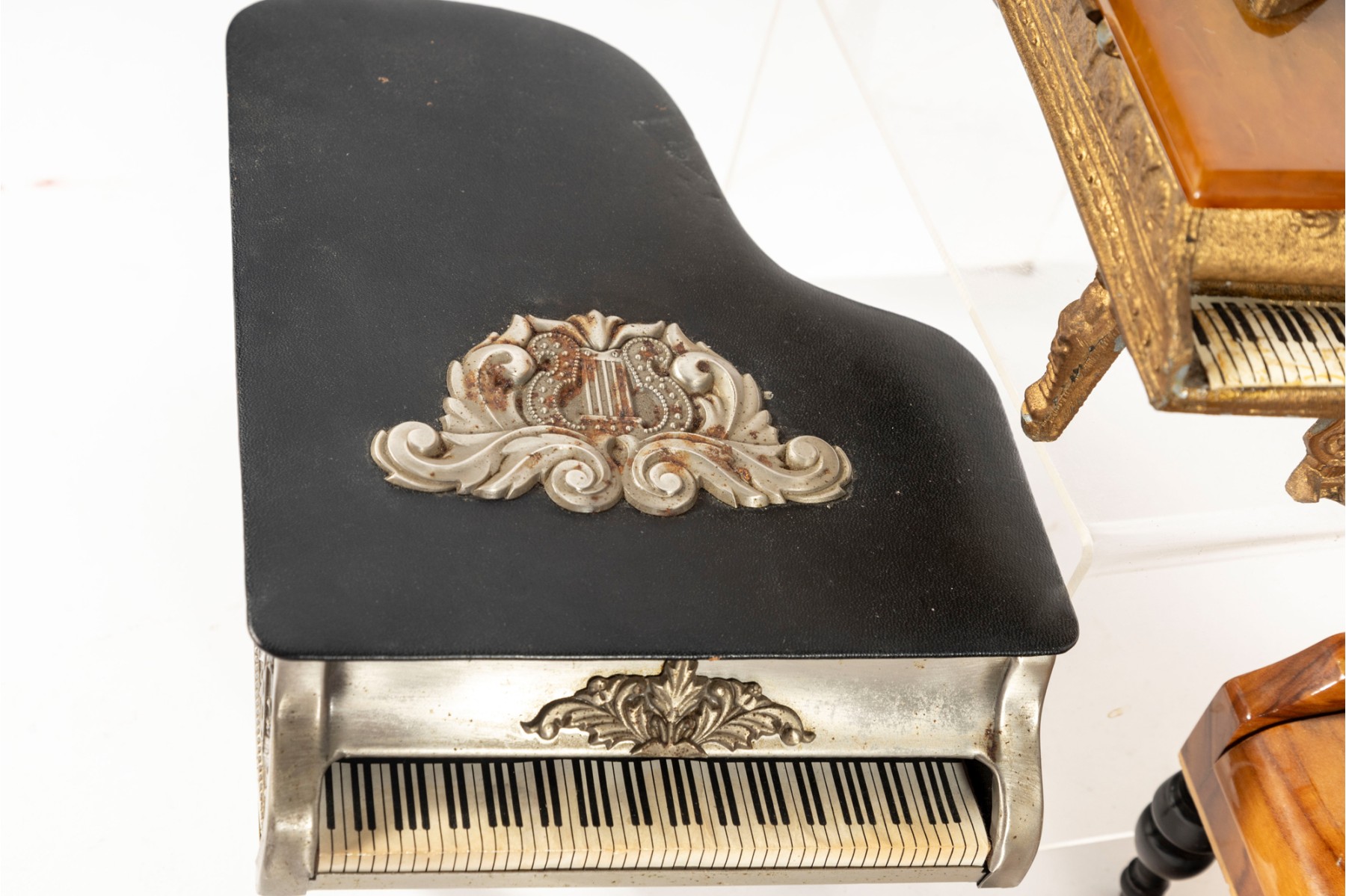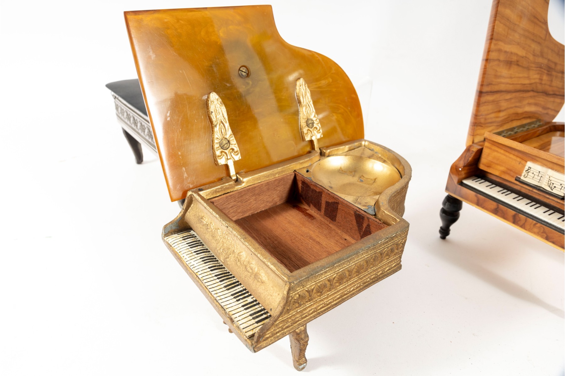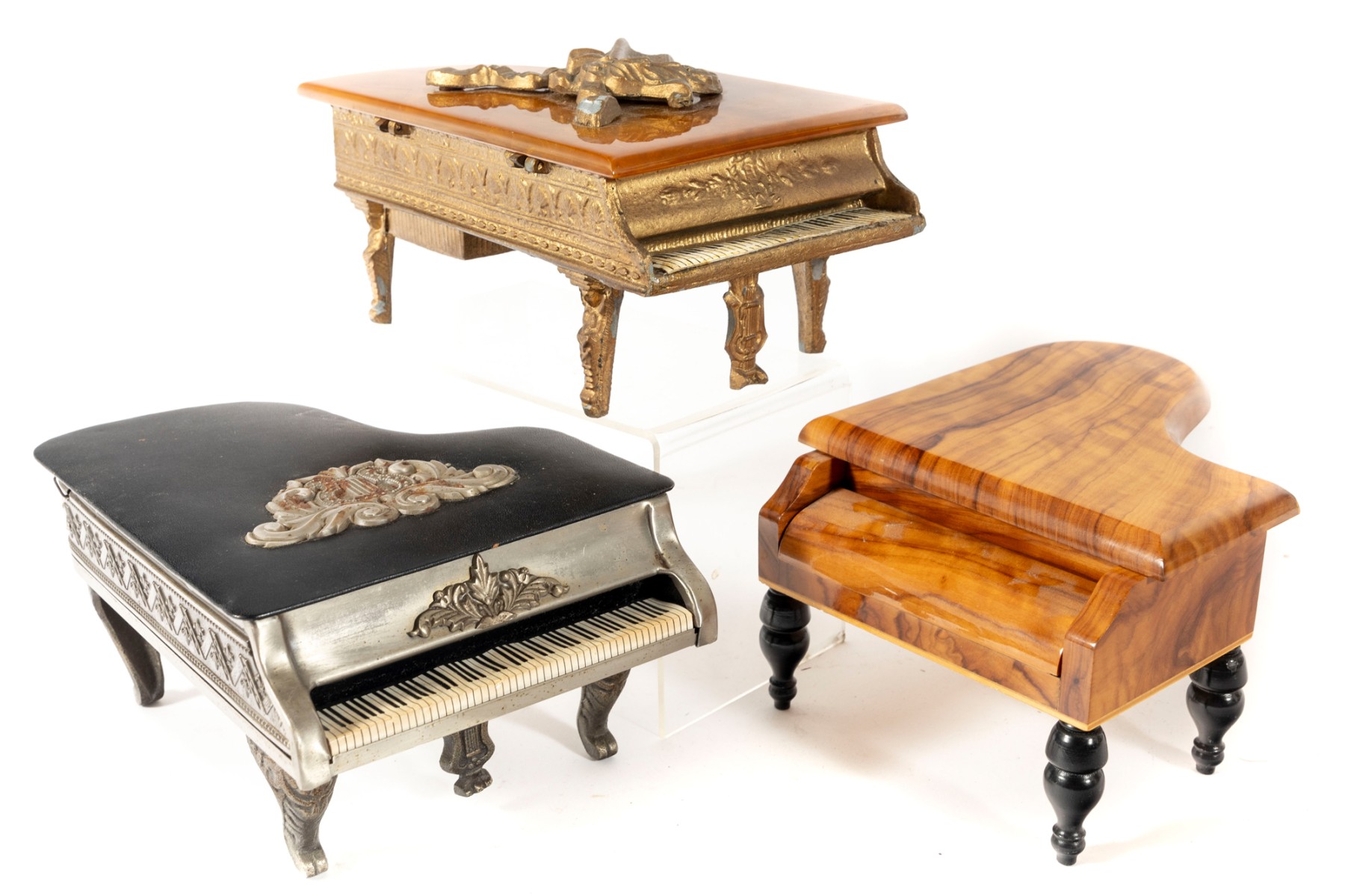A trio of miniature piano music boxes -- all of which feature Reuge's "Romance" Swiss movement mechanism. All pianos have hinged covers, doubling as trinket boxes.