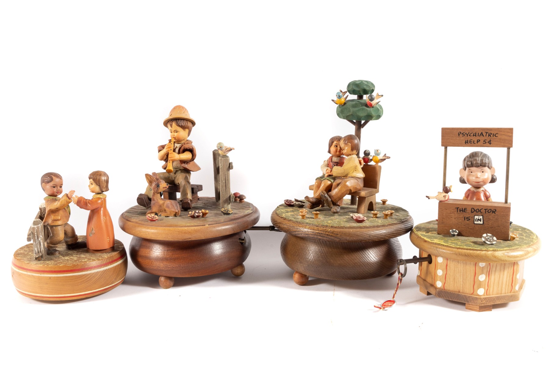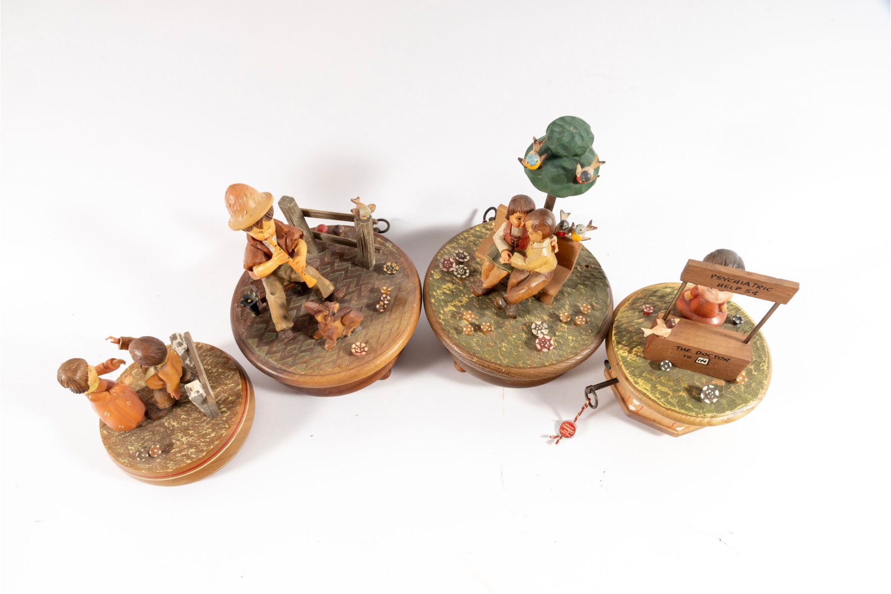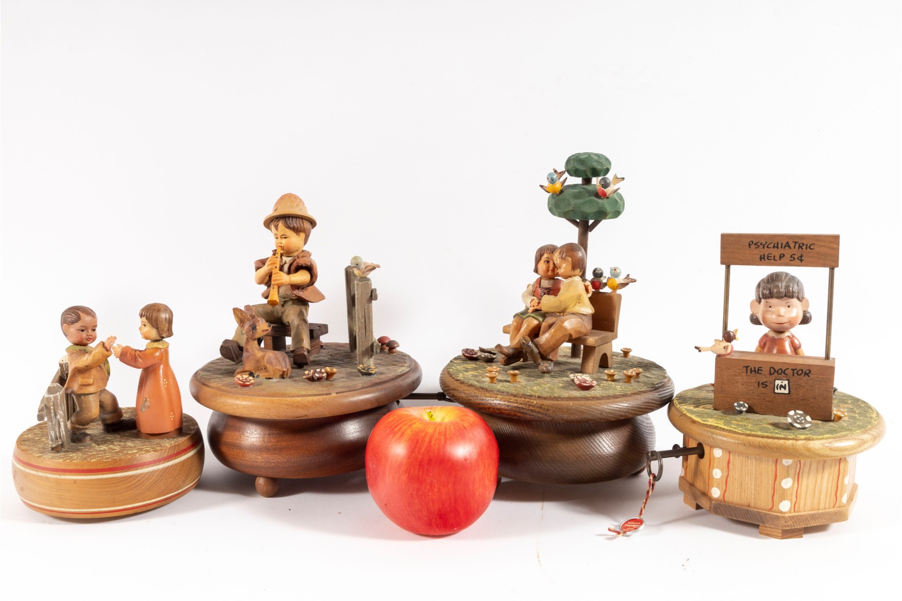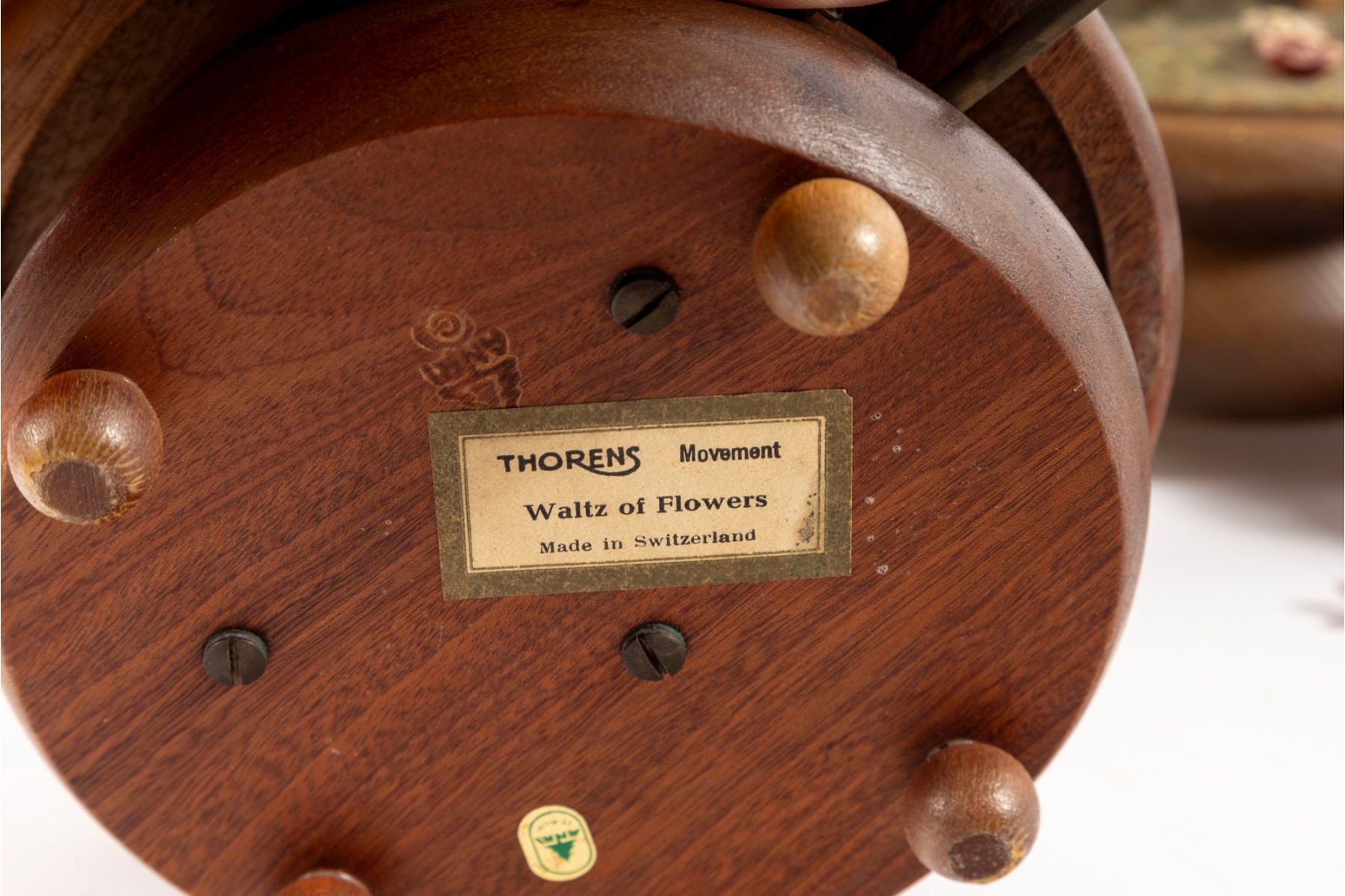 A set of four vintage Swiss Thorens woodcraft music boxes which spin upon activation. Each one is unique, sporting different whimsical scenes with hand-painted details. Four in total.