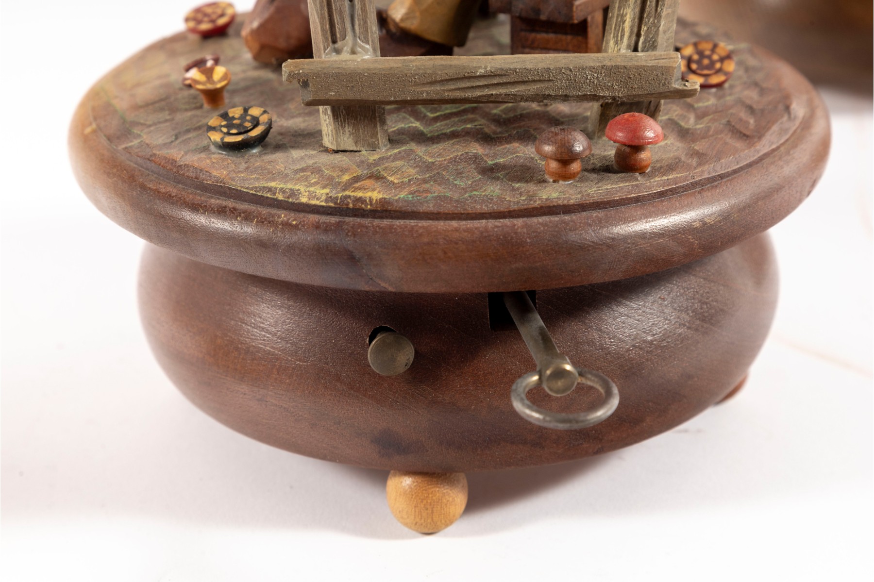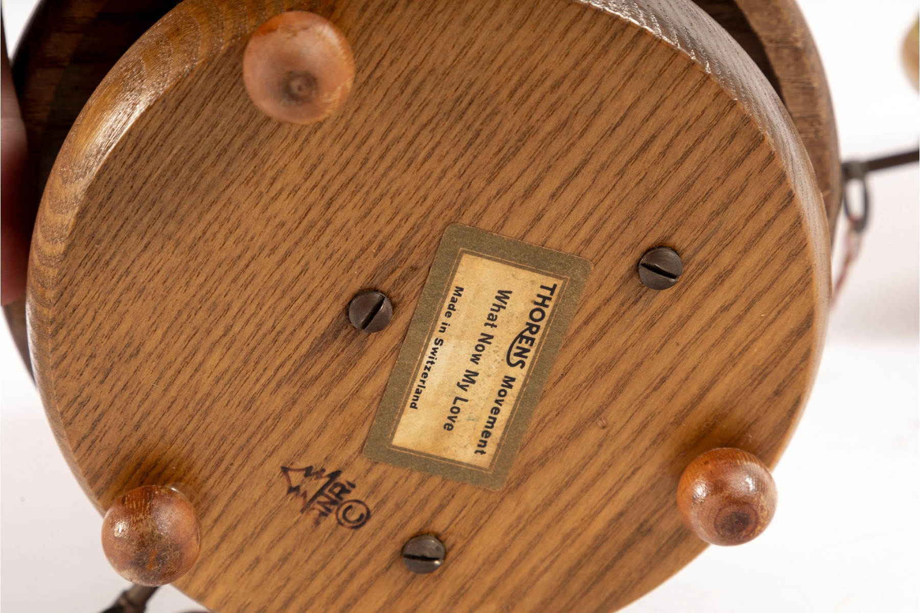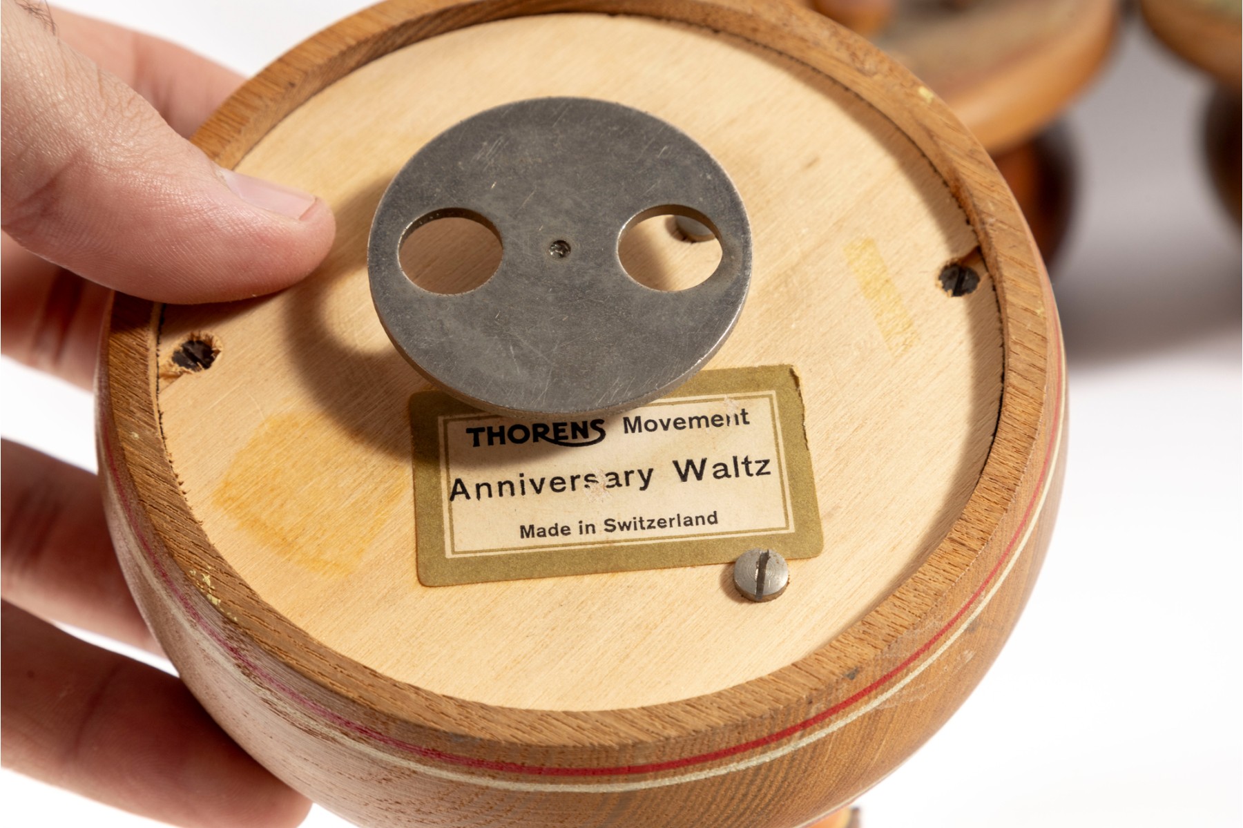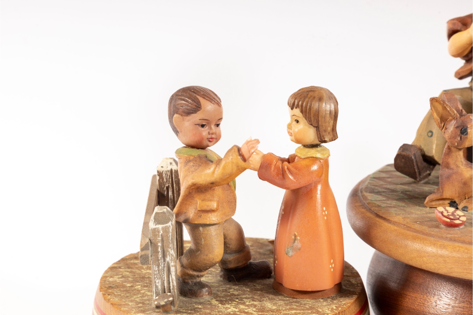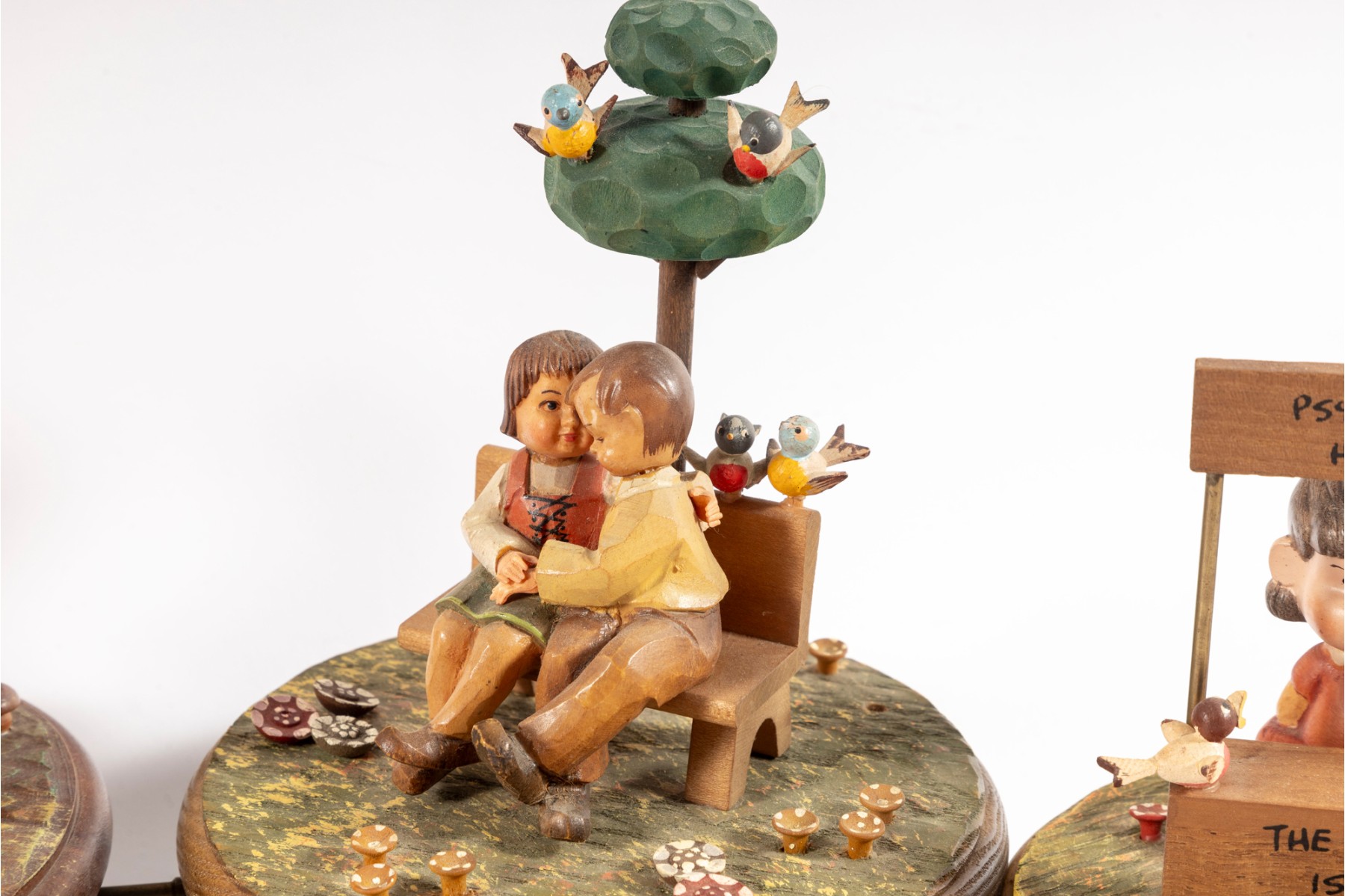 A set of four vintage Swiss Thorens woodcraft music boxes which spin upon activation. Each one is unique, sporting different whimsical scenes with hand-painted details. Four in total.