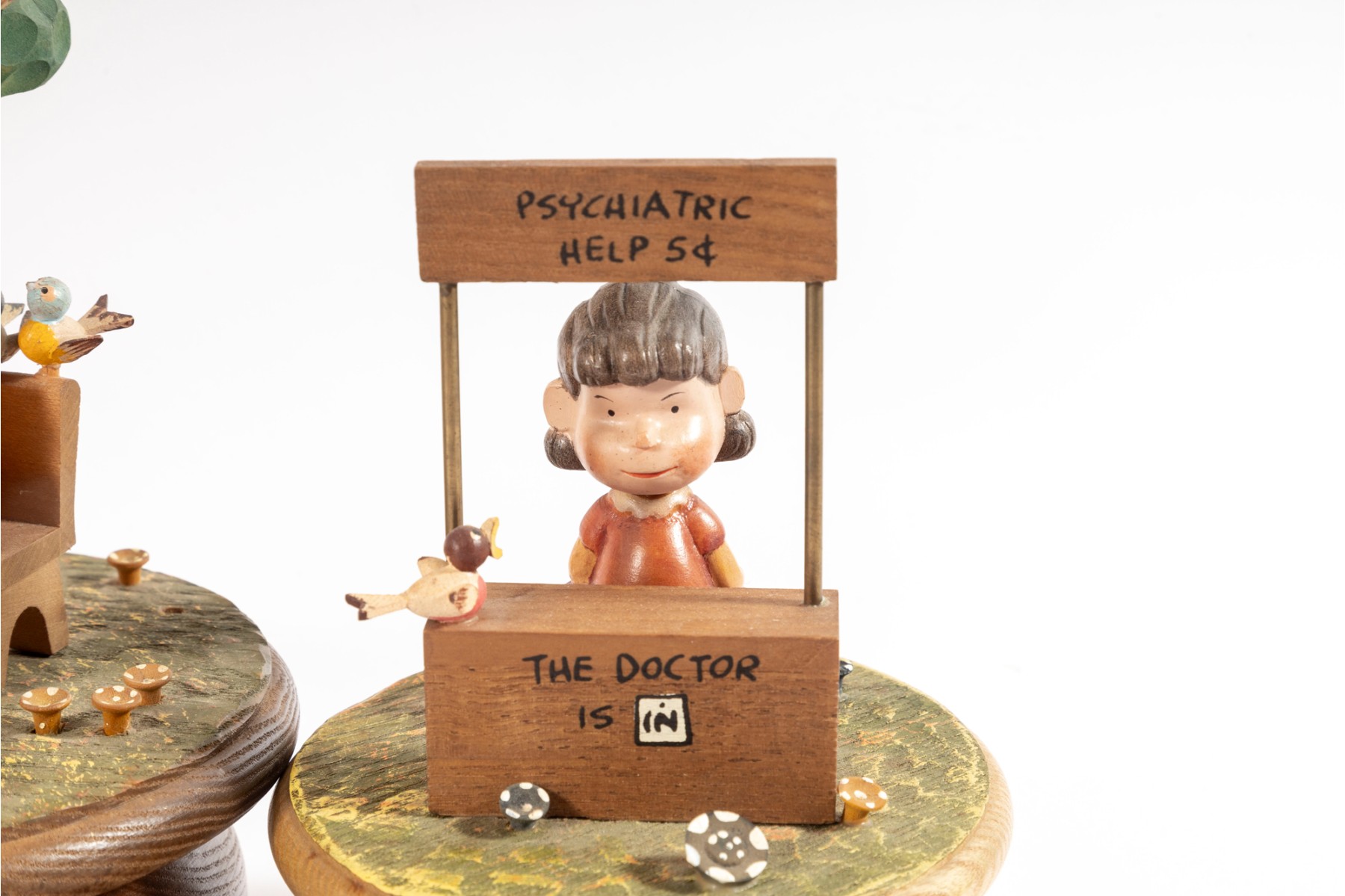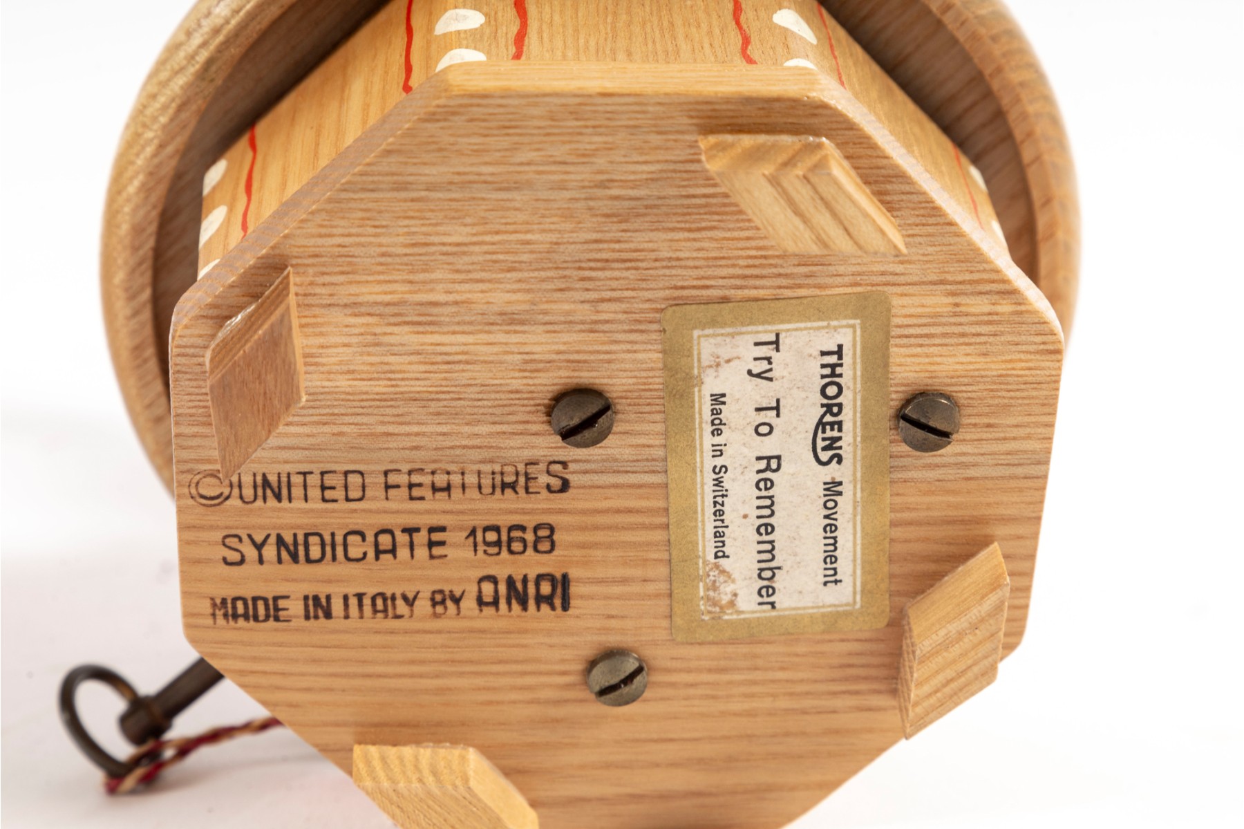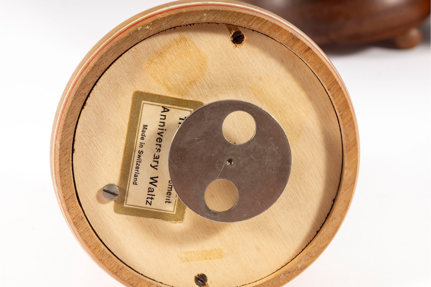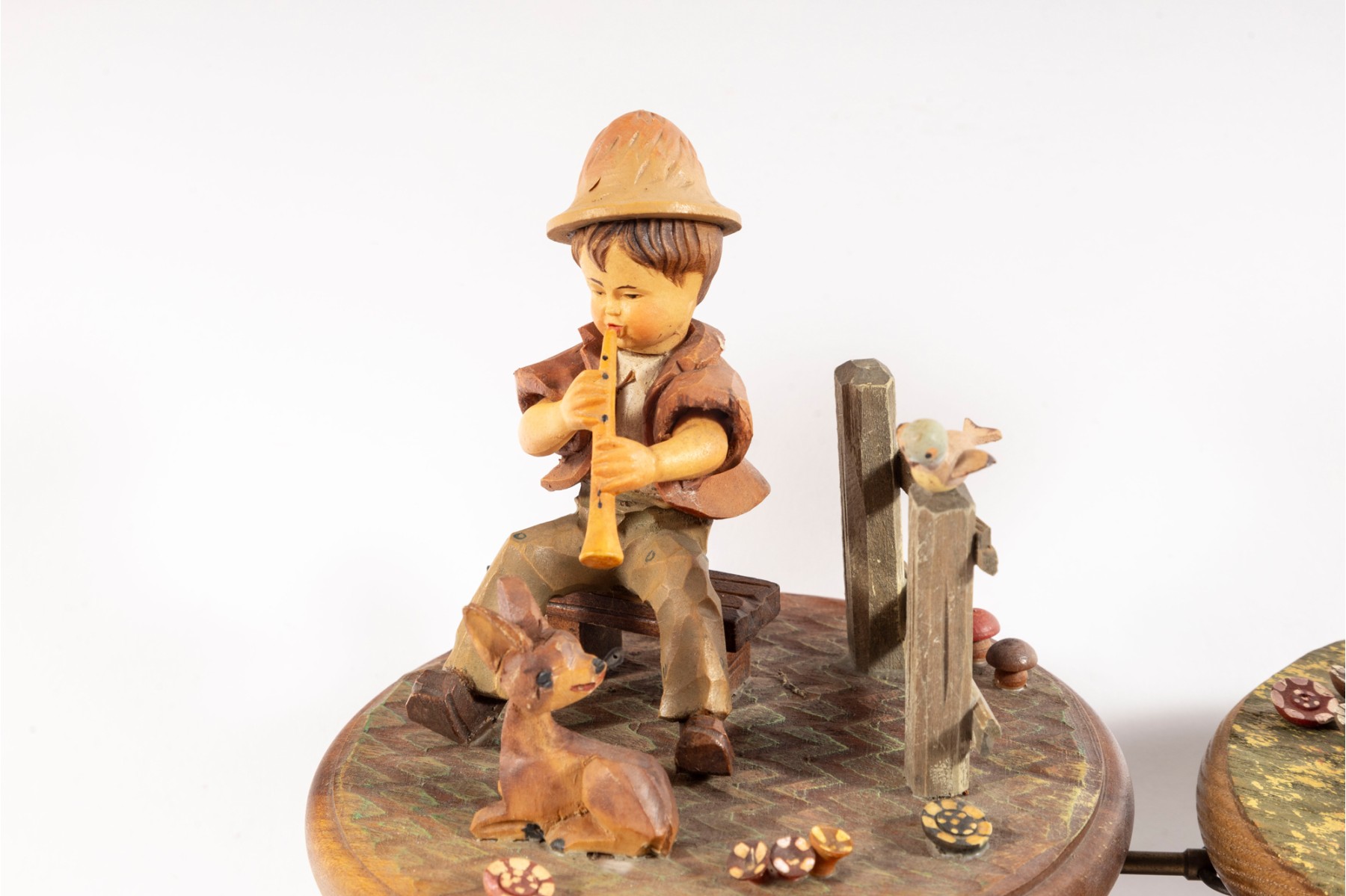 A set of four vintage Swiss Thorens woodcraft music boxes which spin upon activation. Each one is unique, sporting different whimsical scenes with hand-painted details. Four in total.