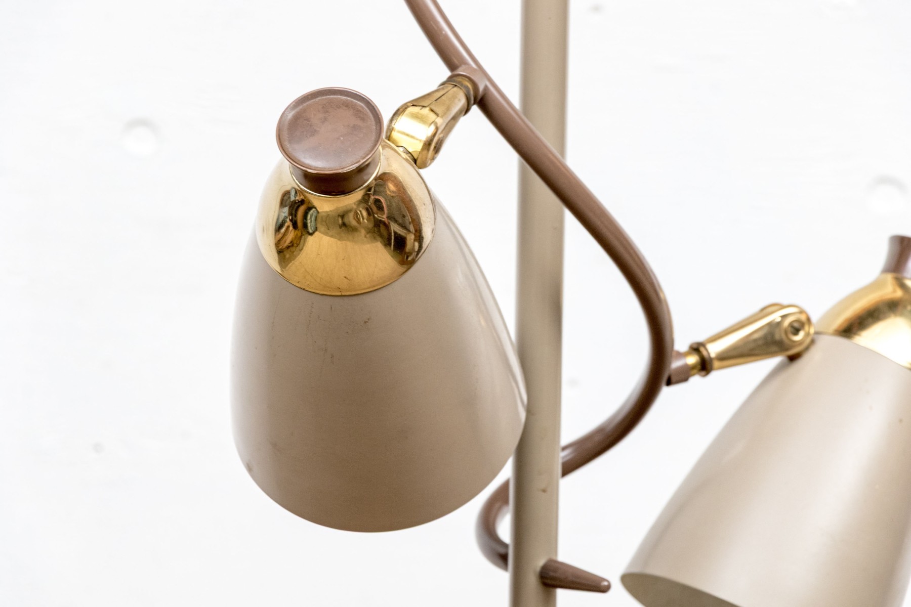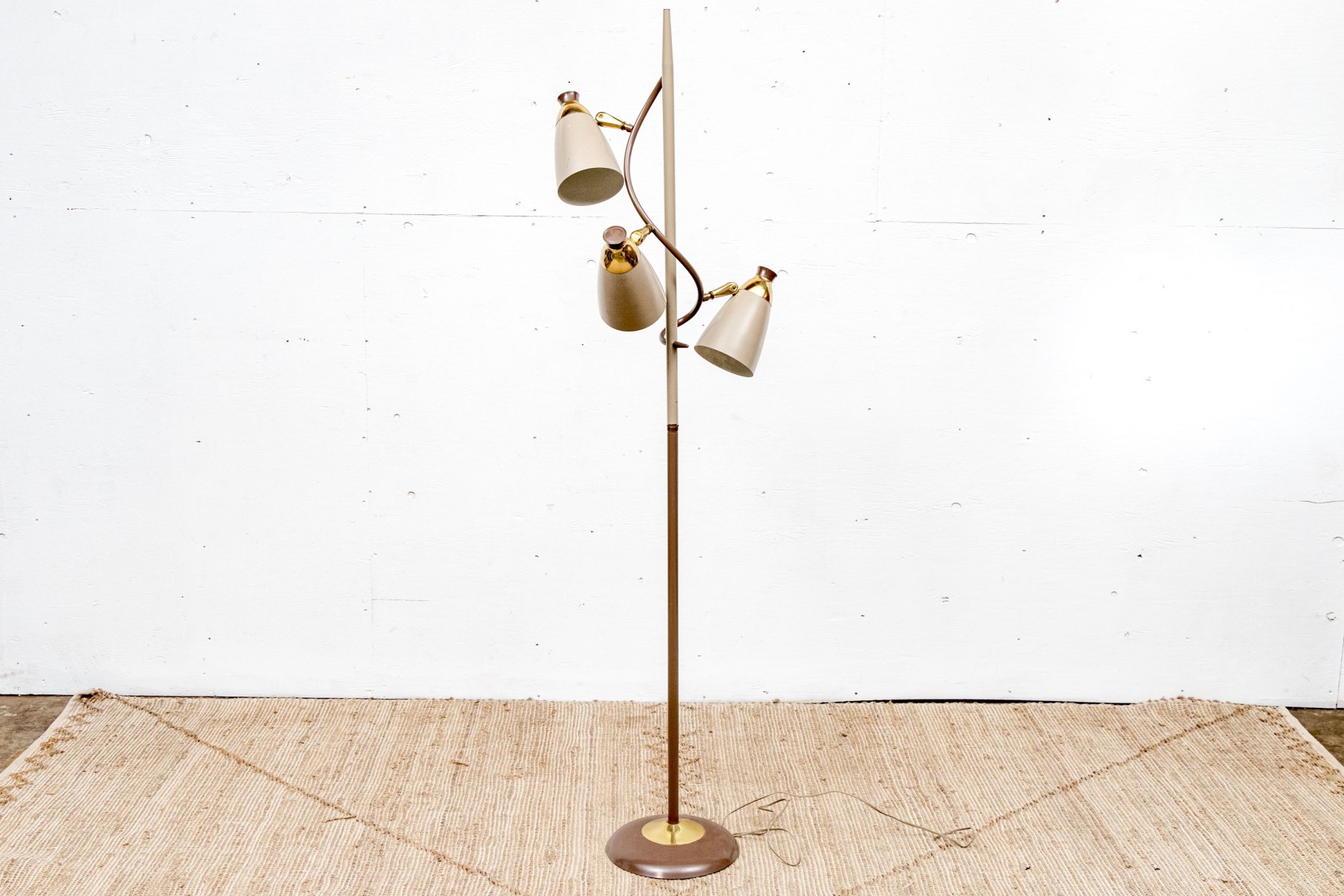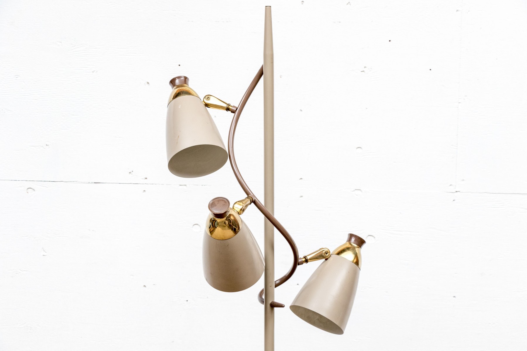 A chic vintage floor lamp with great mid-century appeal, designed with a spiraling arm supporting three adjustable lights with conical taupe shades and brass accents over a sleek cylindrical column on a circular base.