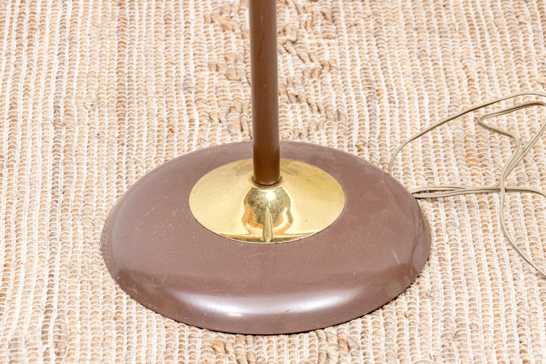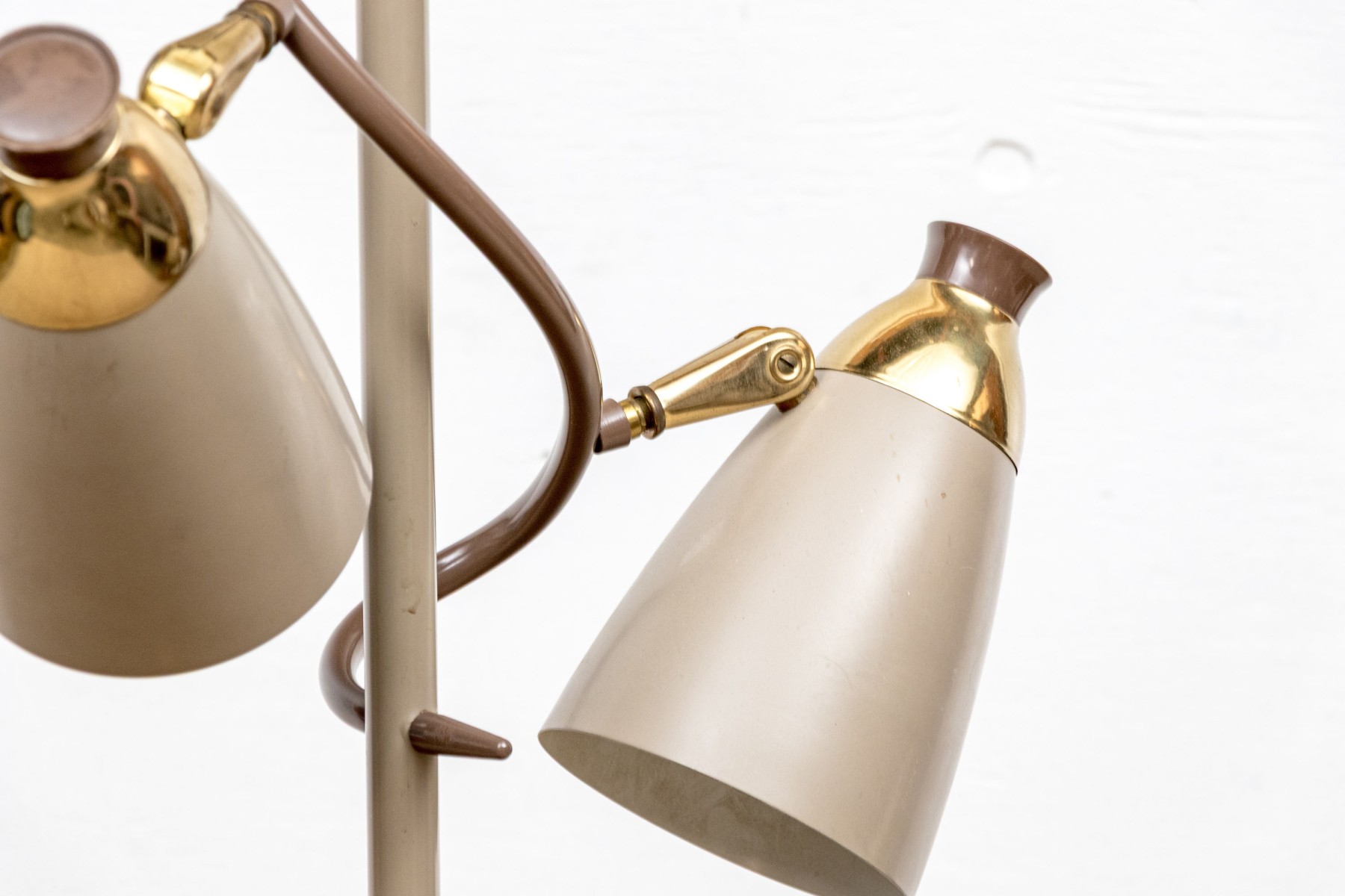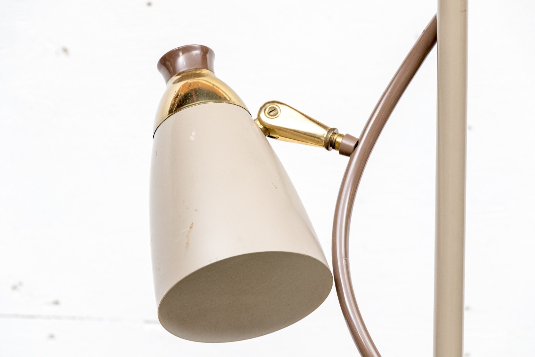 A chic vintage floor lamp with great mid-century appeal, designed with a spiraling arm supporting three adjustable lights with conical taupe shades and brass accents over a sleek cylindrical column on a circular base.