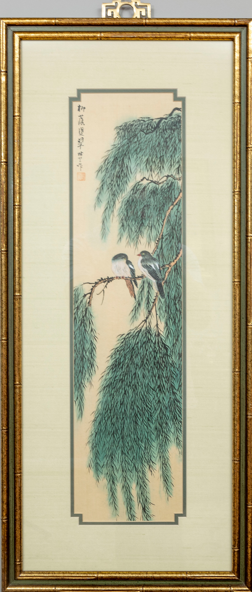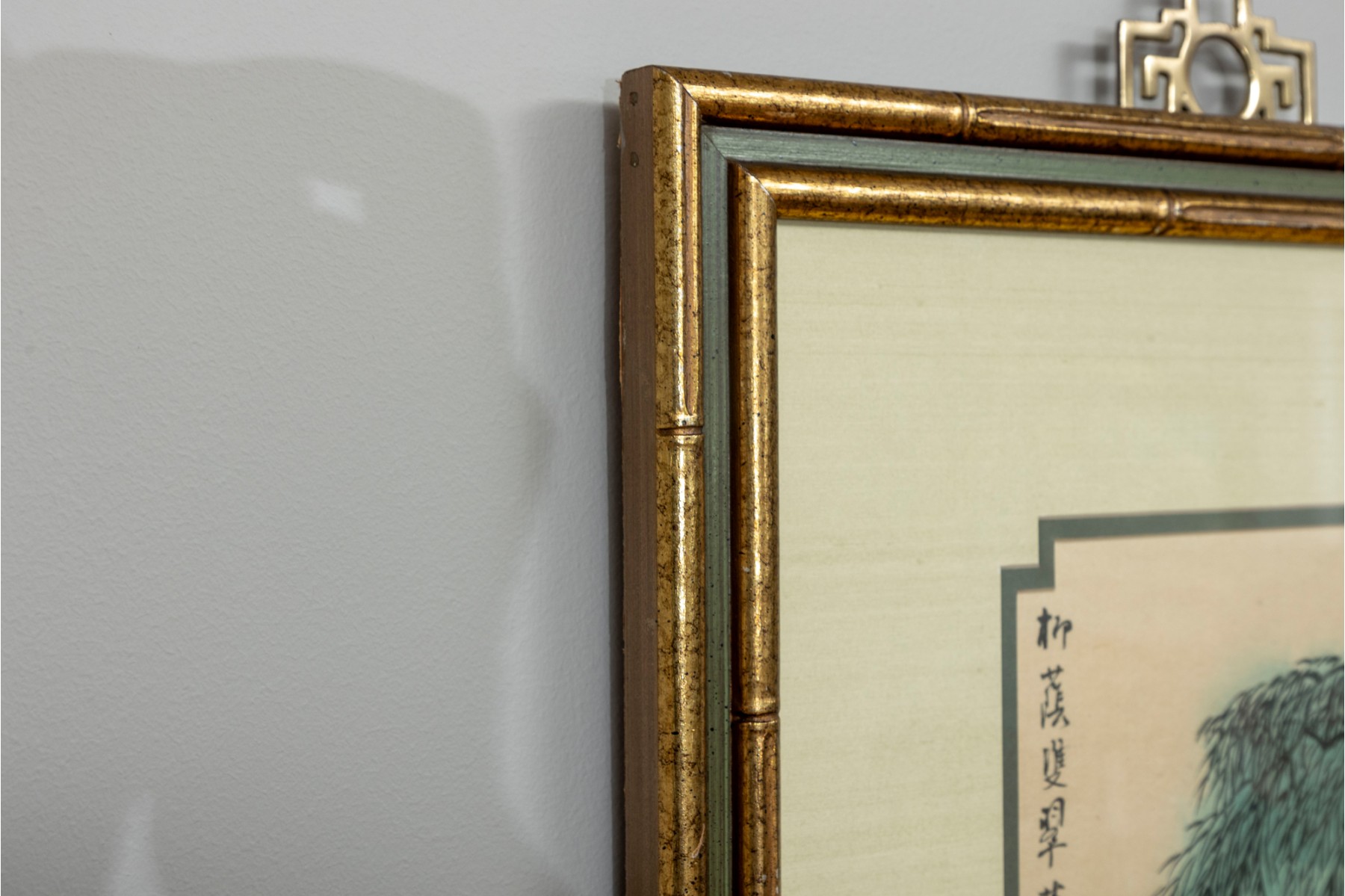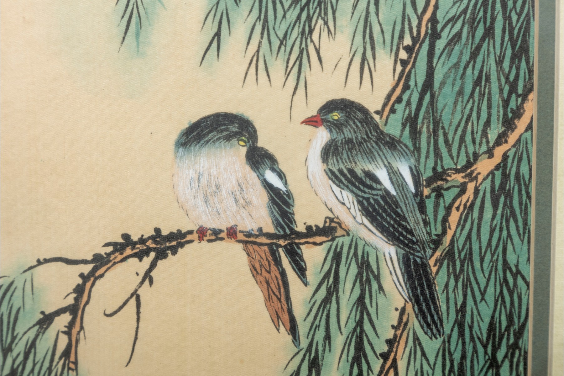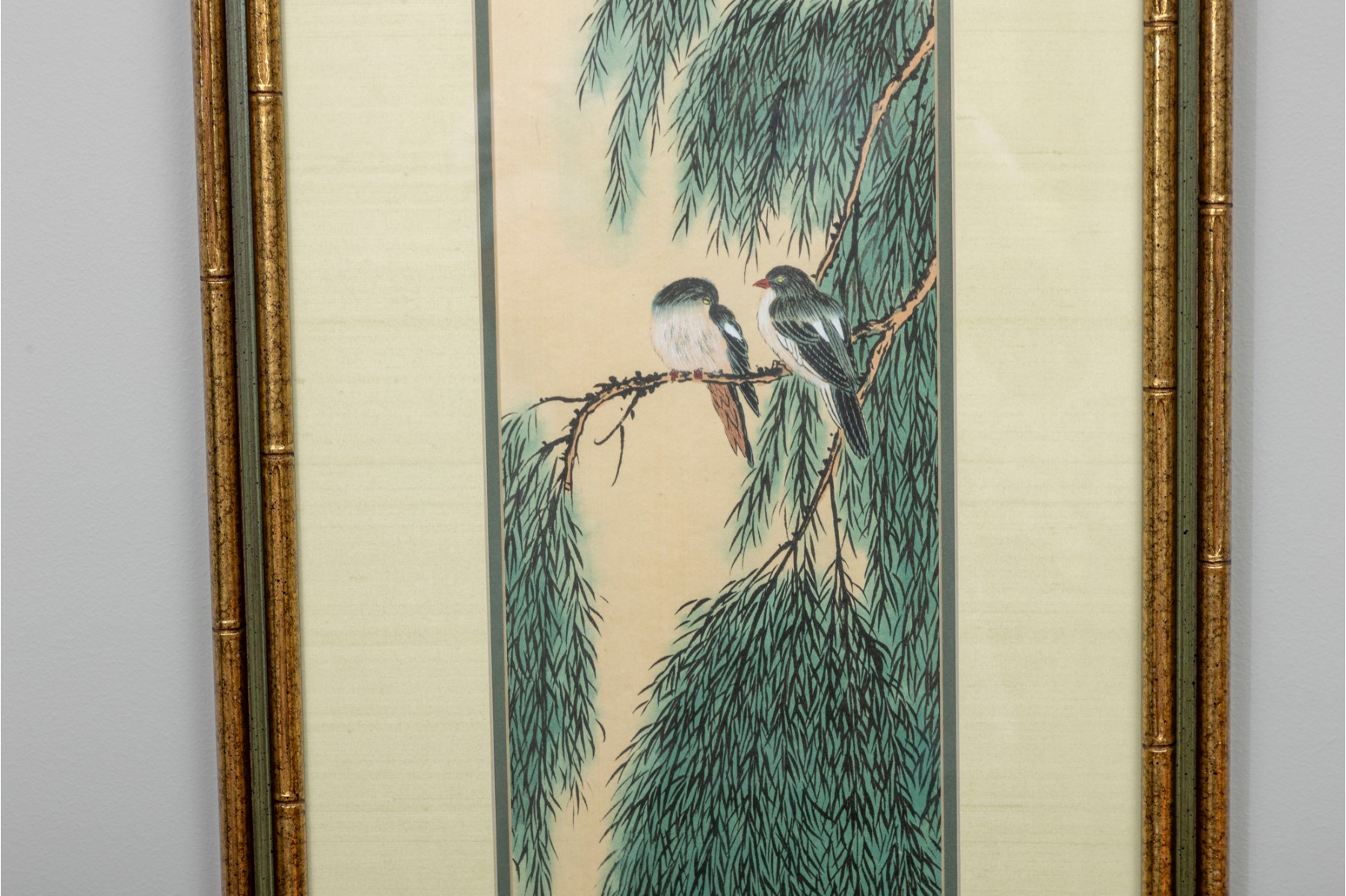 A vintage traditional Chinese scroll art showcases two magpies aboard a branch. The piece is displayed in a gold-tone faux bamboo frame and faced with glass