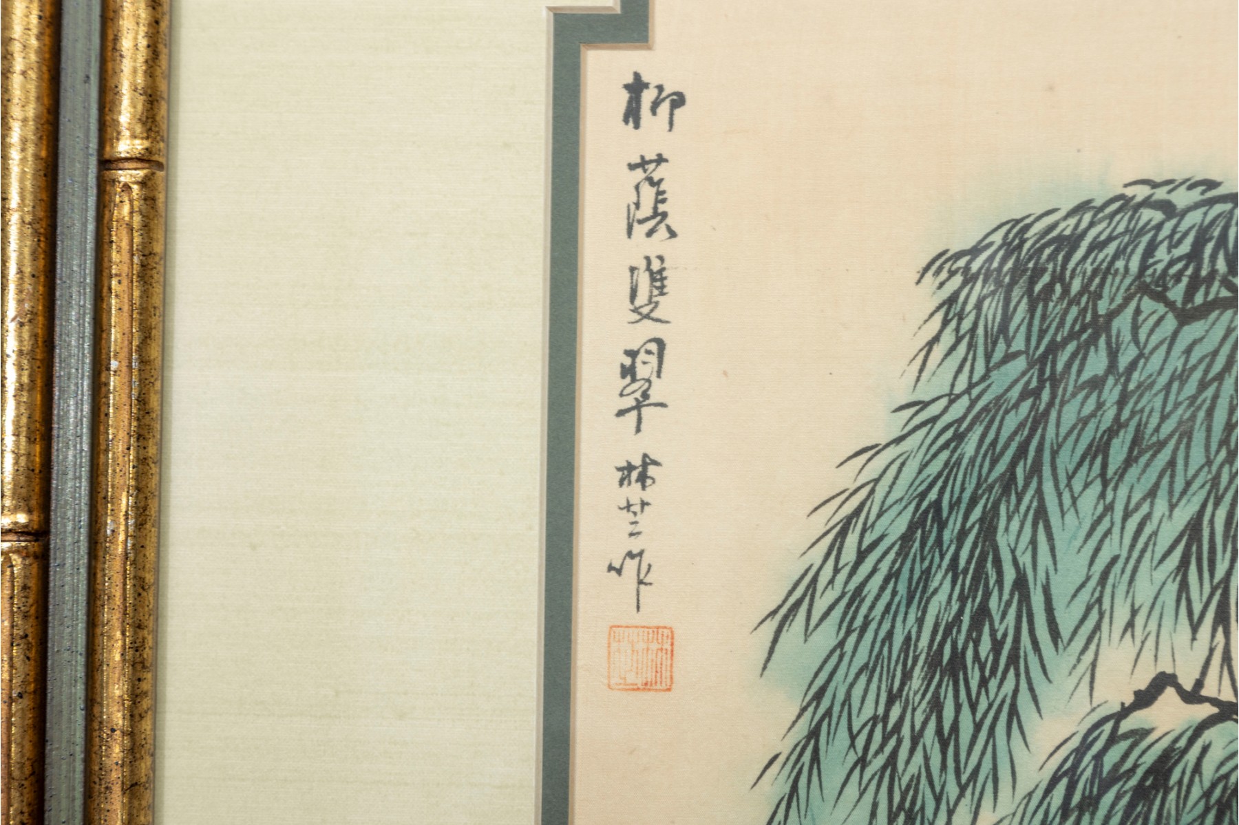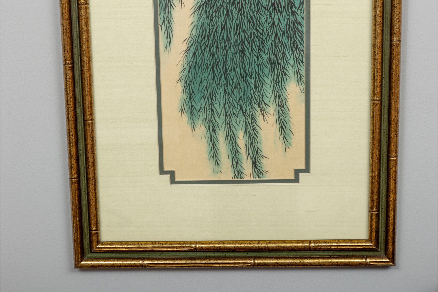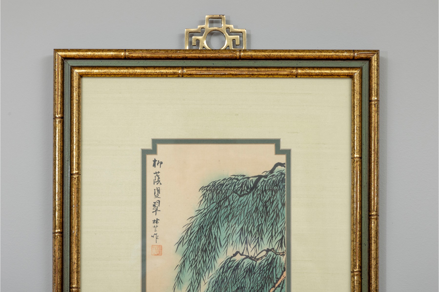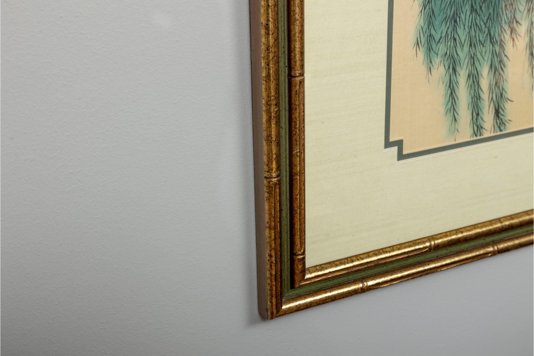 A vintage traditional Chinese scroll art showcases two magpies aboard a branch. The piece is displayed in a gold-tone faux bamboo frame and faced with glass