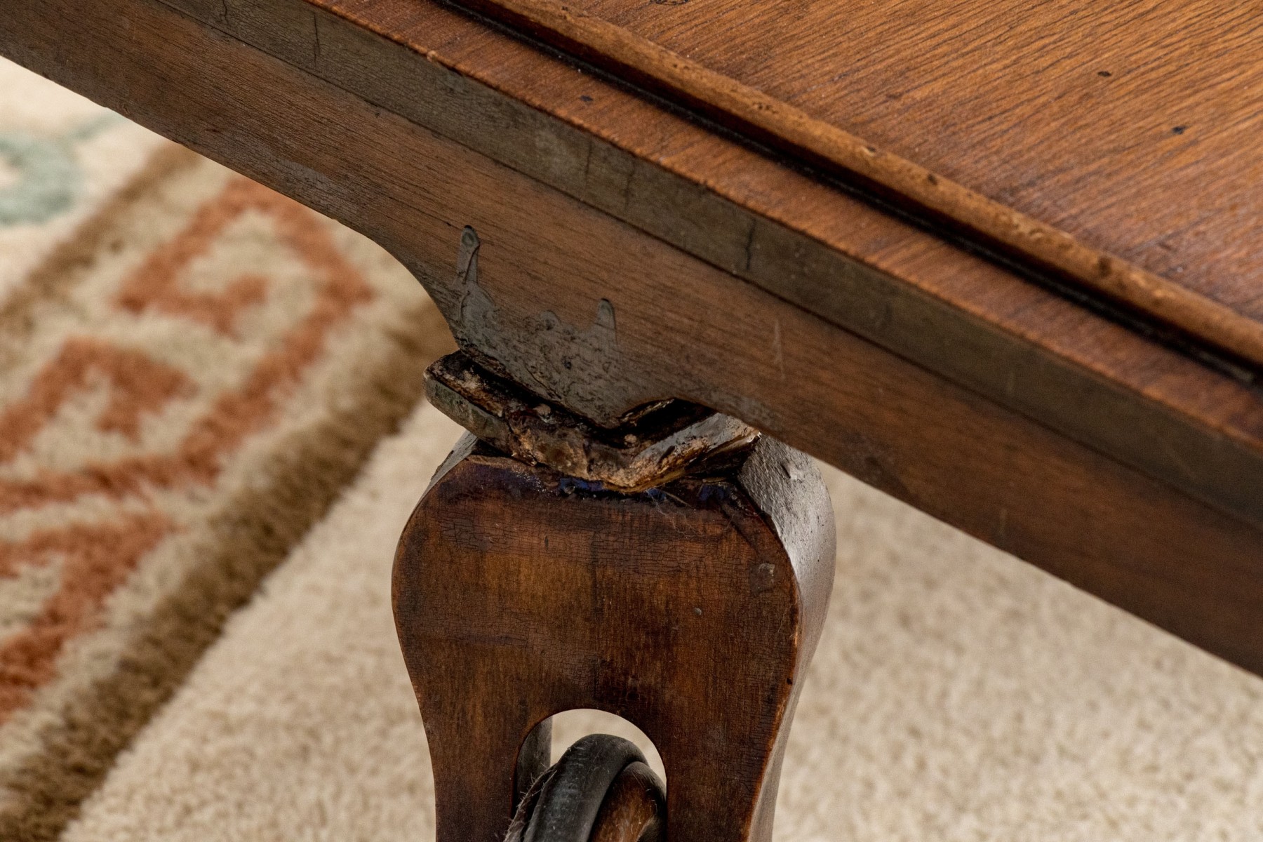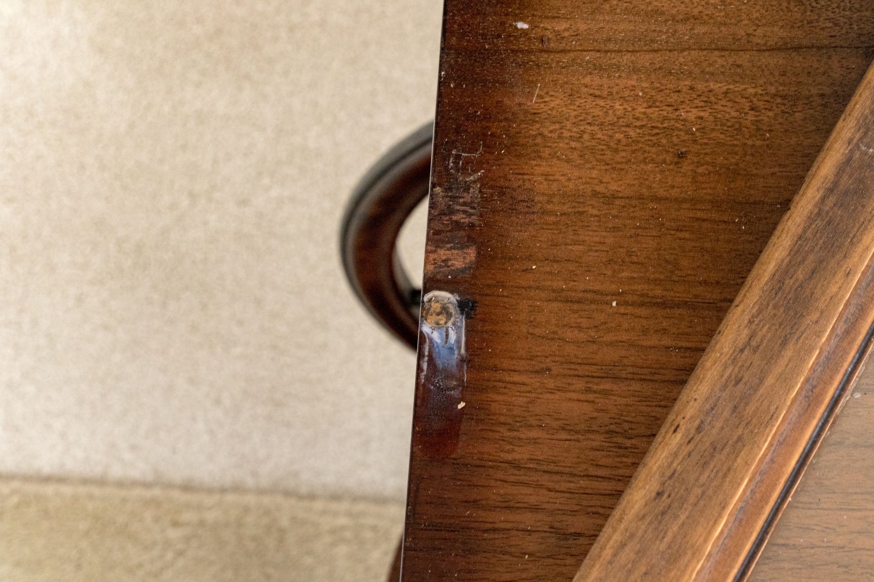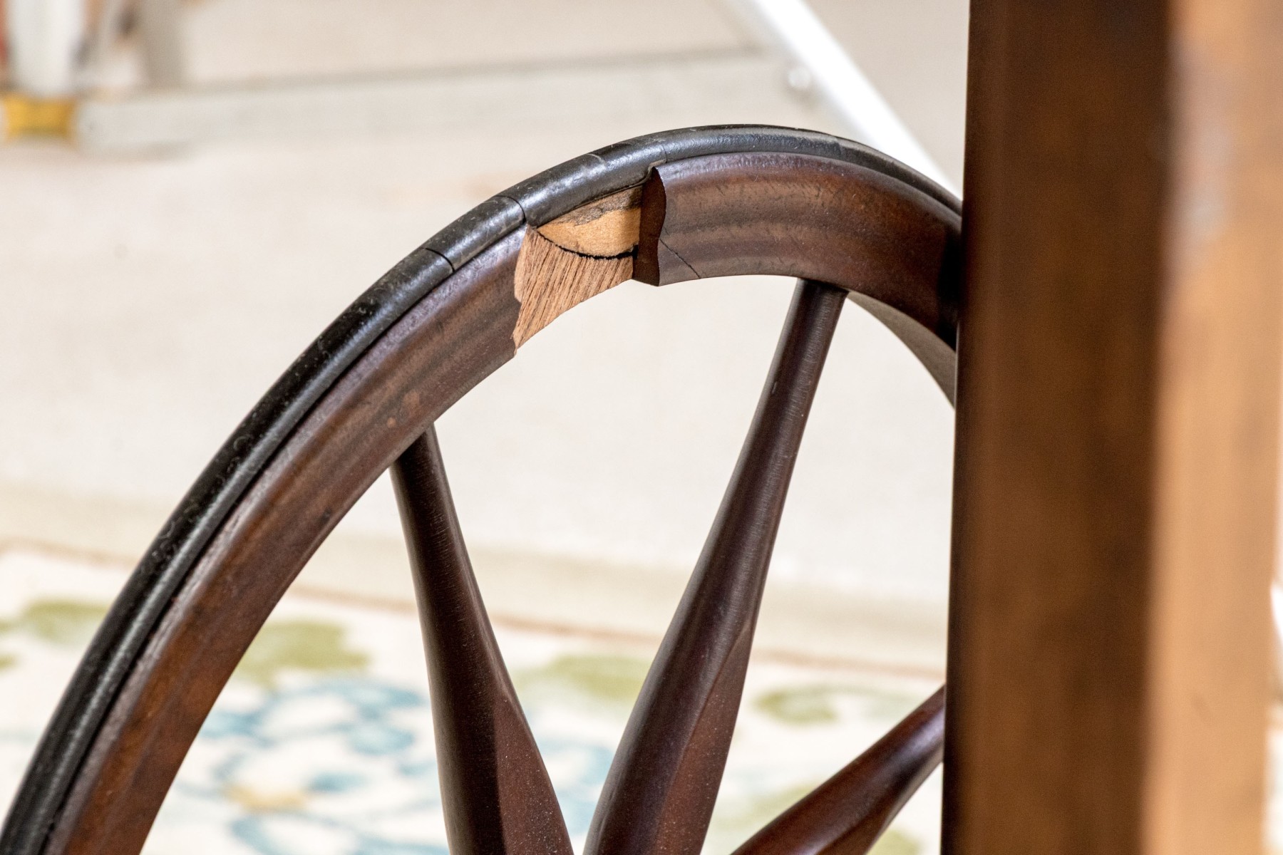 Losses and chipping to the trim of the top tier, under the glass and wood removable tray. Wheels are slightly loose and the front wheel is oxidized. Swivel front wheel has been previously restored and one of the larger wheel.