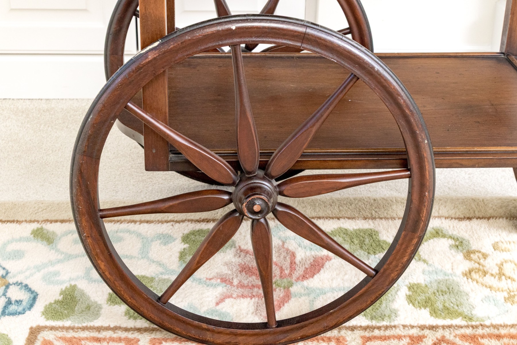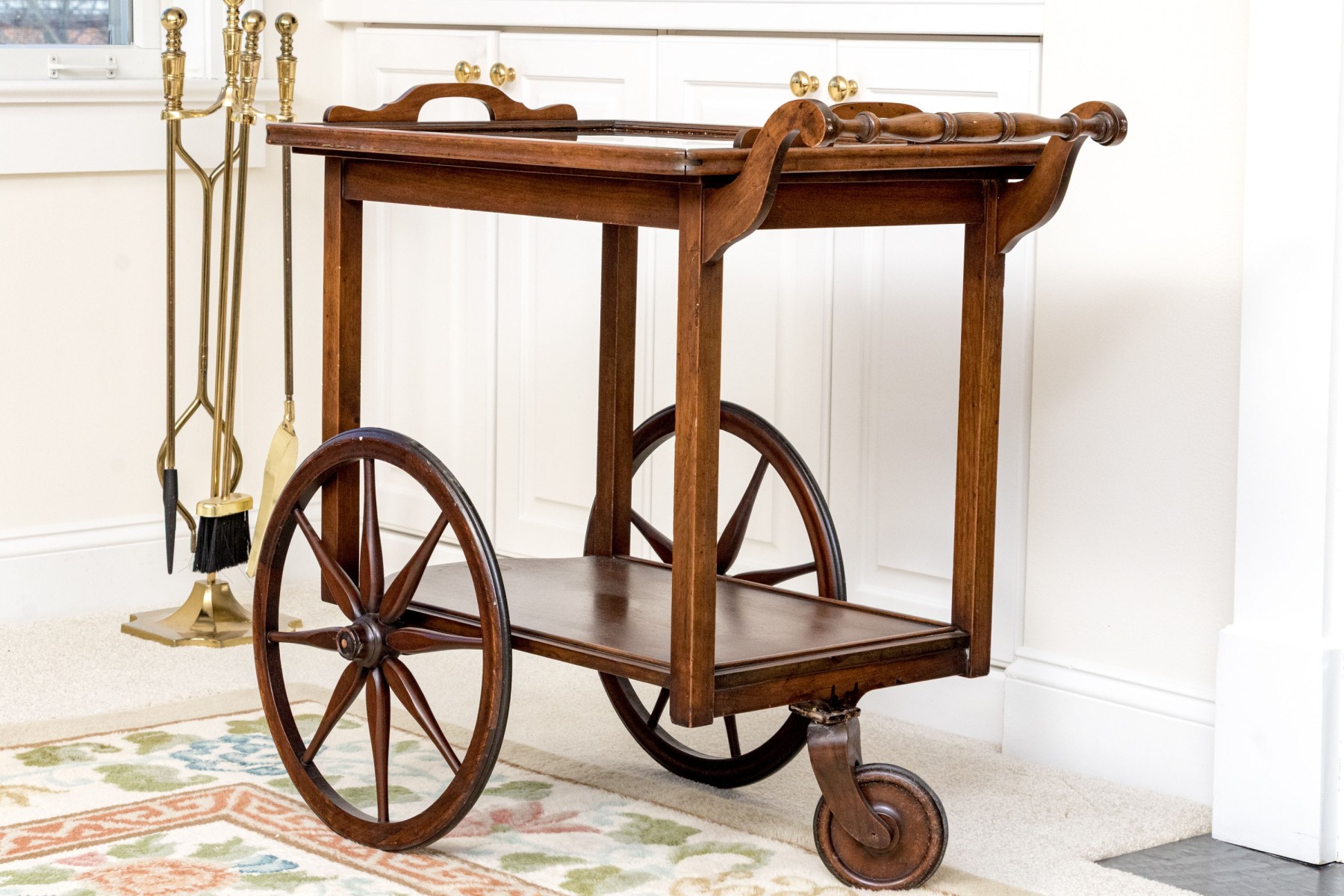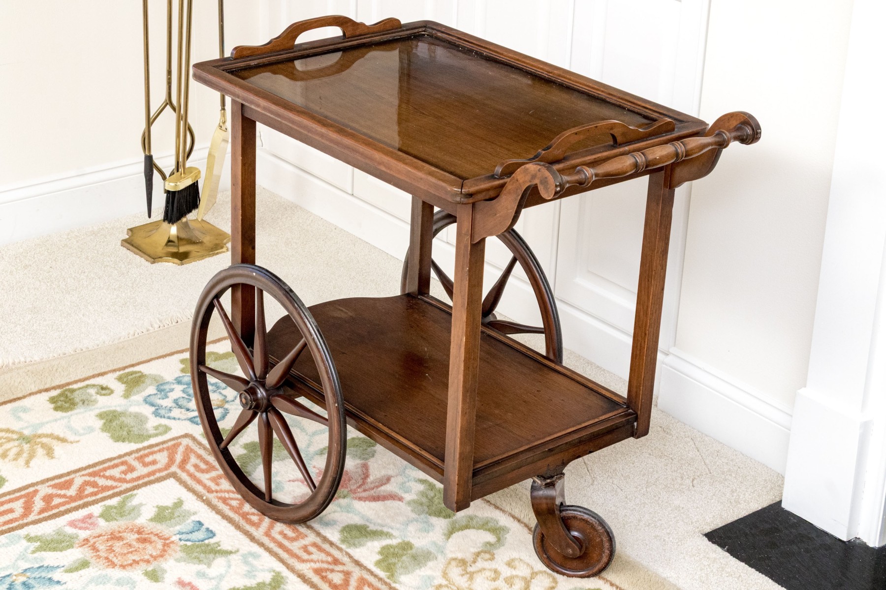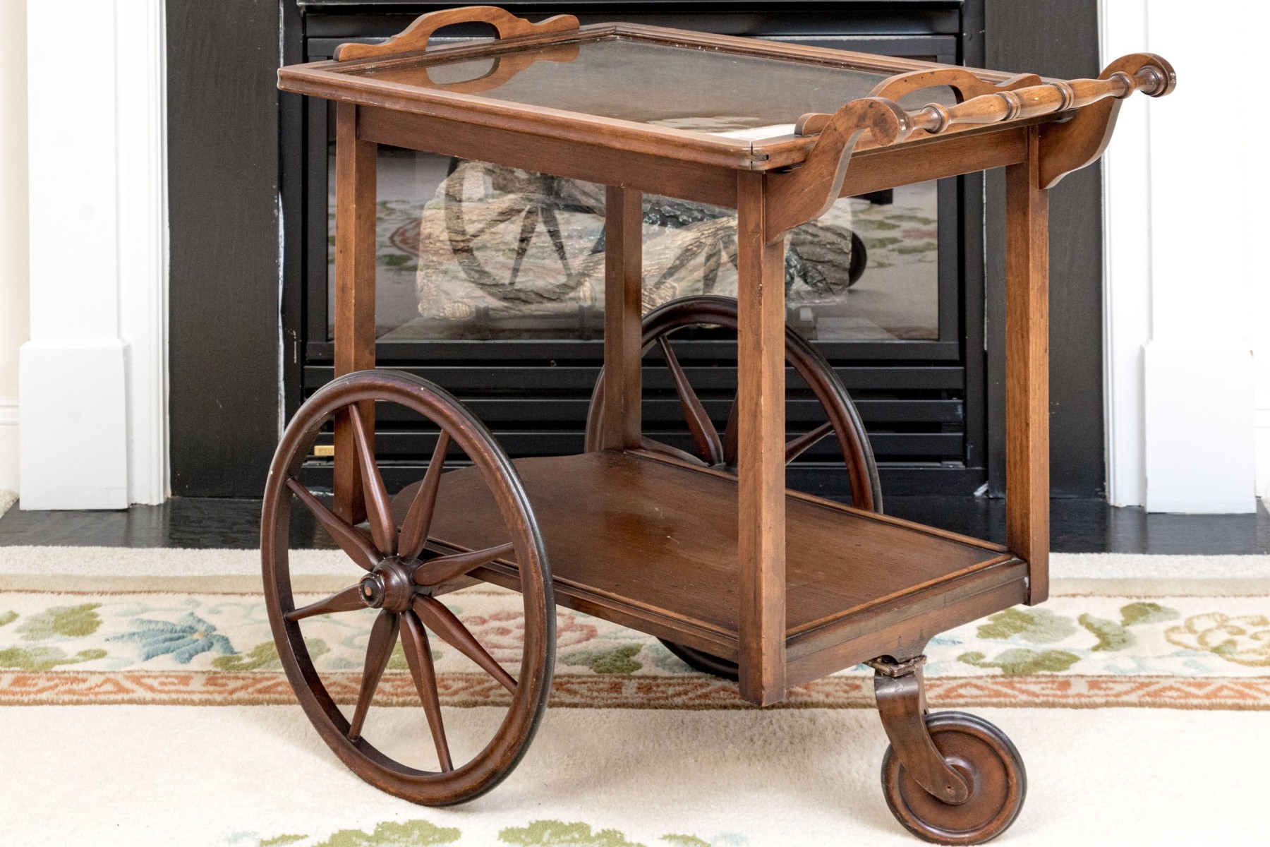 Mahogany finished with two large wheels with spokes and a front swivel wheel. The lower tiered shelf rises to the upper tier, with a two handled wood framed and glass removable tray