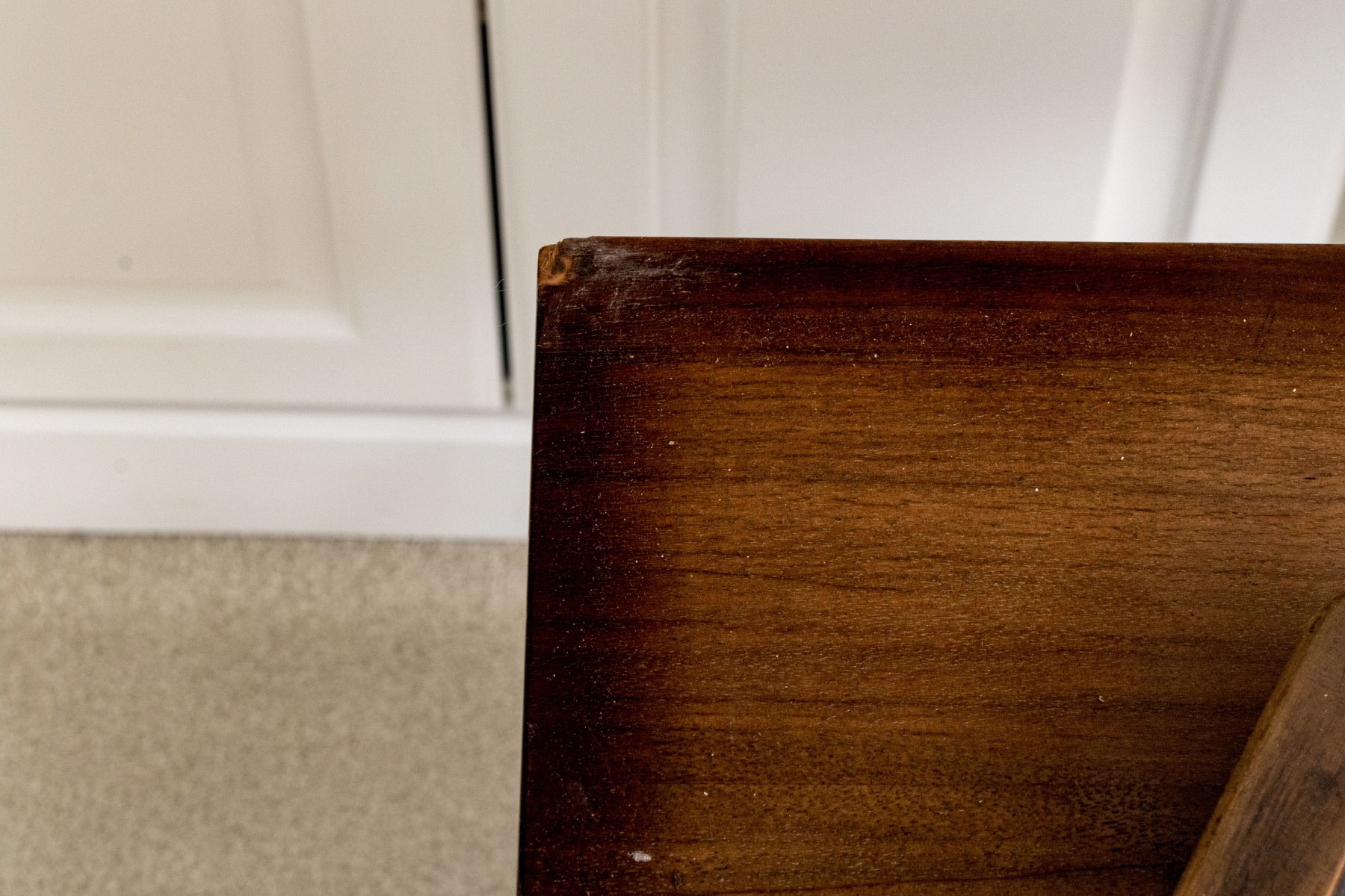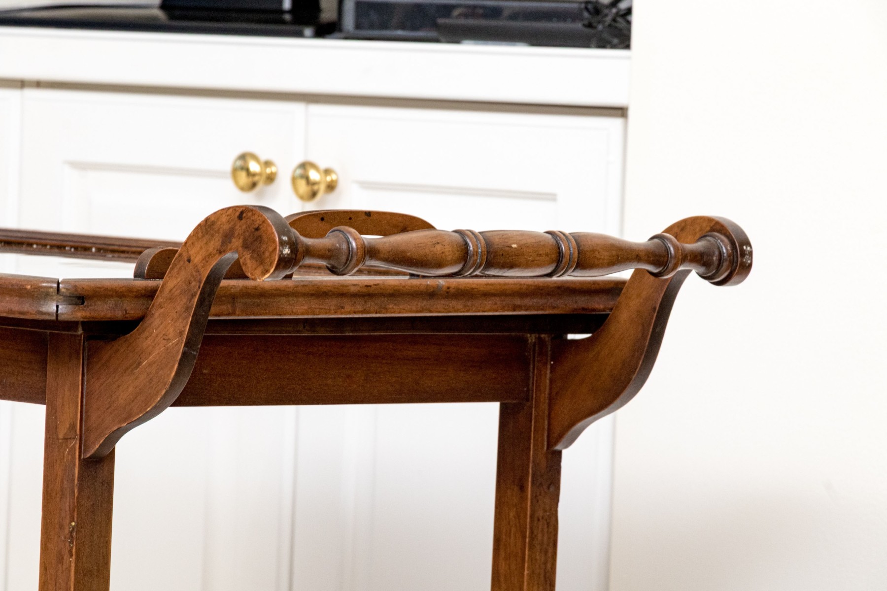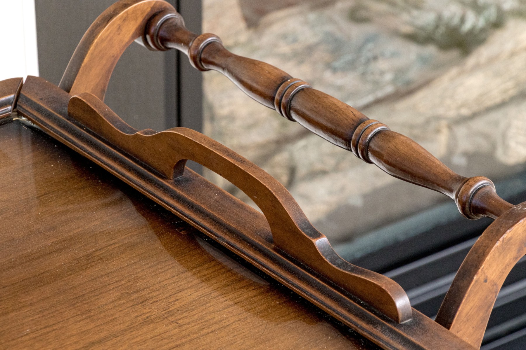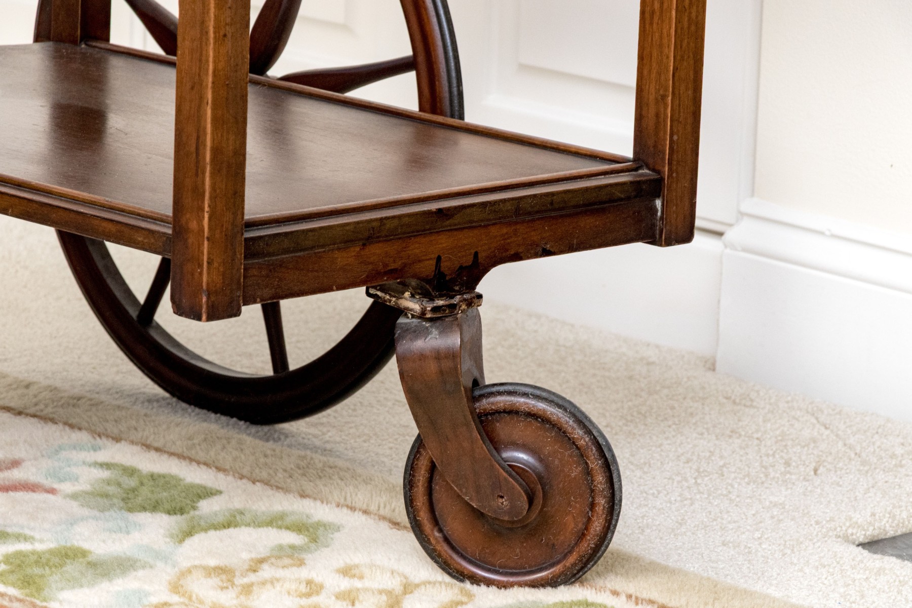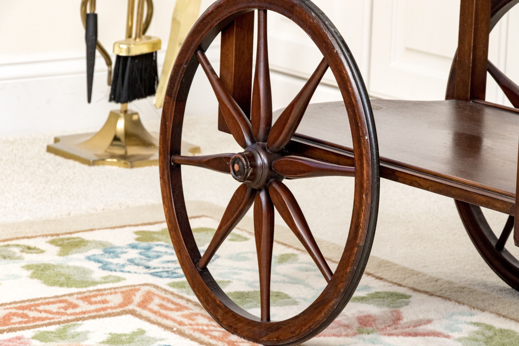 Mahogany finished with two large wheels with spokes and a front swivel wheel. The lower tiered shelf rises to the upper tier, with a two handled wood framed and glass removable tray