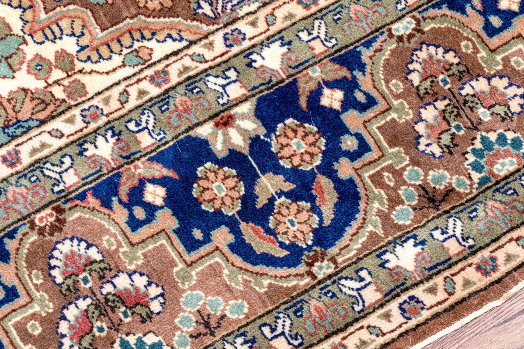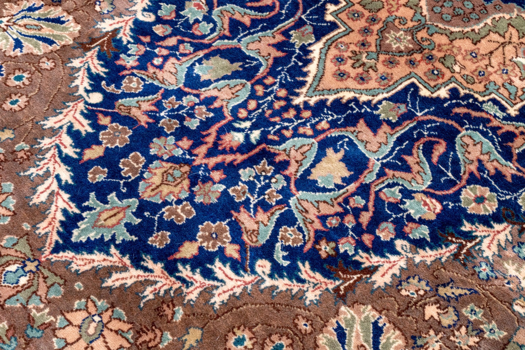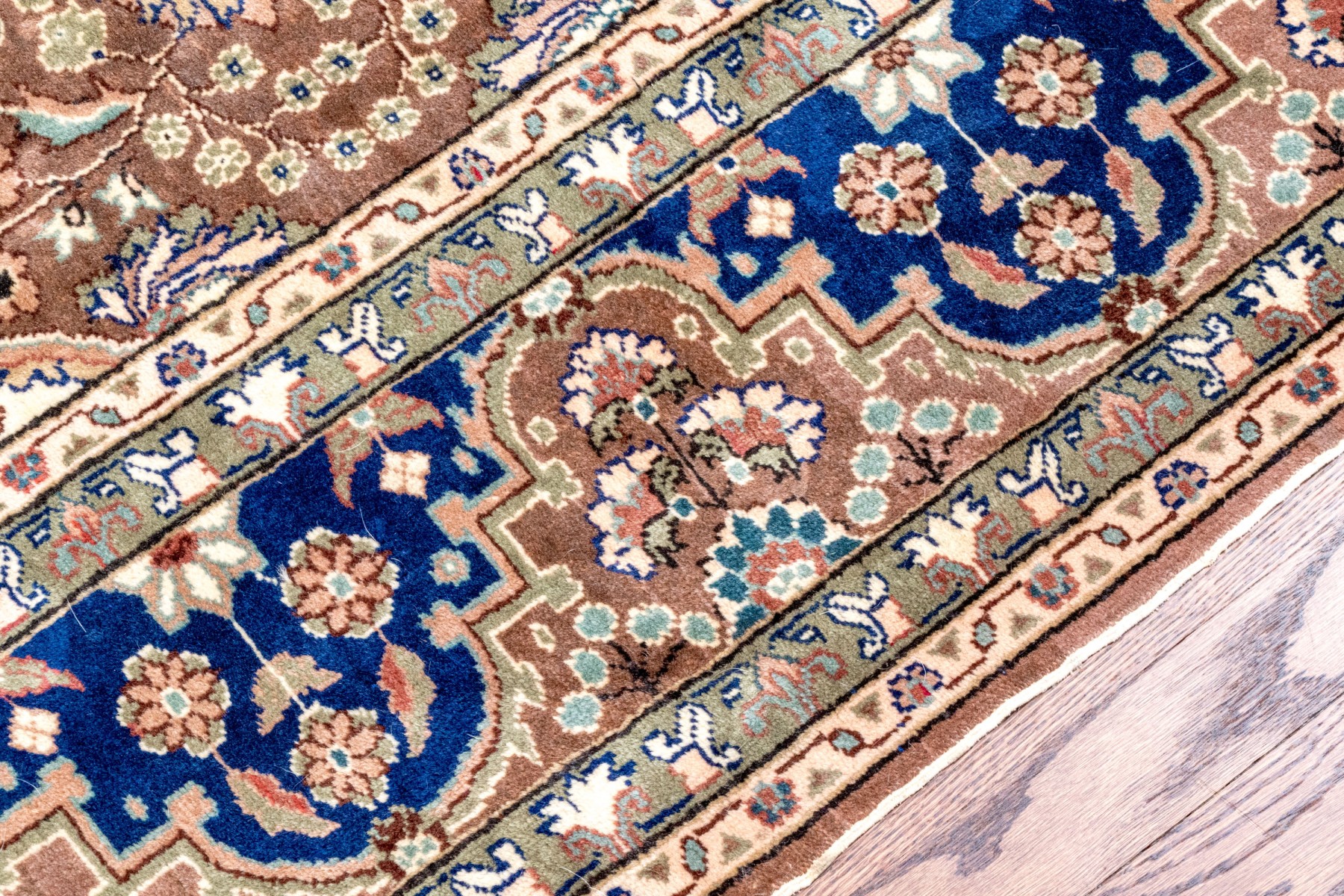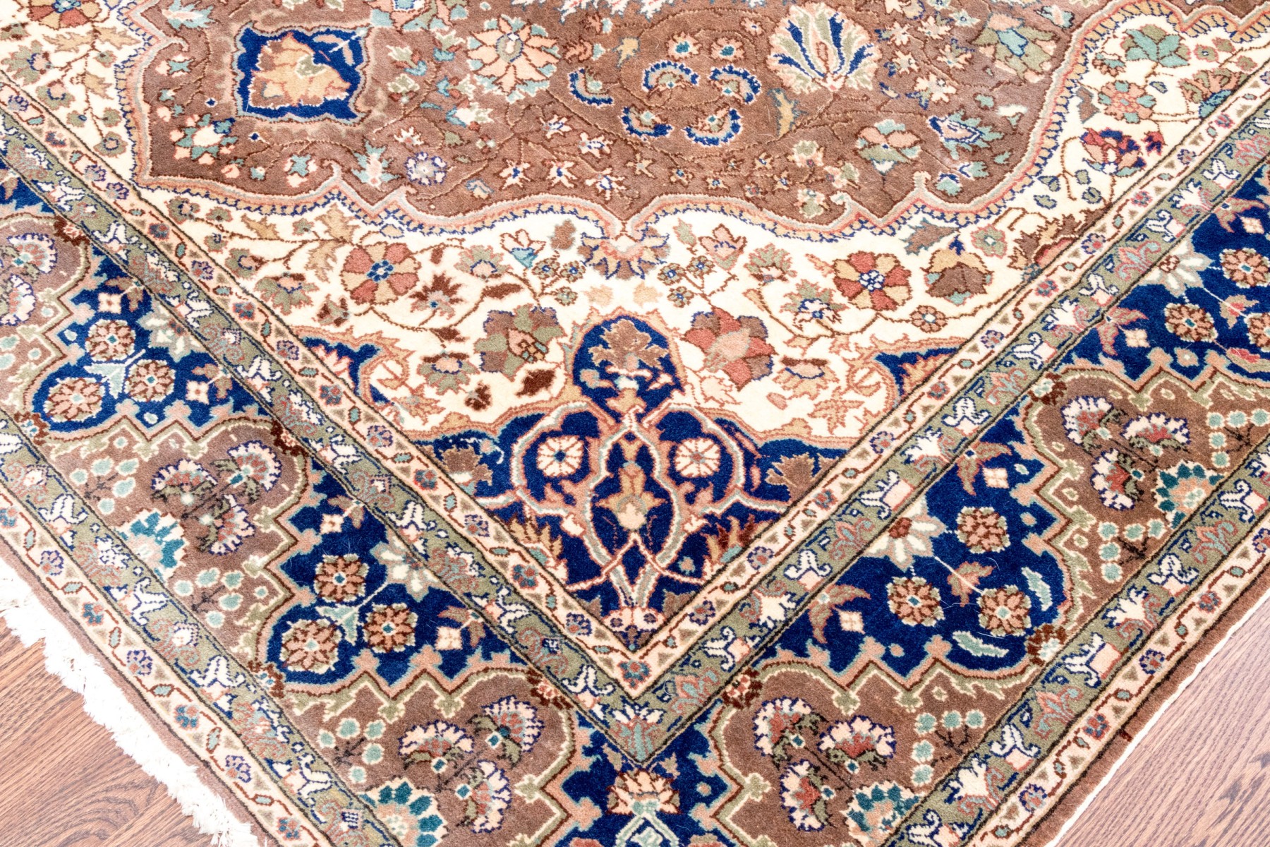 A fabulous vintage Turkish hand-knotted wool area rug displaying a royal blue main border with florals over light brown arches, surrounding a light brown field. The field is framed by scalloped white spandrels around a large central medallion in royal blue with ornate vining floral medallions.