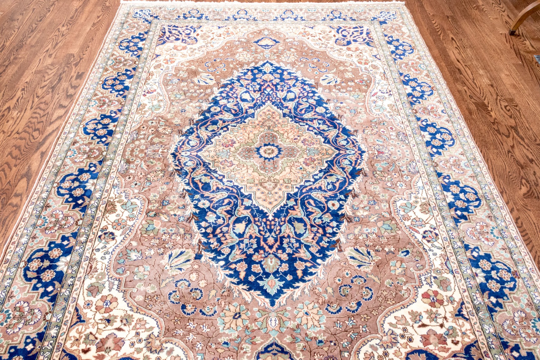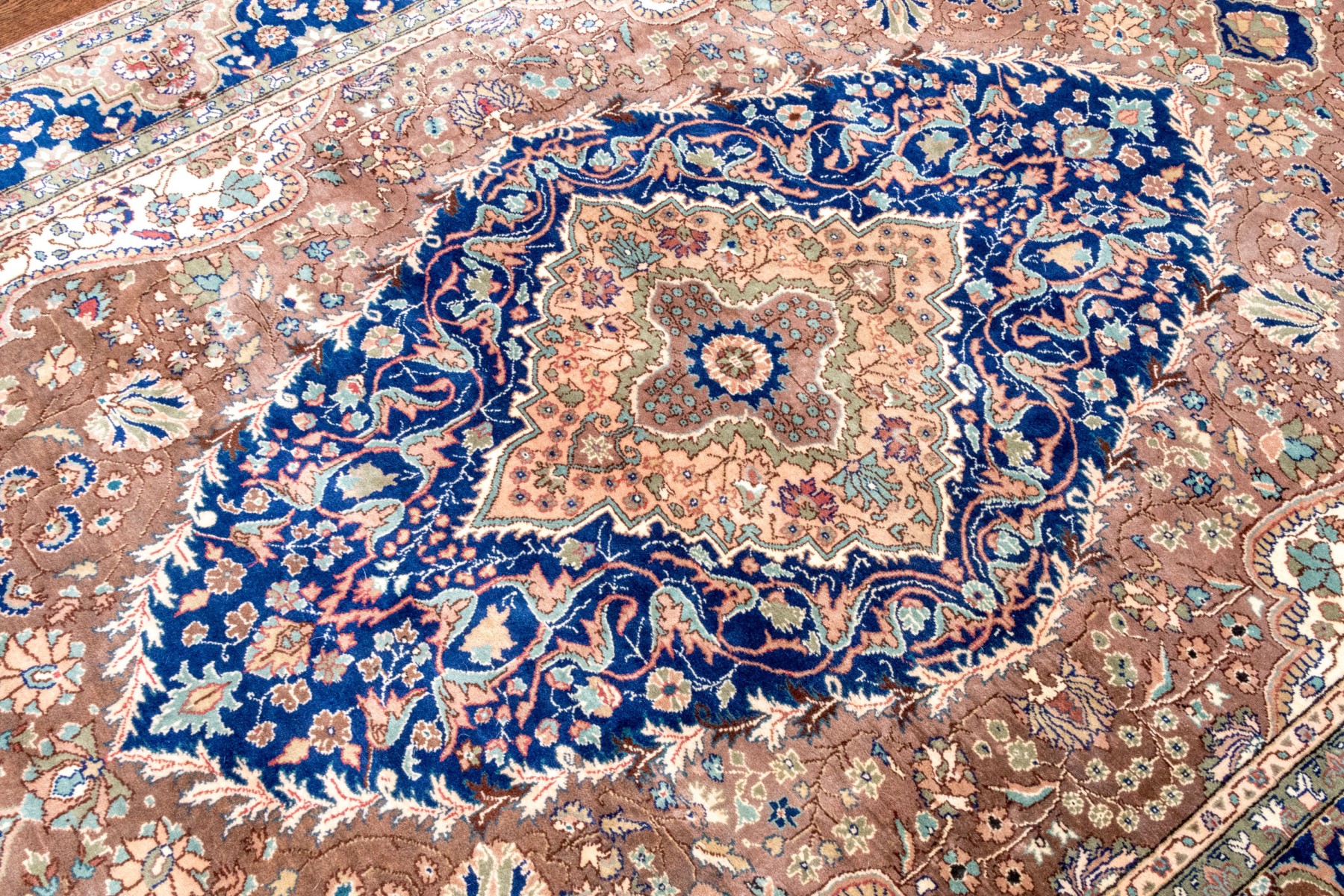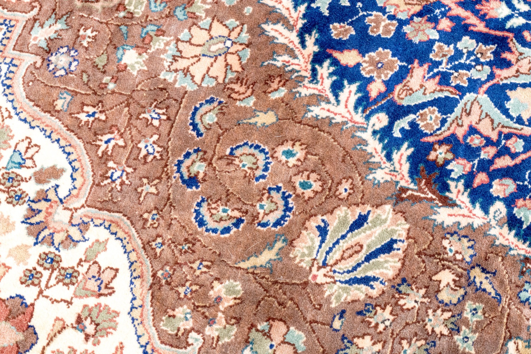 A fabulous vintage Turkish hand-knotted wool area rug displaying a royal blue main border with florals over light brown arches, surrounding a light brown field. The field is framed by scalloped white spandrels around a large central medallion in royal blue with ornate vining floral medallions.