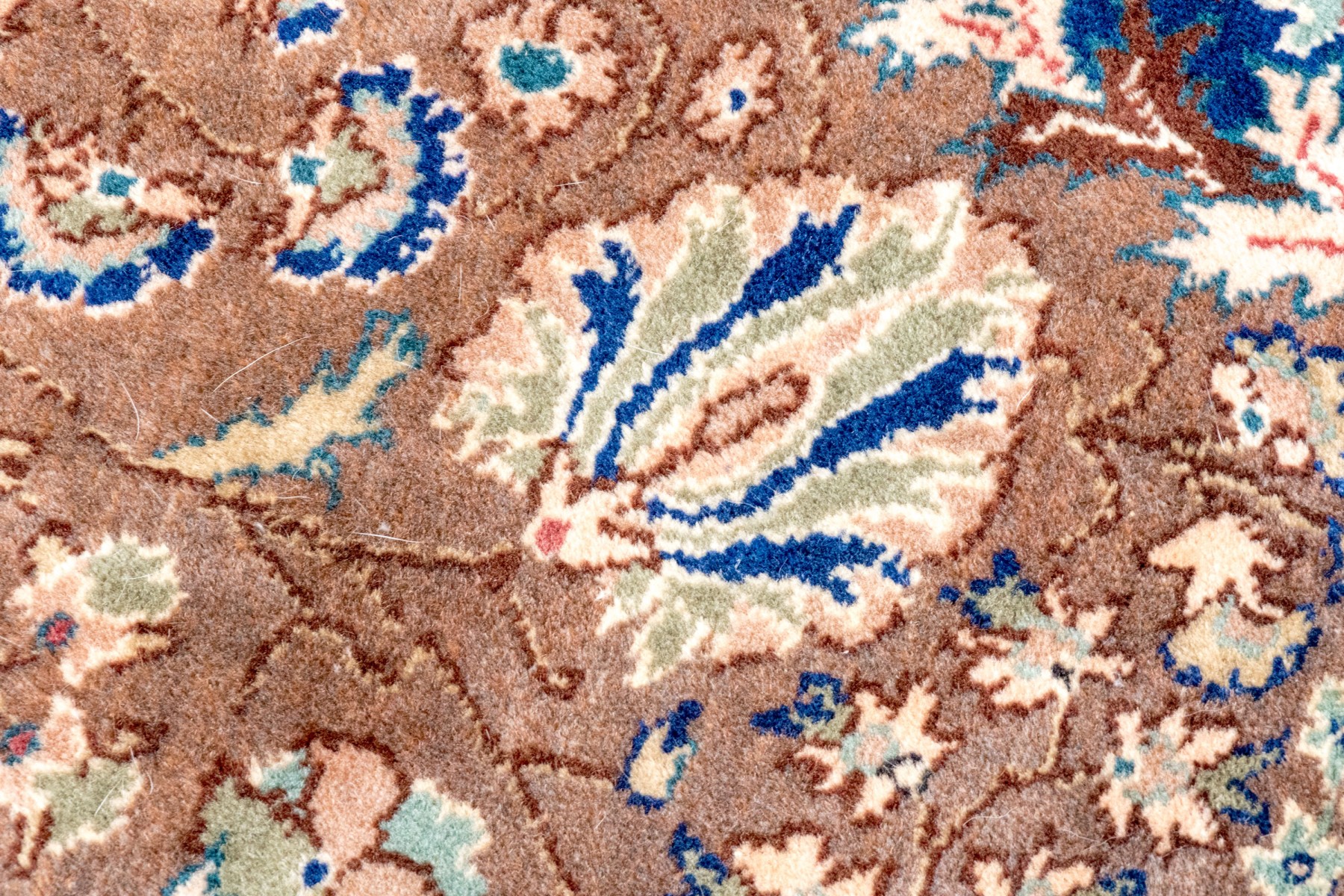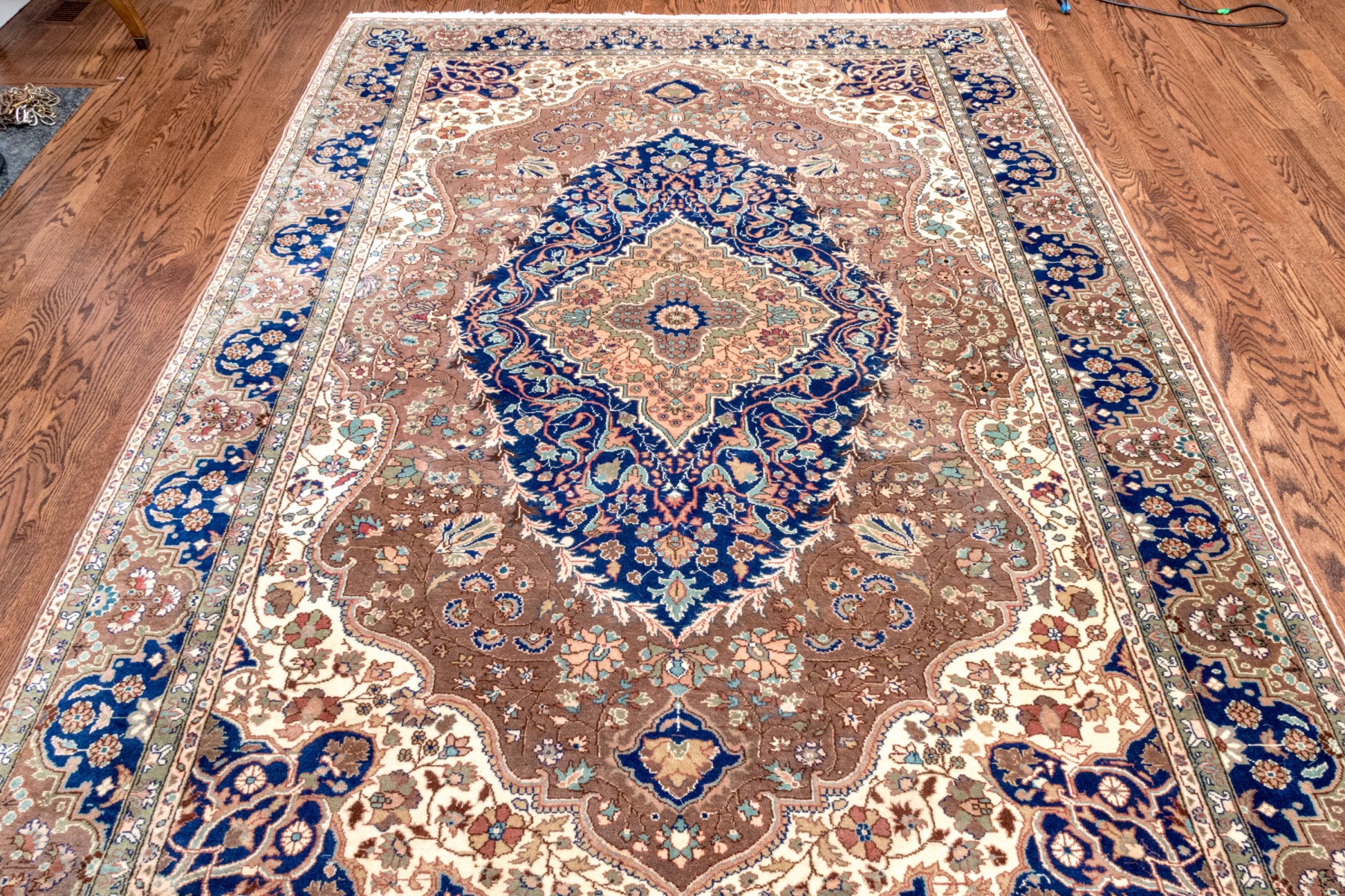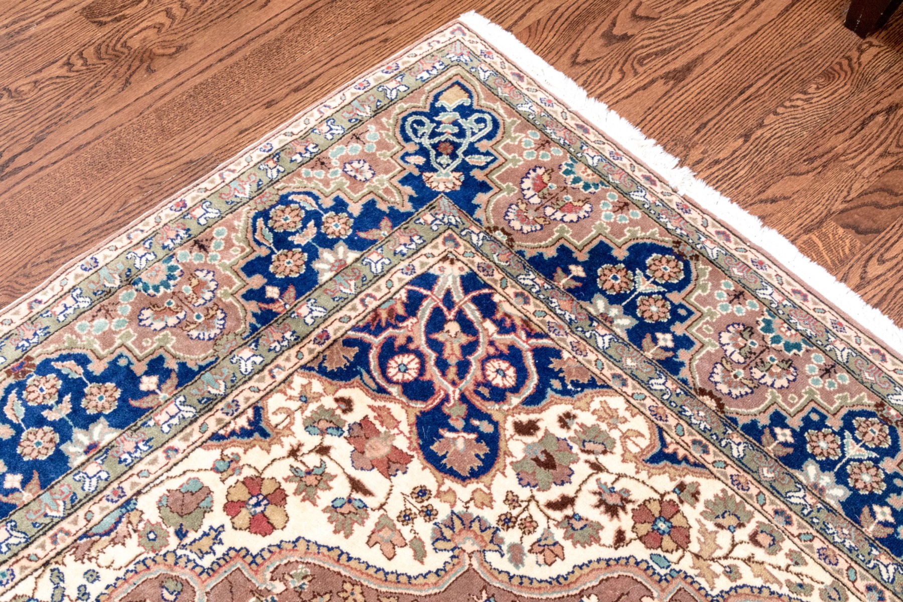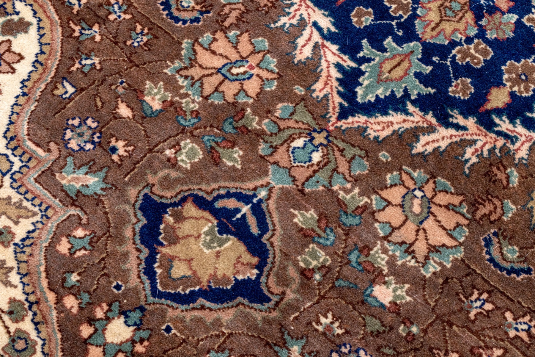 A fabulous vintage Turkish hand-knotted wool area rug displaying a royal blue main border with florals over light brown arches, surrounding a light brown field. The field is framed by scalloped white spandrels around a large central medallion in royal blue with ornate vining floral medallions.