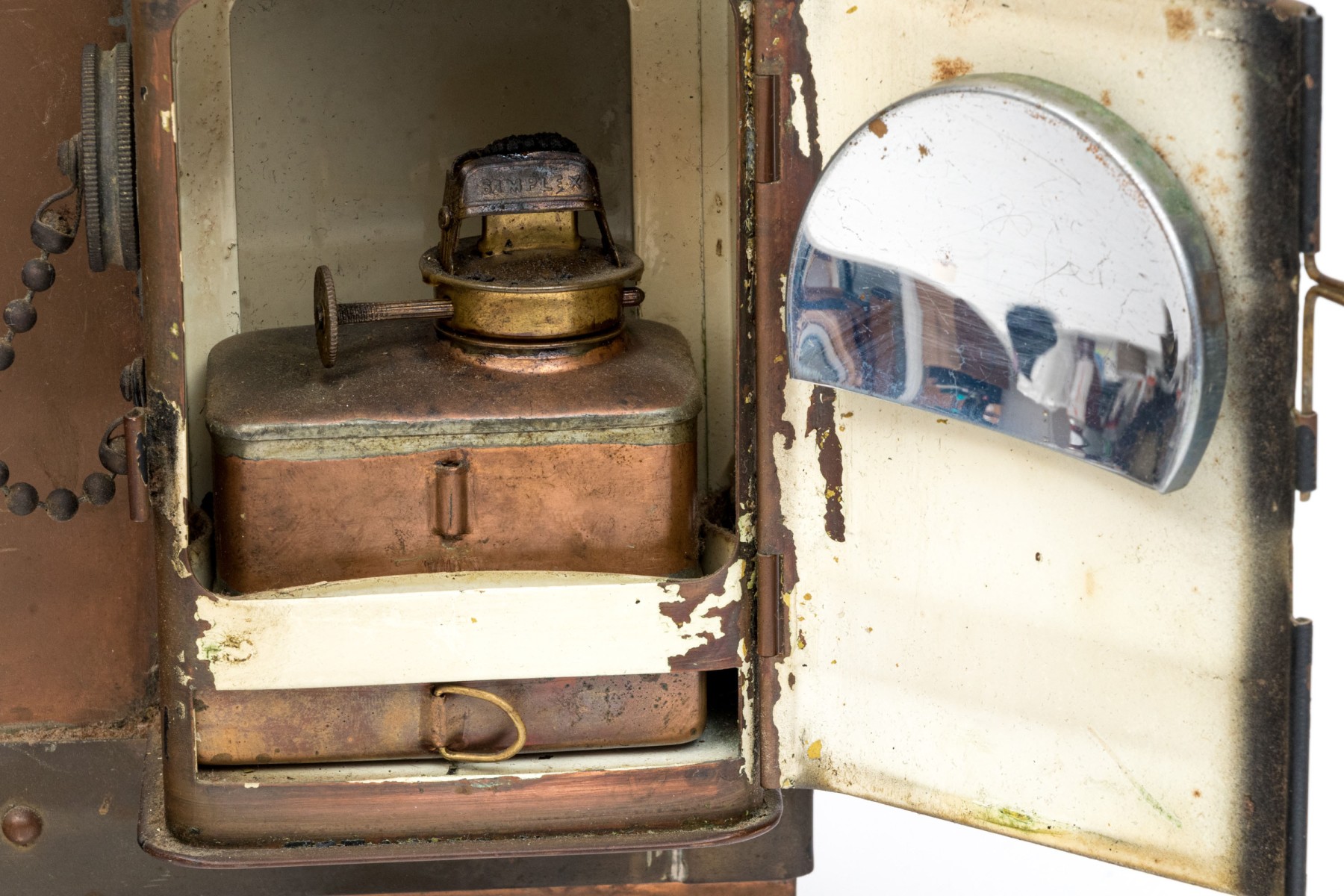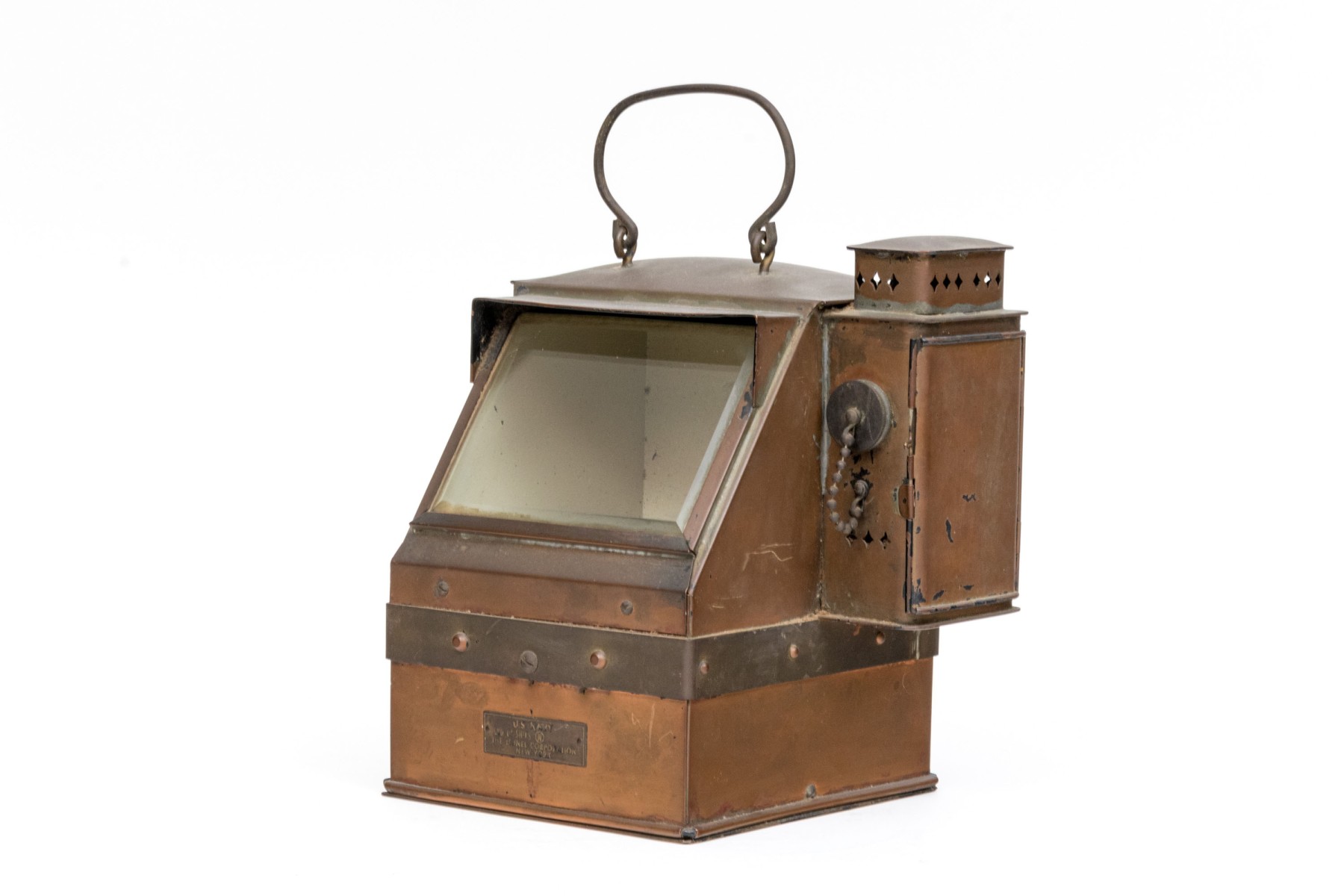 Vintage United States Navy binnacle compass created by The Lionel Corporation, New York. This lifeboat or desktop compass has a copper and brass exterior with natural patina. Set on the right side of the piece is an oil lantern that is intended to shine into the binnacle, allowing the interior compass to be viewed. Handle at top.