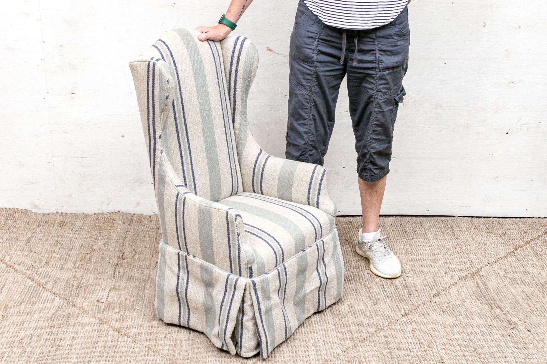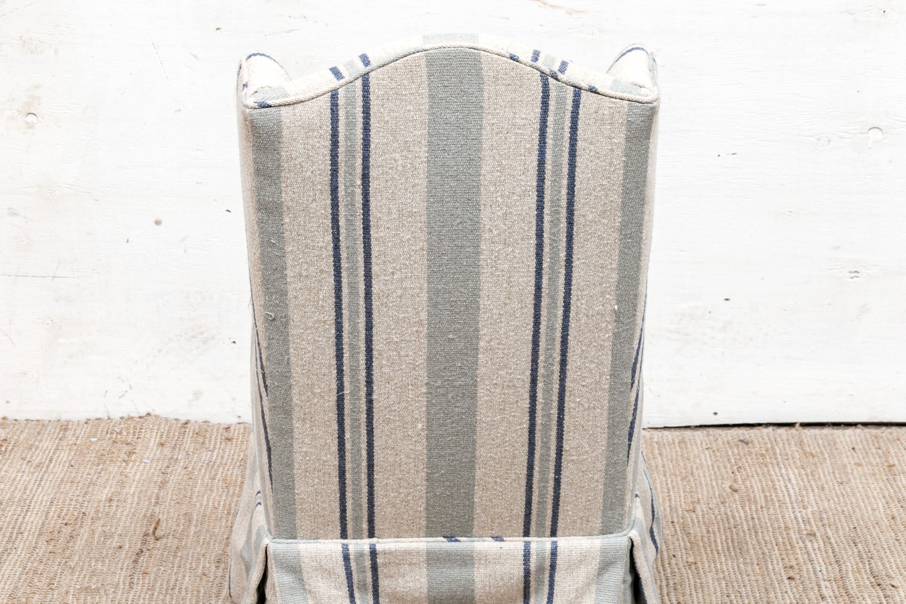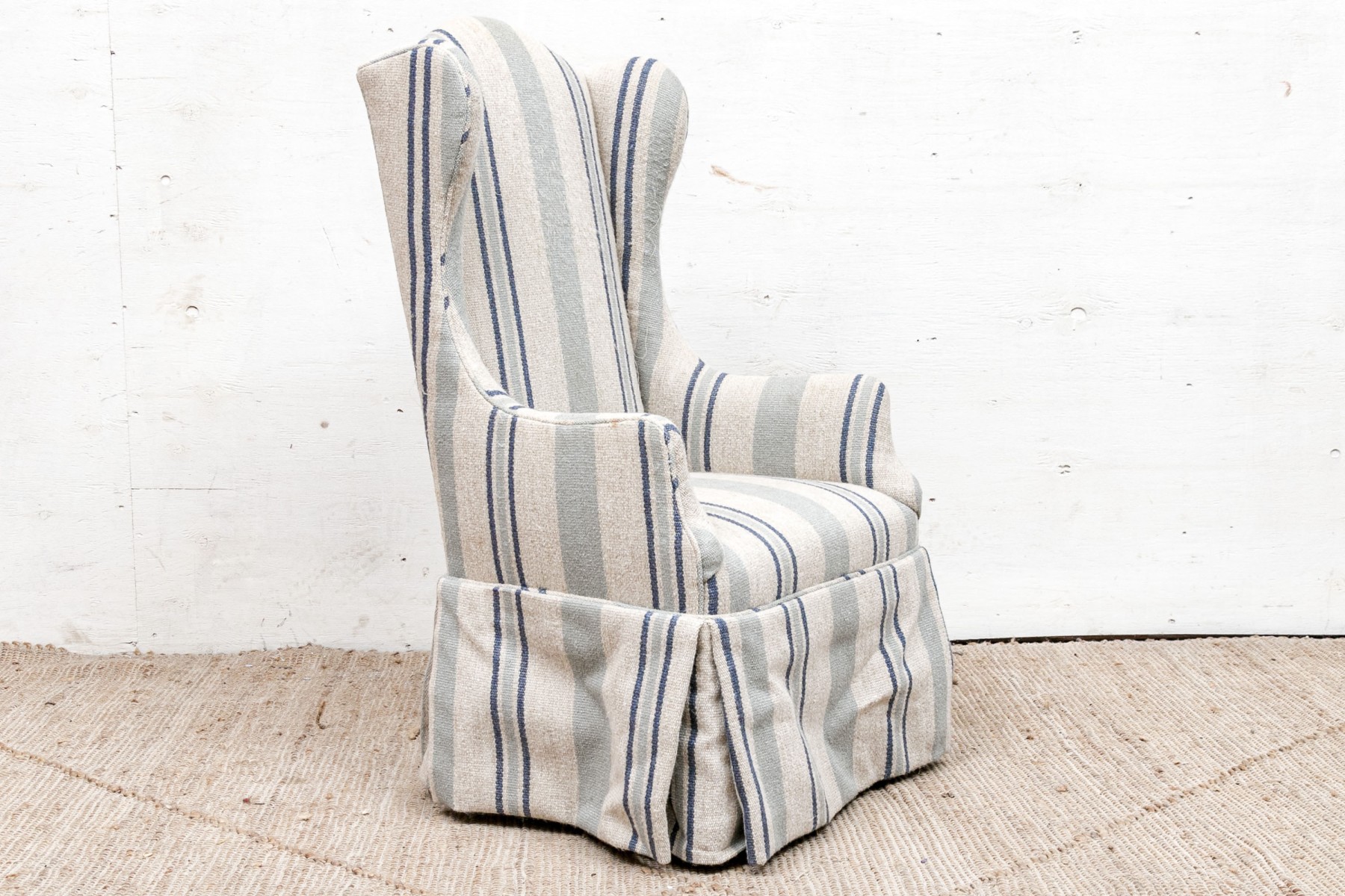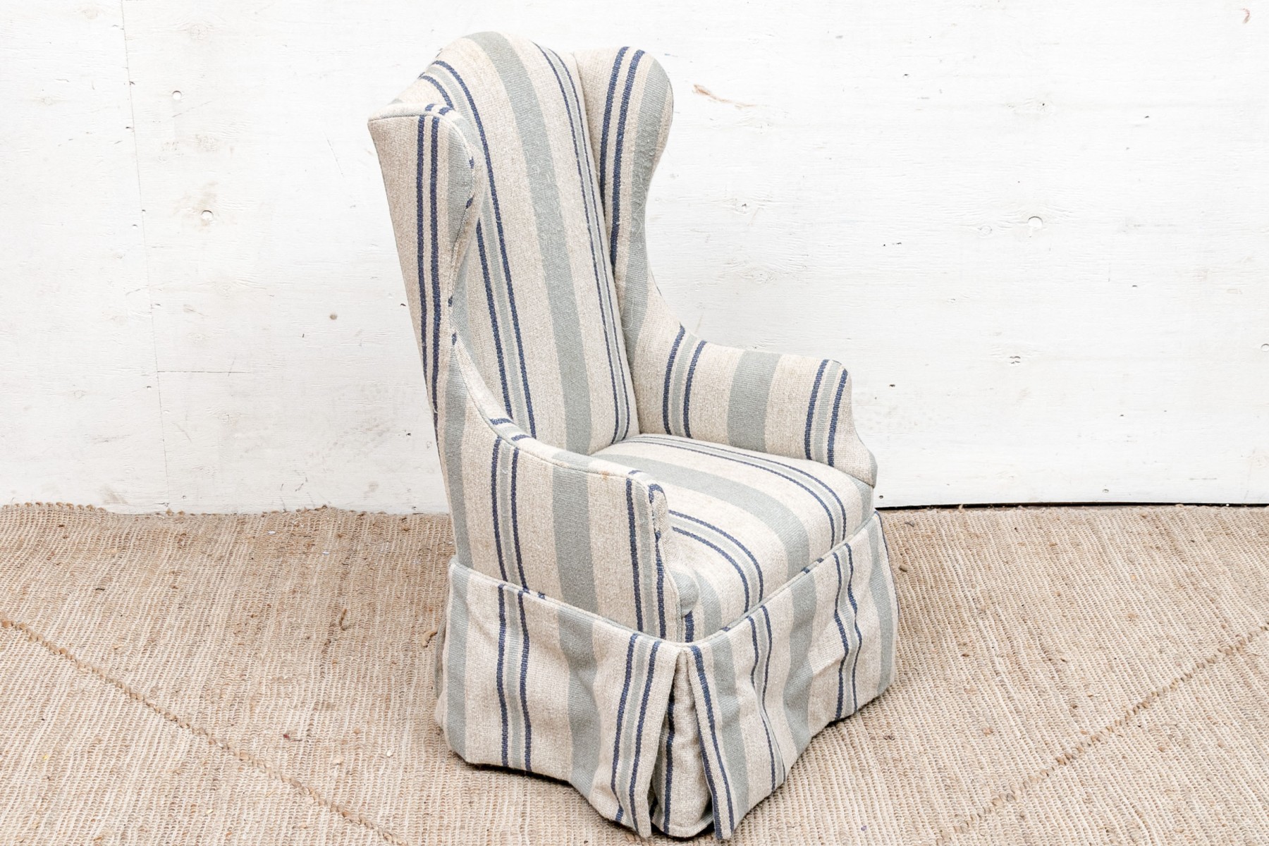 A diminutive size wing chair with curved crest rail and raised on square wood legs. Upholstered in a pale green and blue stripe on beige wool type fabric. With a tailored skirt.