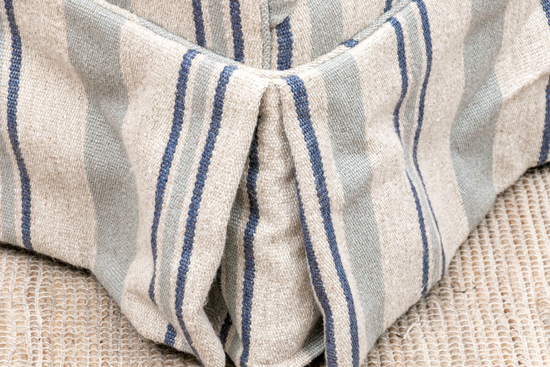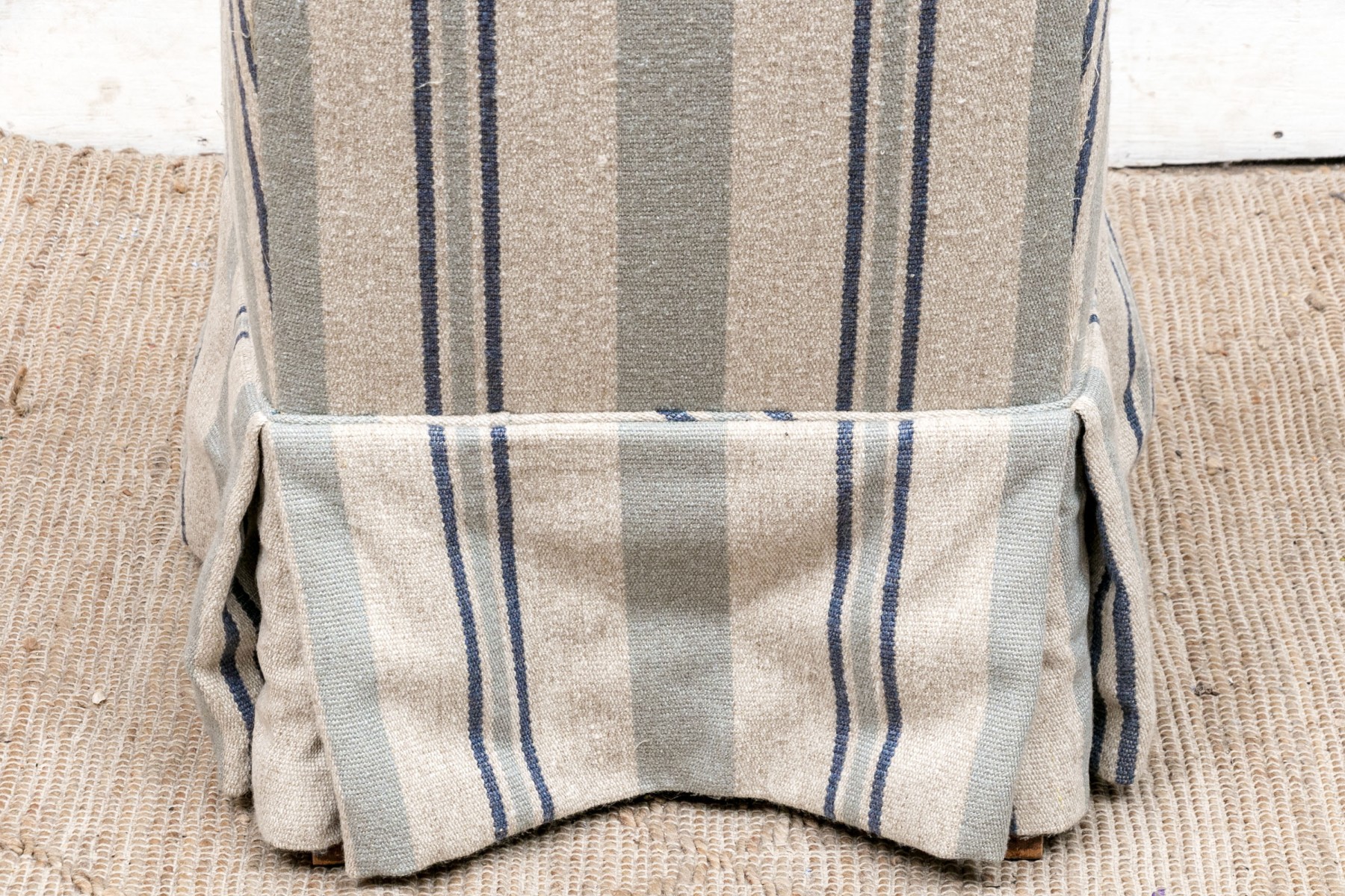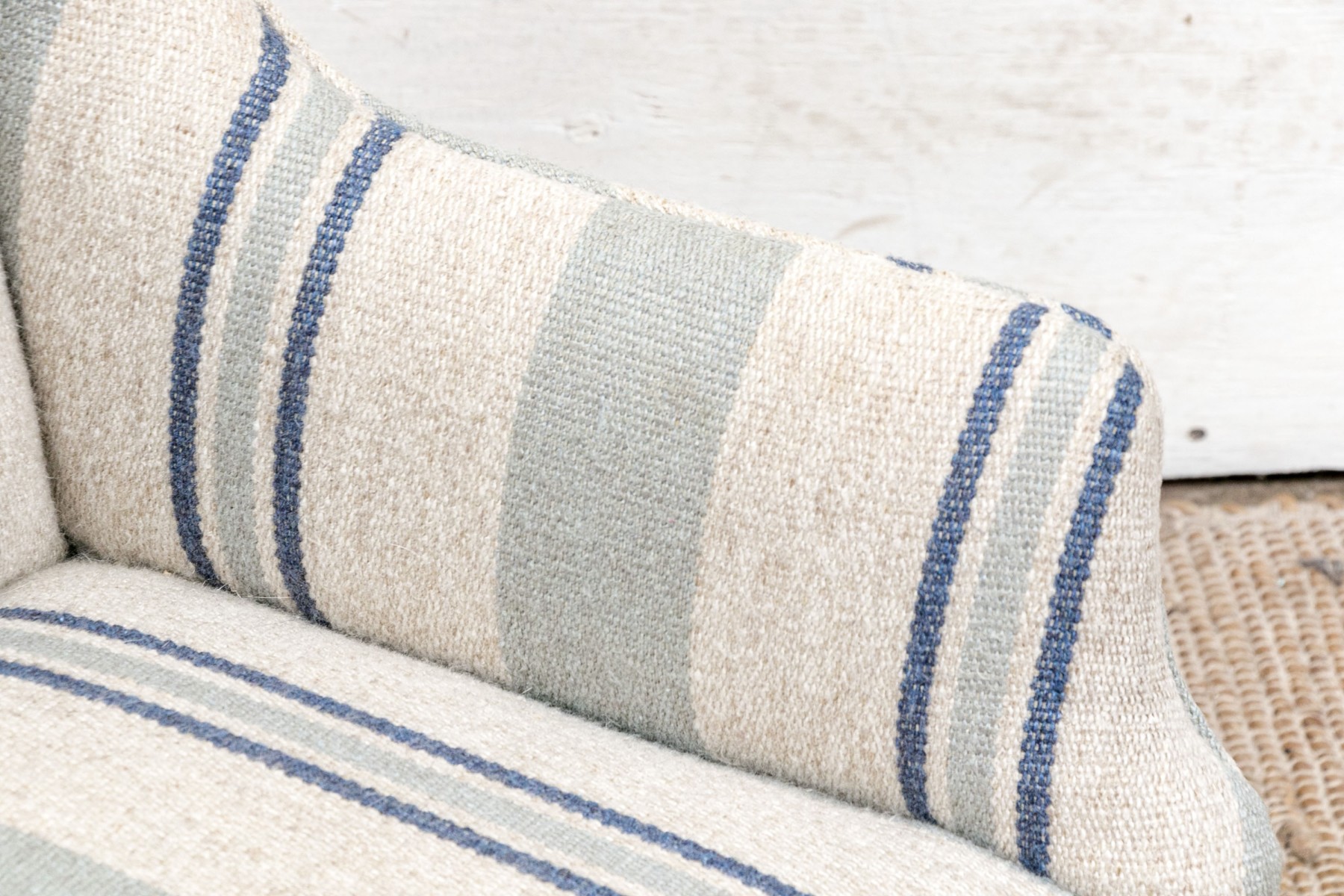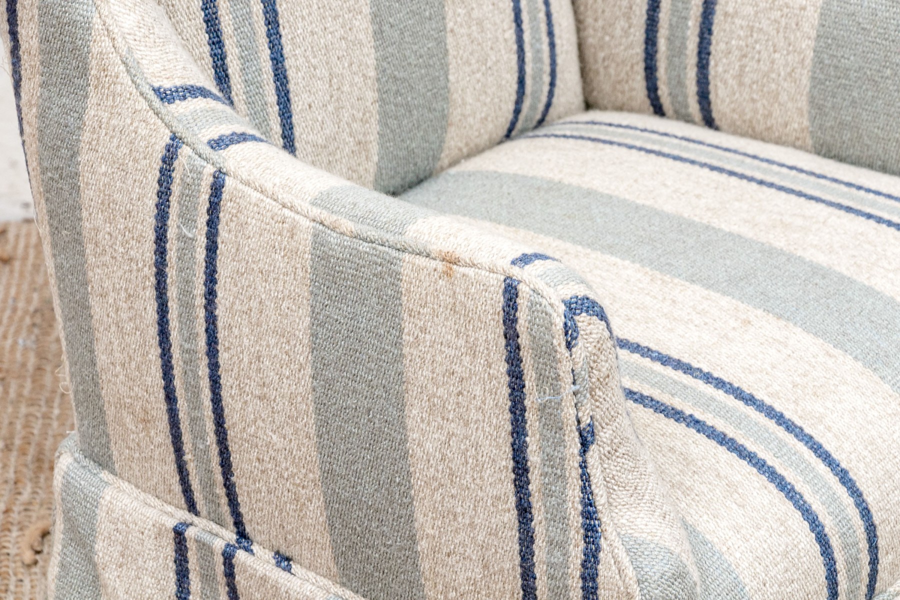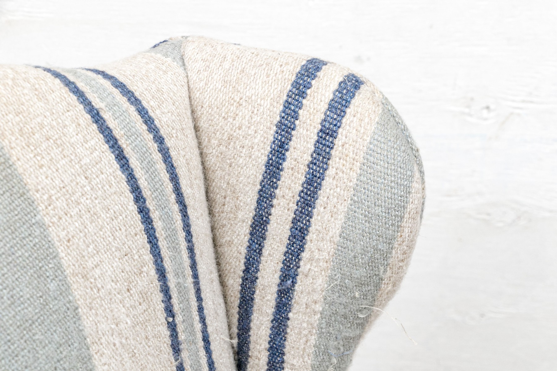 A diminutive size wing chair with curved crest rail and raised on square wood legs. Upholstered in a pale green and blue stripe on beige wool type fabric. With a tailored skirt.
