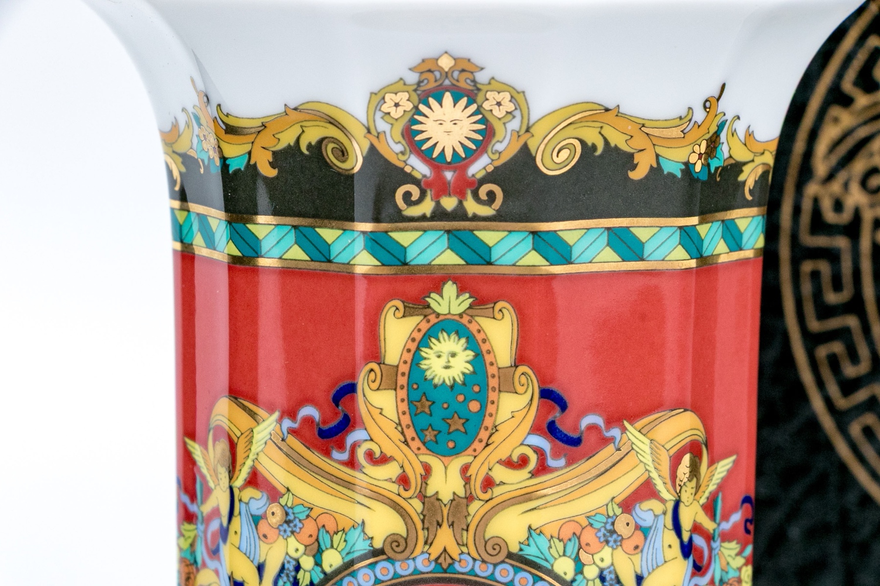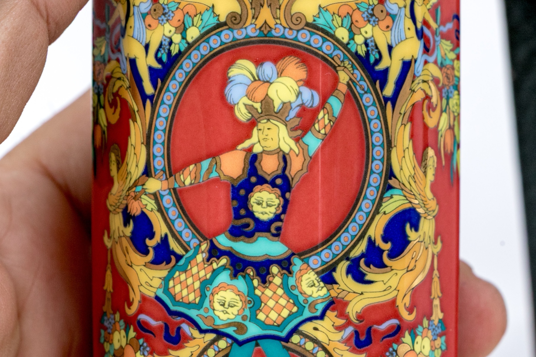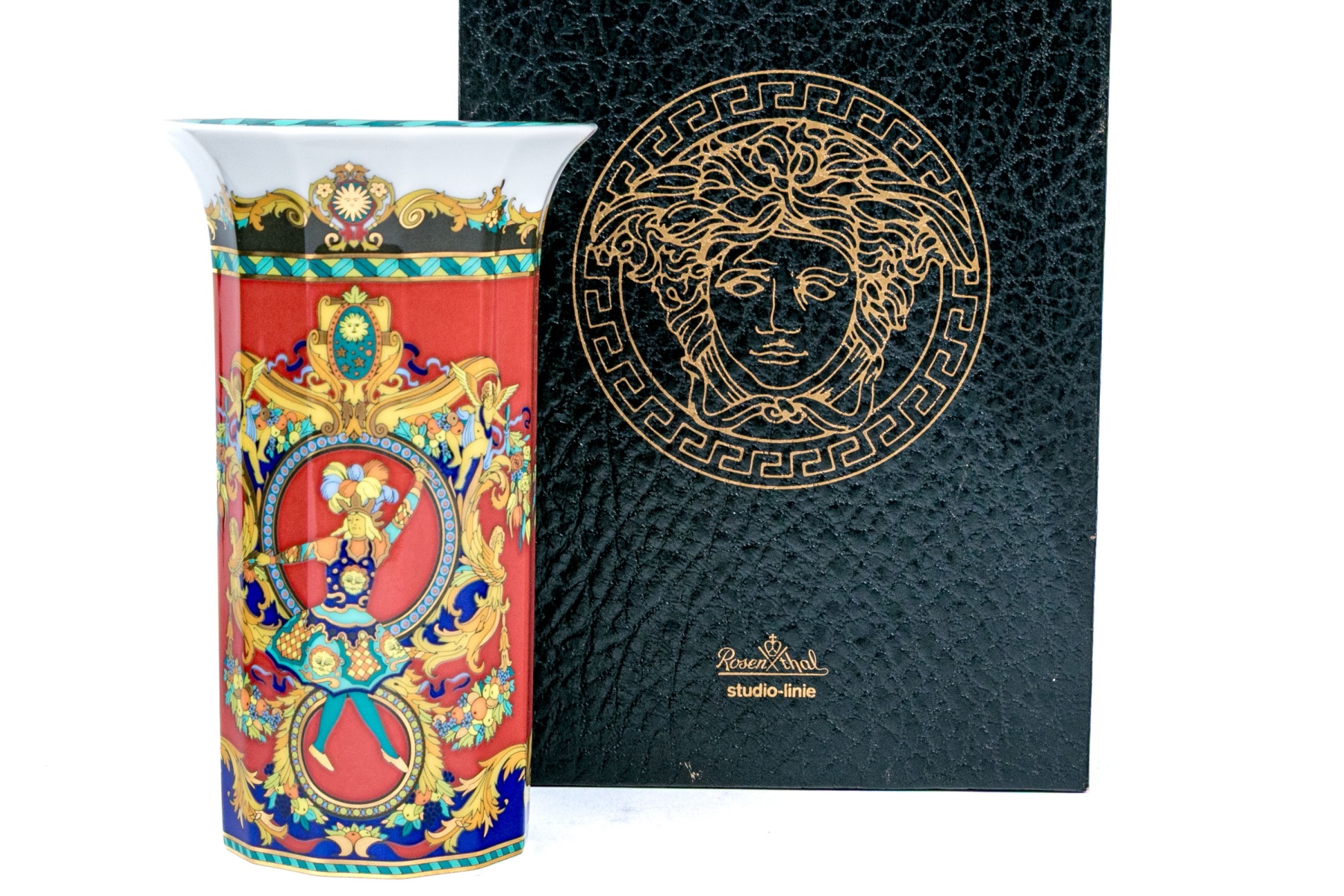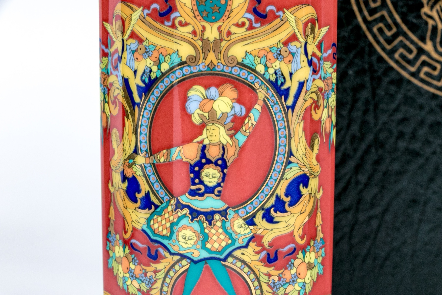 A faceted round vase with flared rim decorated with a king Louis XIV the Sun King style elaborately framed dancer figure. Presented in a Versace style Rosenthal black and gilt box.