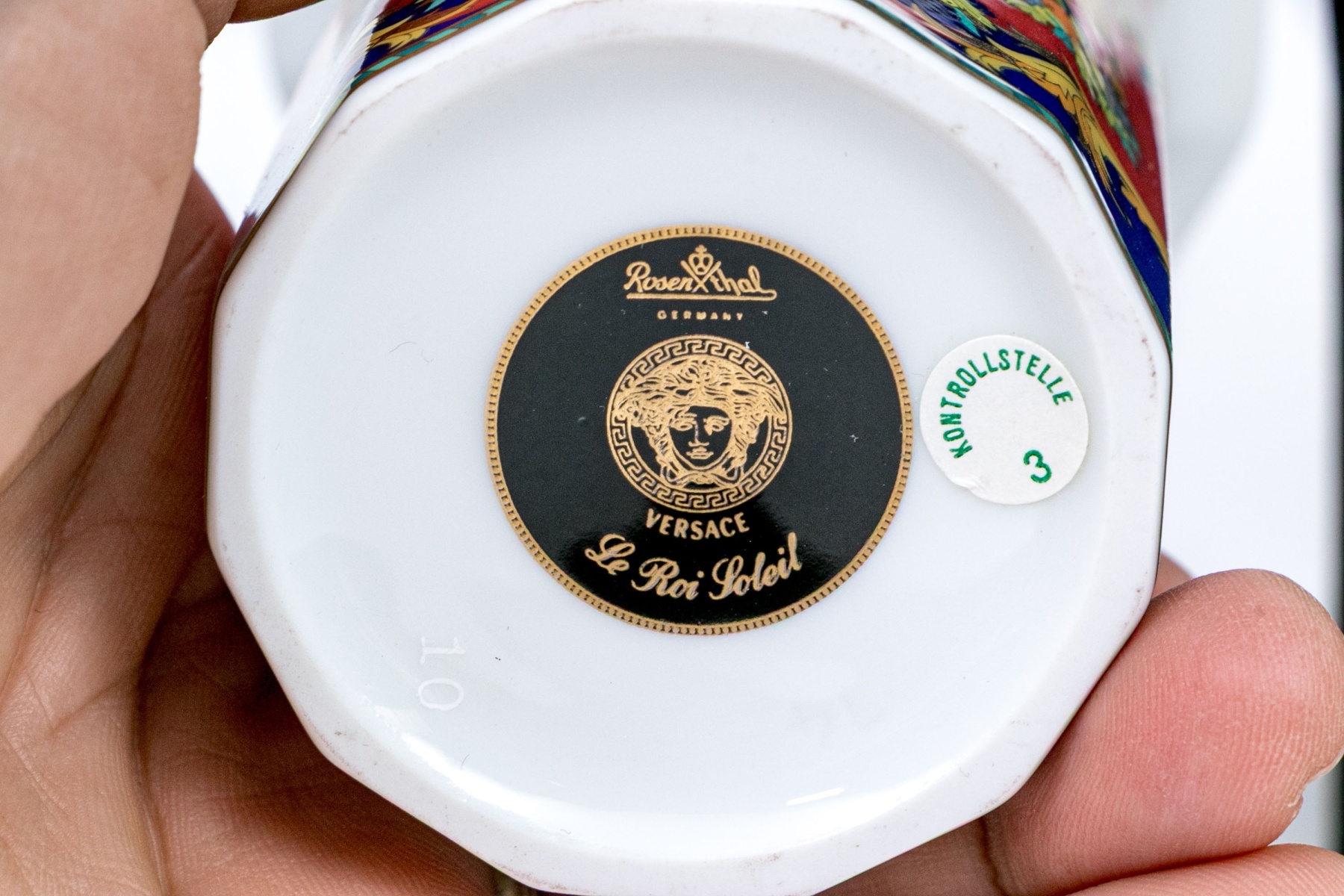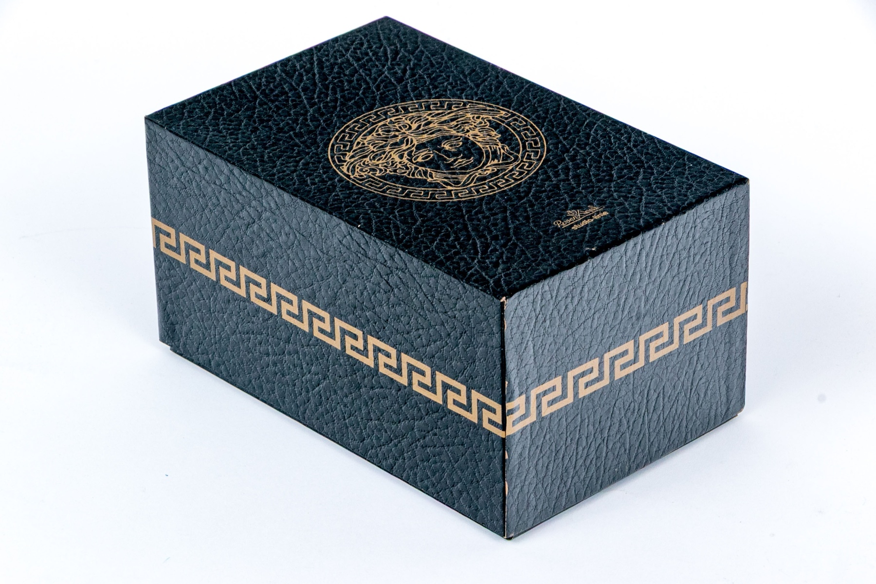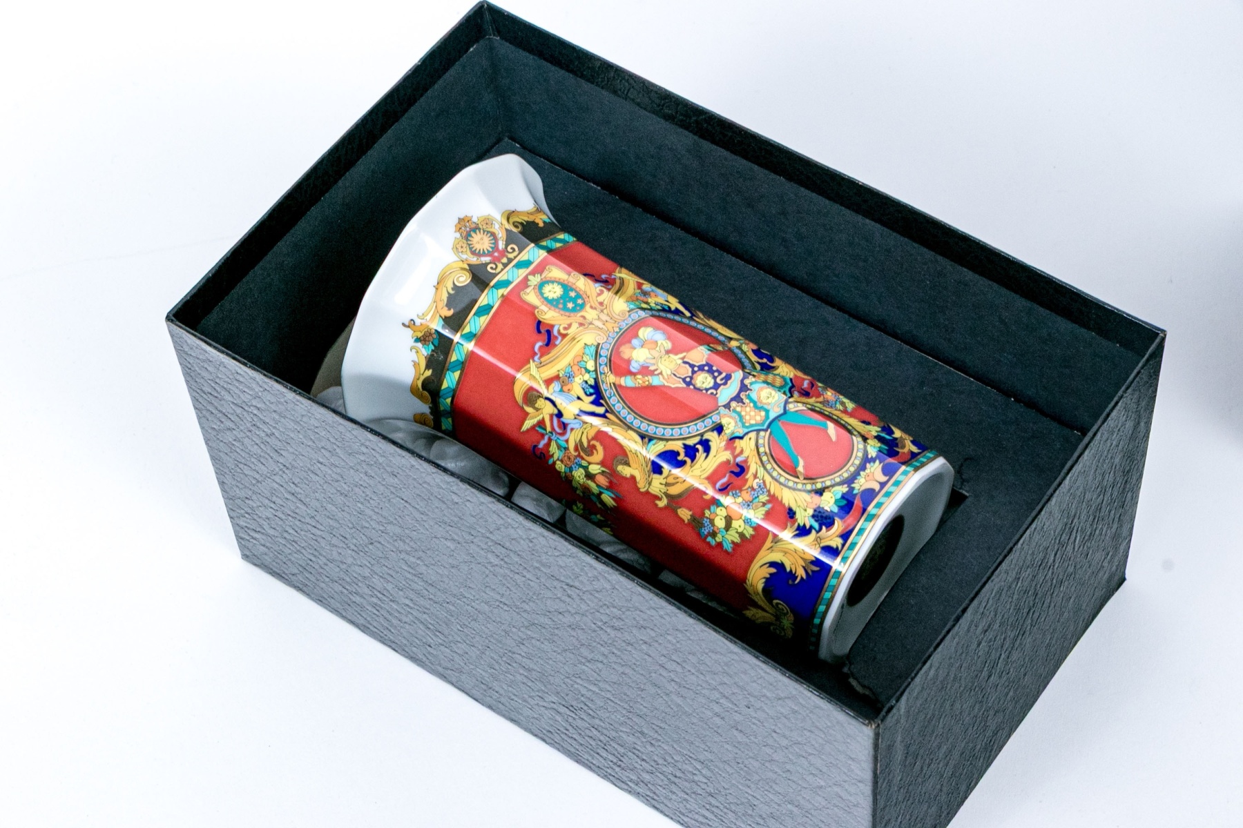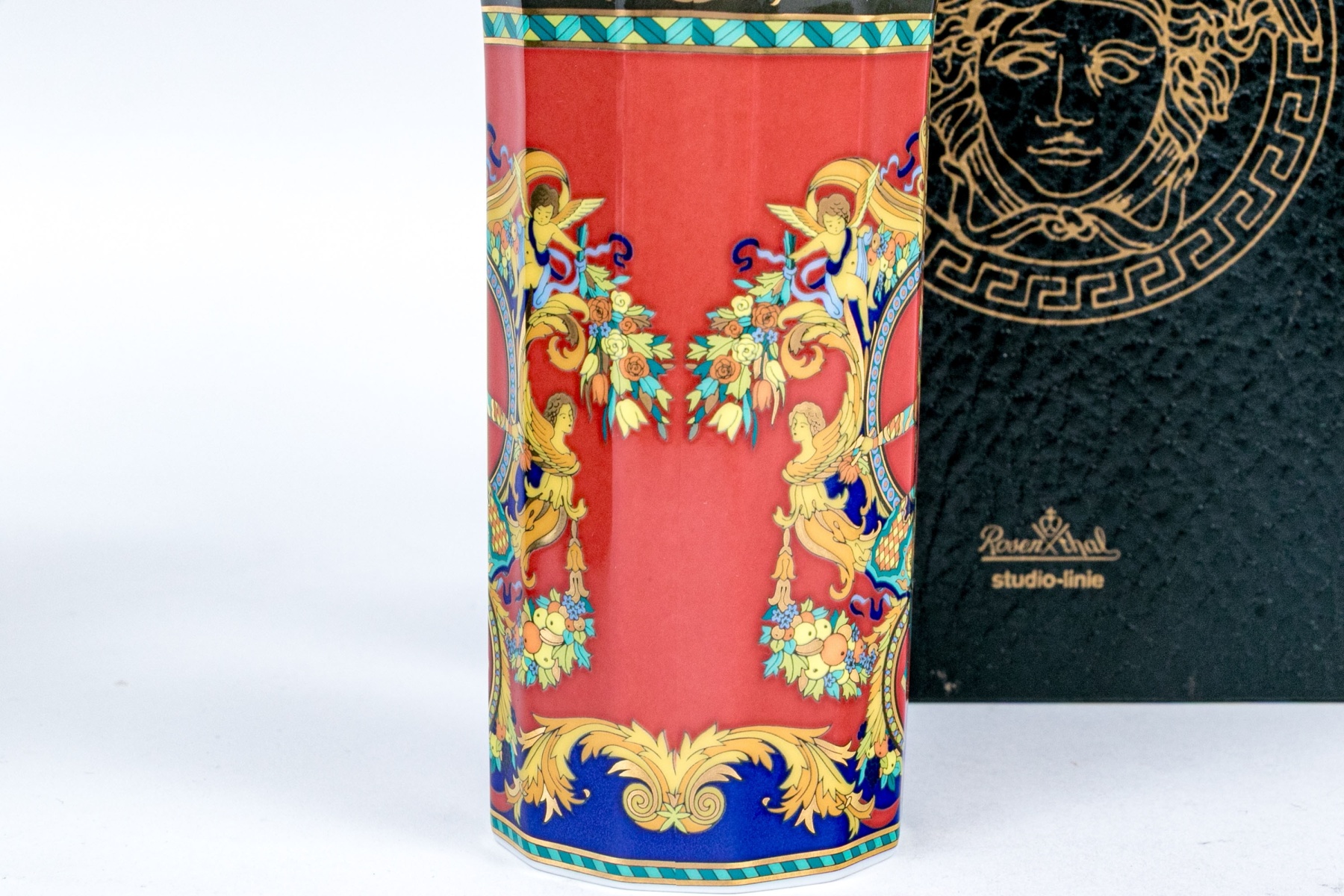 A faceted round vase with flared rim decorated with a king Louis XIV the Sun King style elaborately framed dancer figure. Presented in a Versace style Rosenthal black and gilt box.