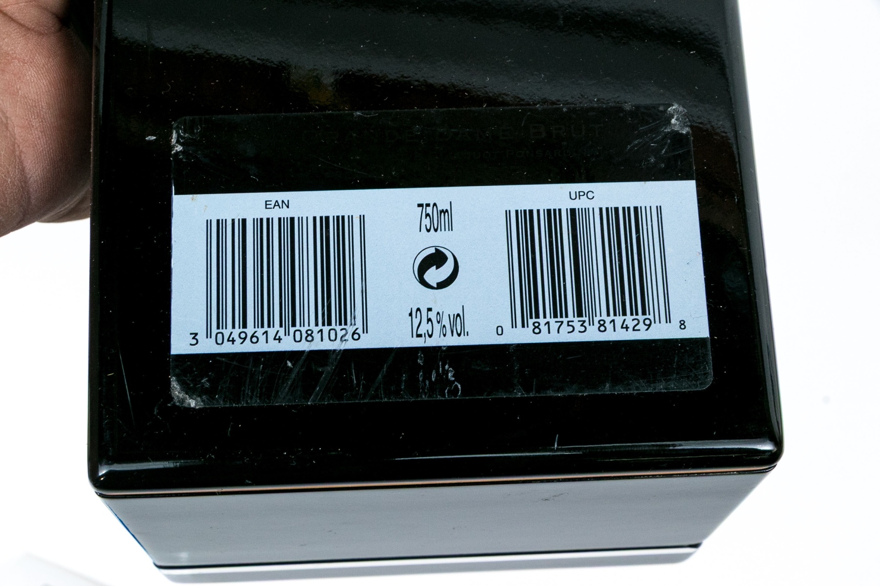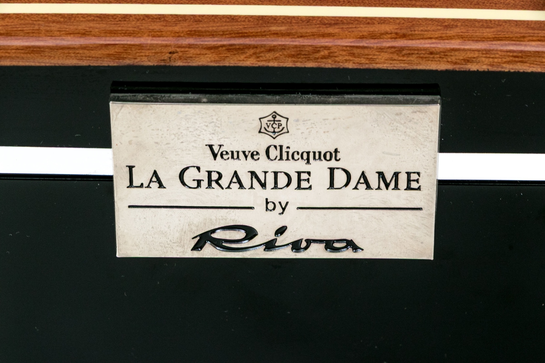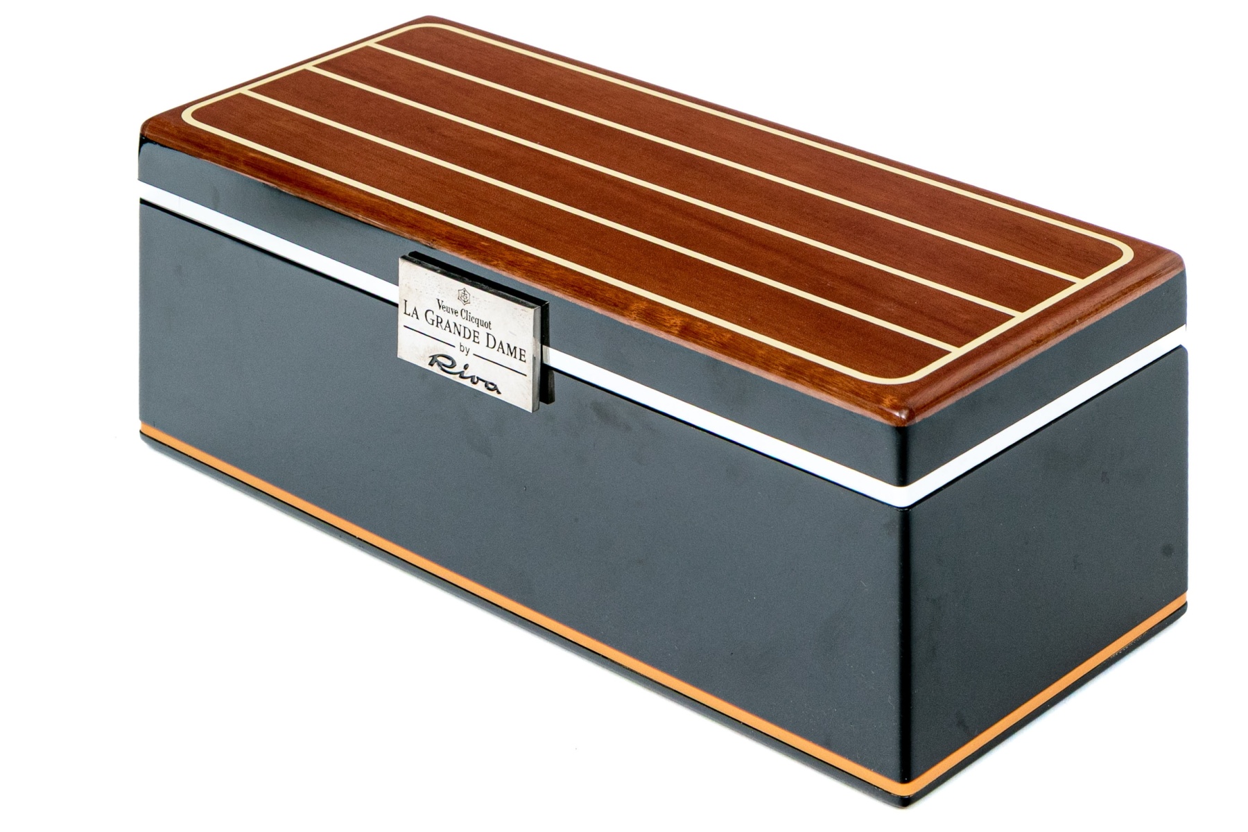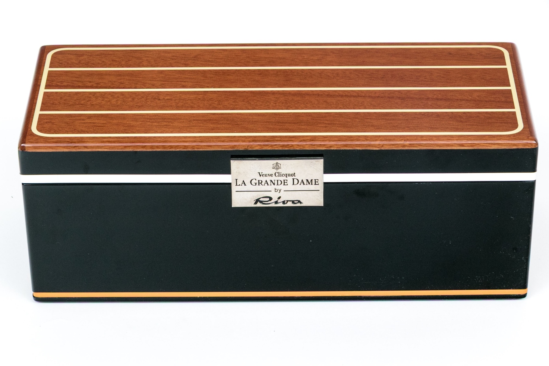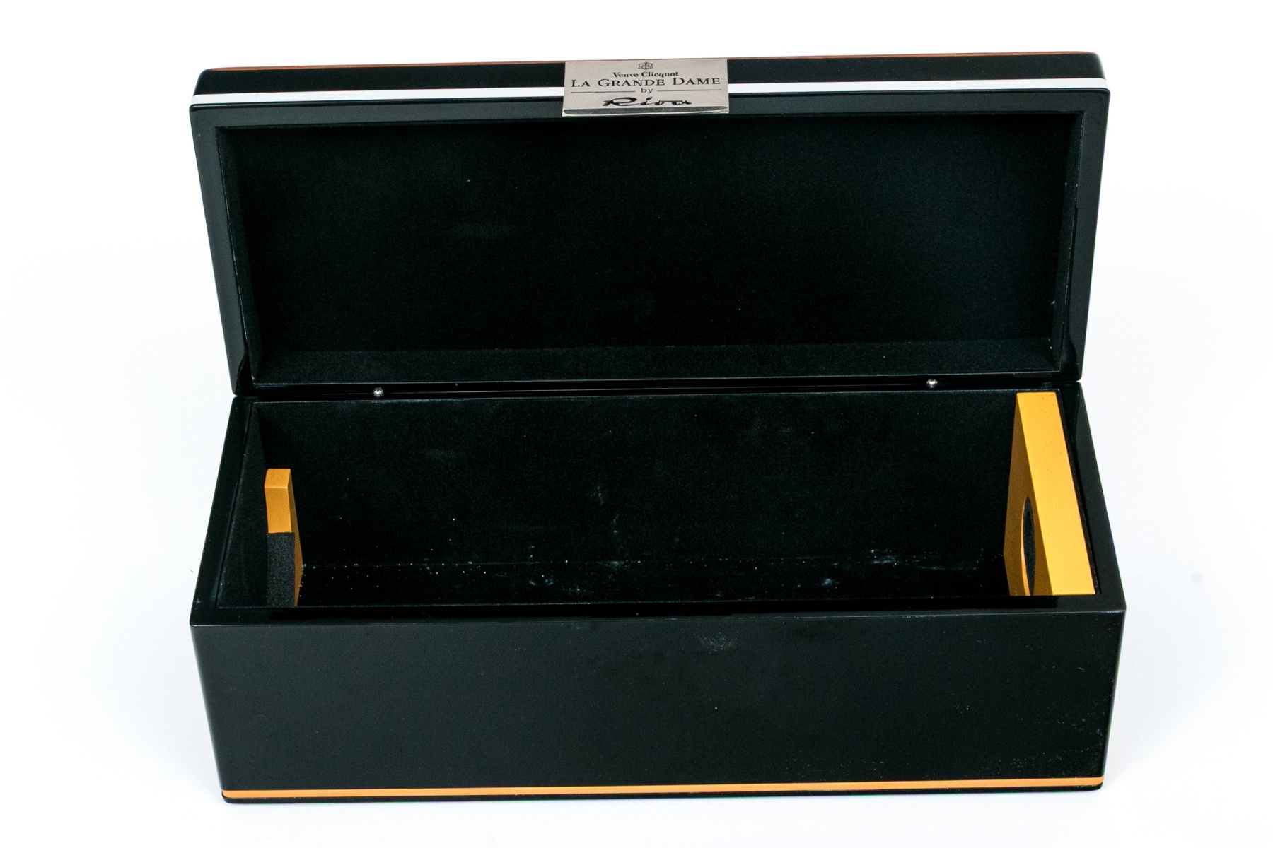 A designer lacquered presentation box for the famous Grand Dame Brut champagne bottle. 75ml. Fabric lined.