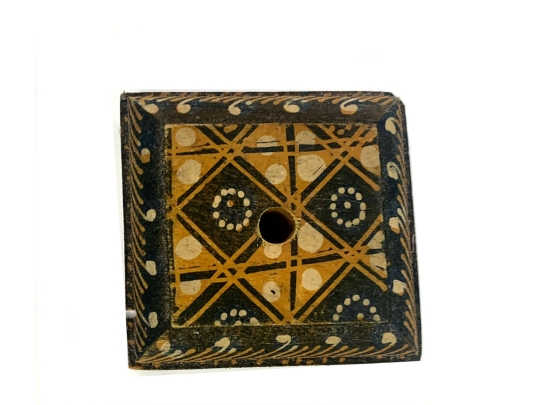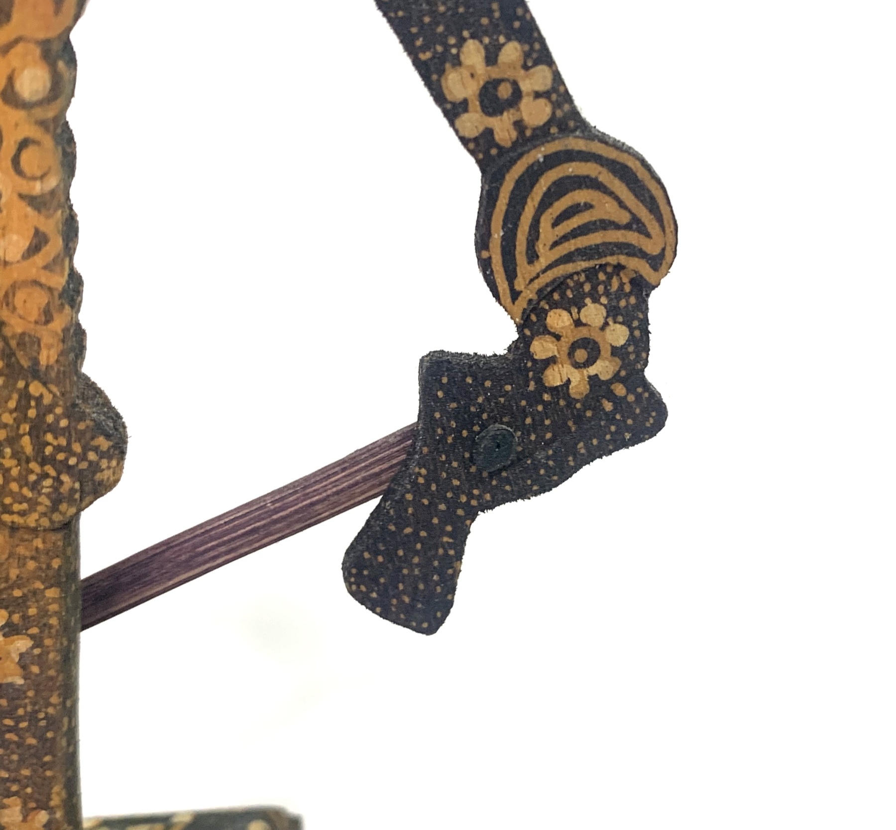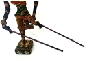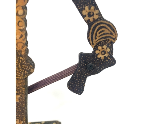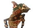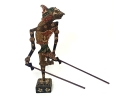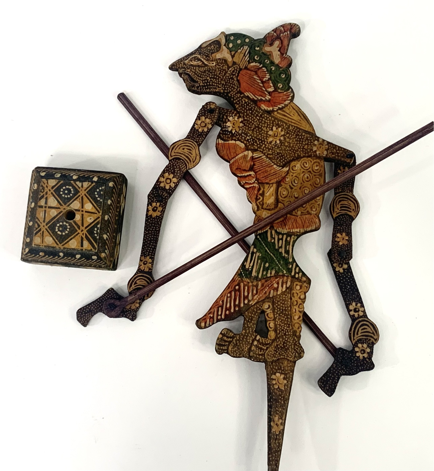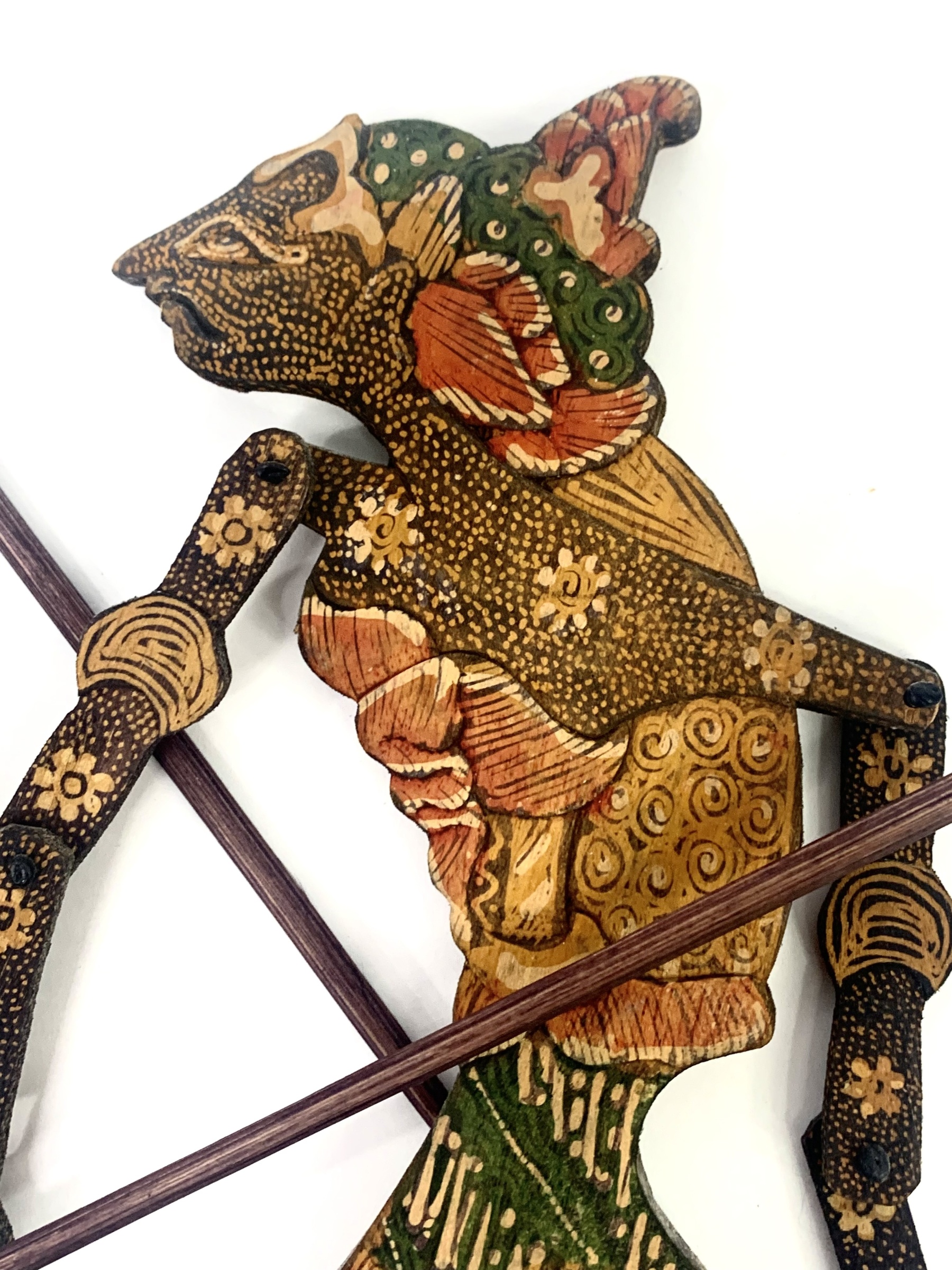 Vintage Indonesian shadow puppet intricately hand painted and articulated at the shoulders, elbow and hand. The puppet comes with a square hand-painted stand.