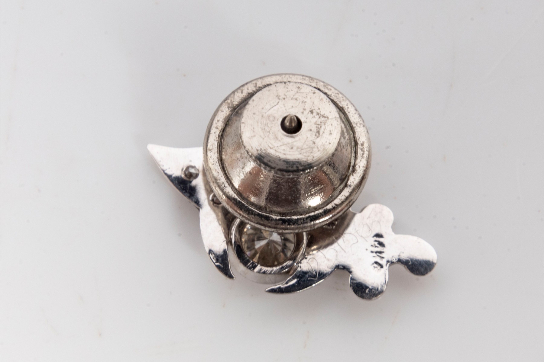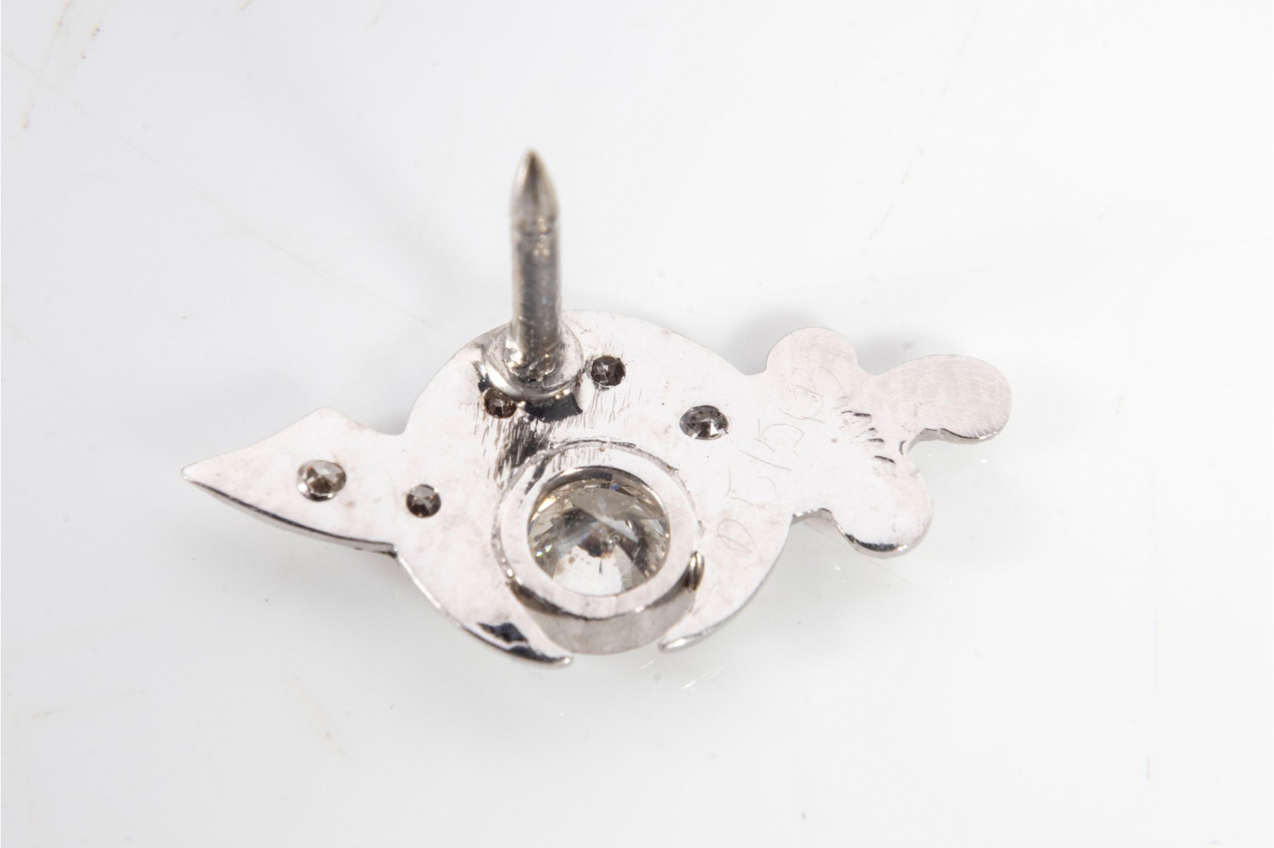 A vintage white gold tie-tac emboldened by a single round cut diamond, prong mounted -- weighing in at approximately 0.90 carat. See photos for details. Original 1980's appraisal included.