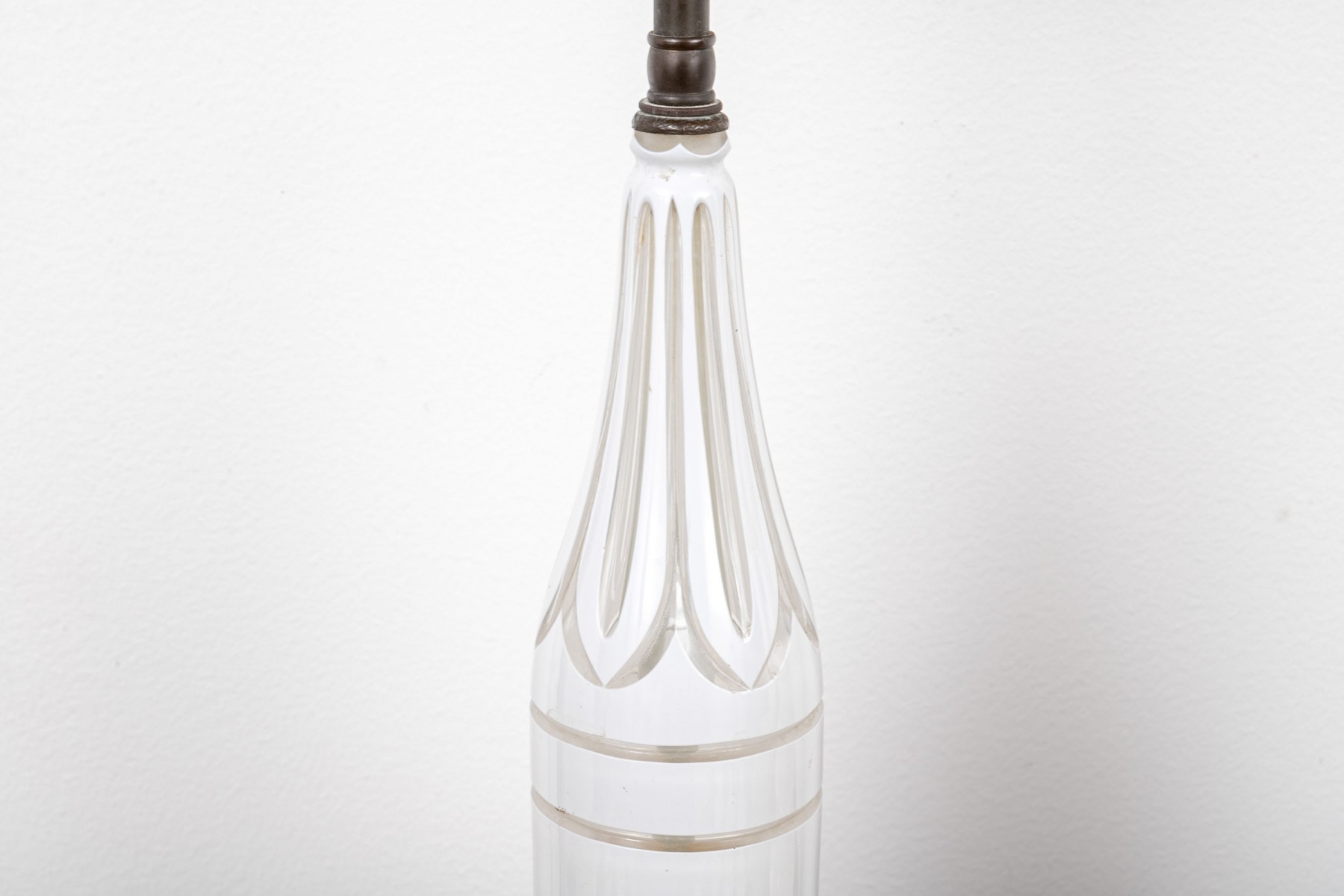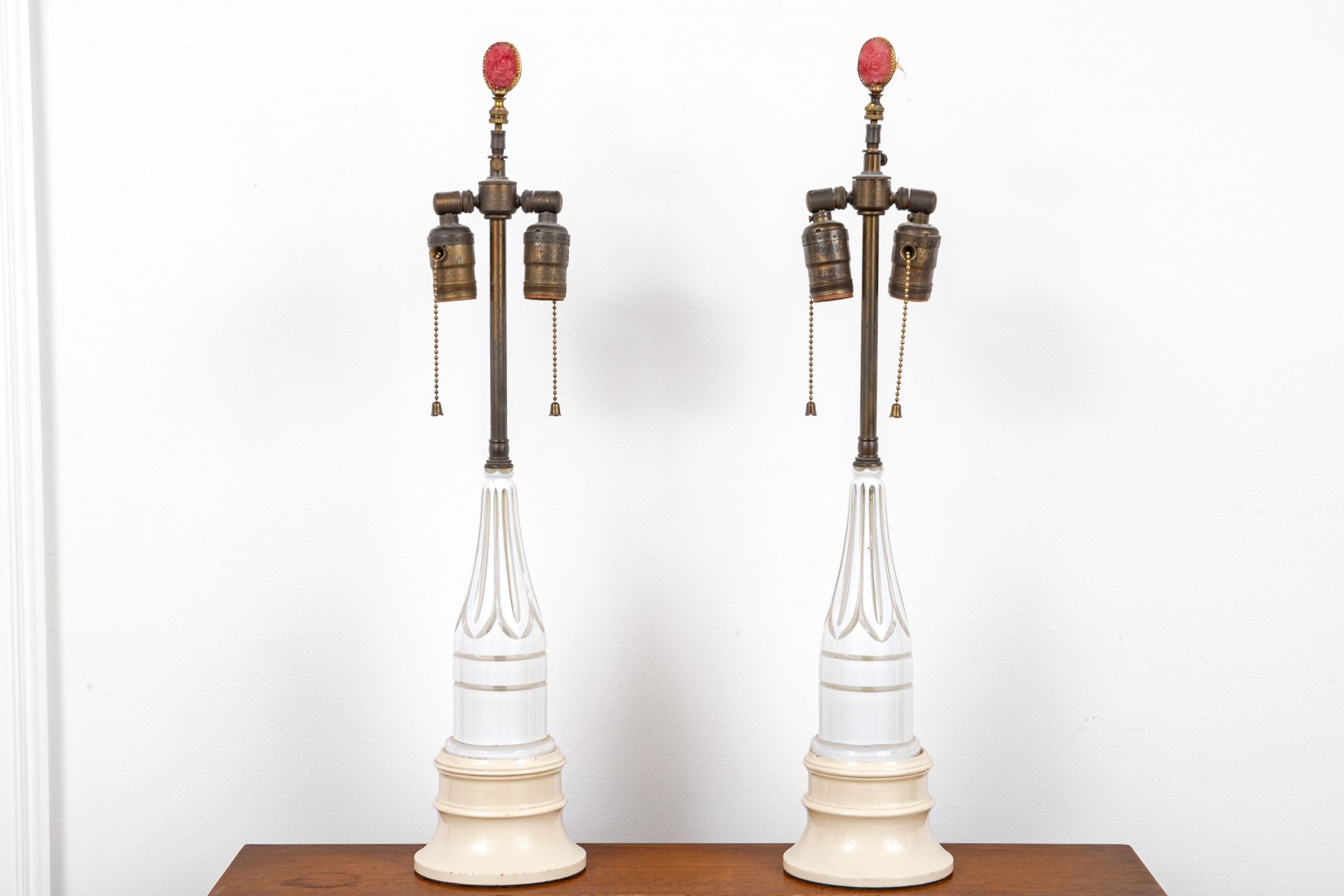 A beautiful pair of vintage table lamps displaying double-sockets on bronzetoned columns leading to dramatically tapered white-to-clear cut glass bodies over simply detailed cream lacquered bases. Topped with red stone finials.