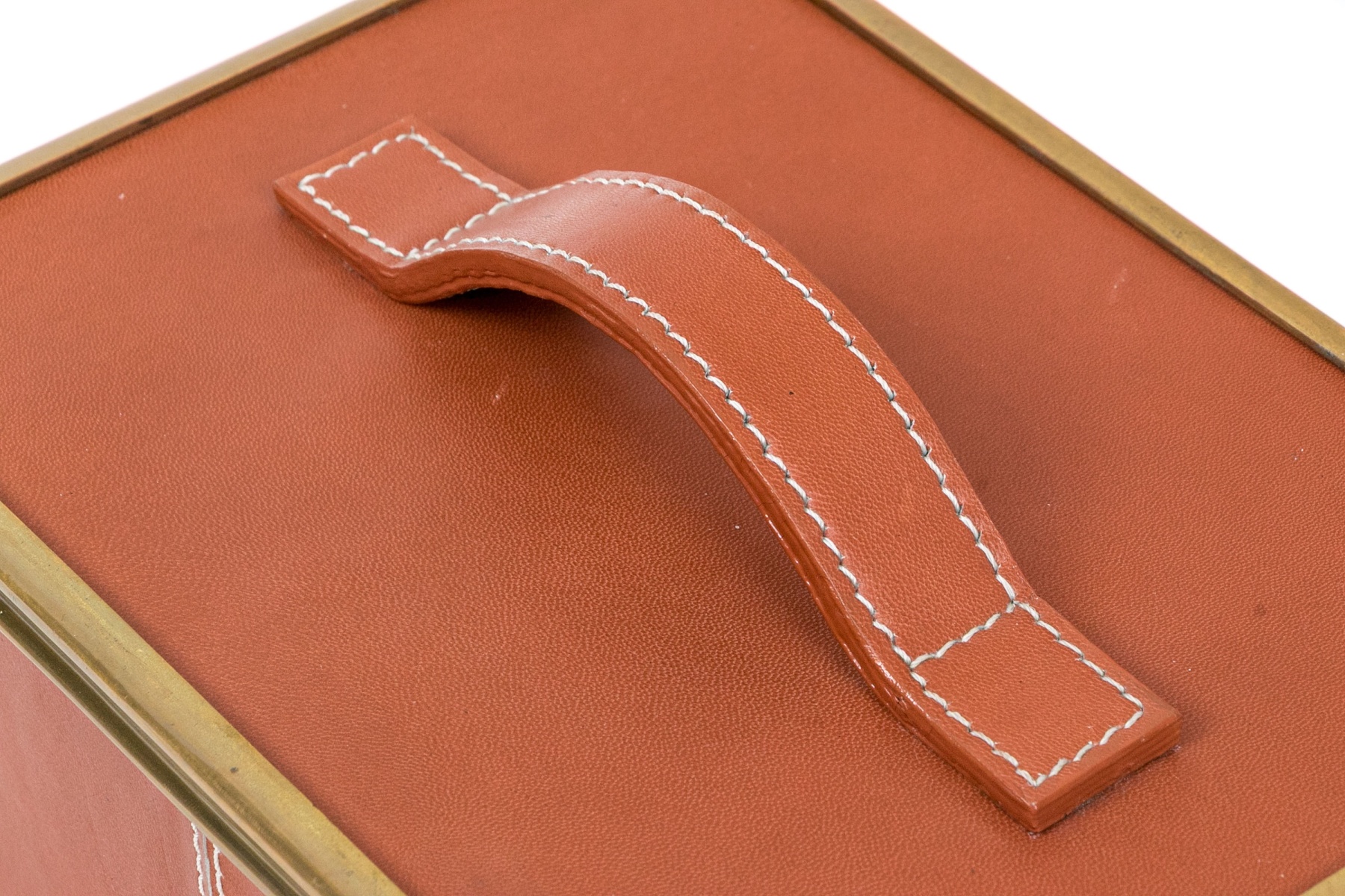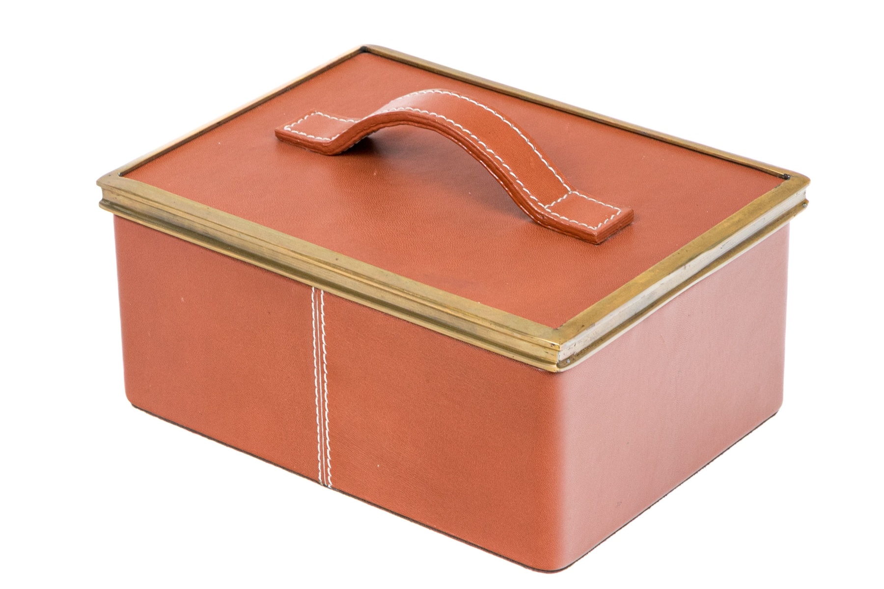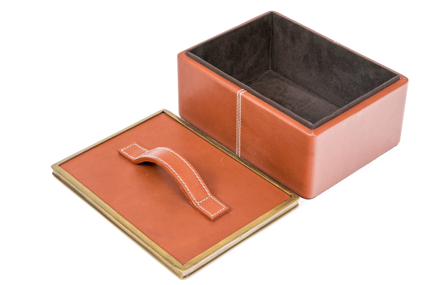 A fine tan leather rectangular box with a separate lid with brass edge and a top handle. All lined in dark brown suede.
