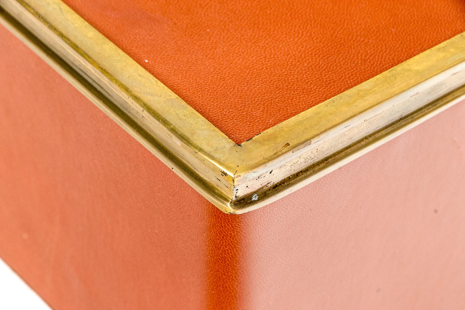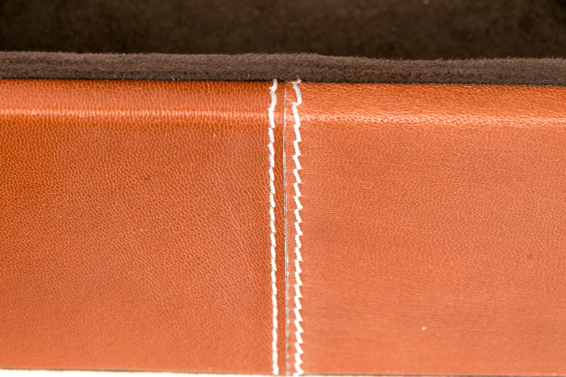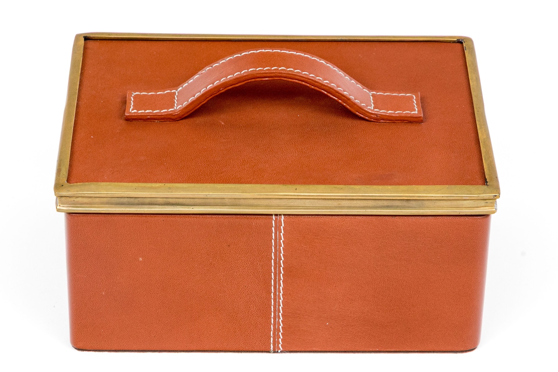 A fine tan leather rectangular box with a separate lid with brass edge and a top handle. All lined in dark brown suede.