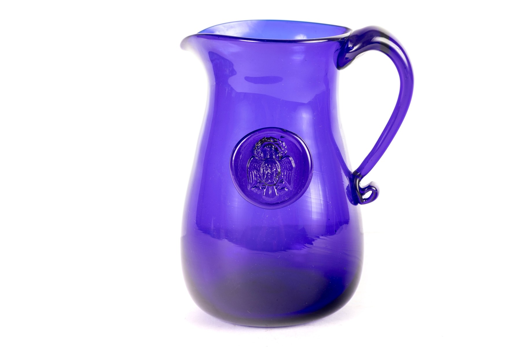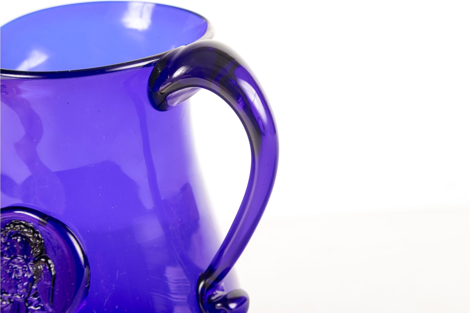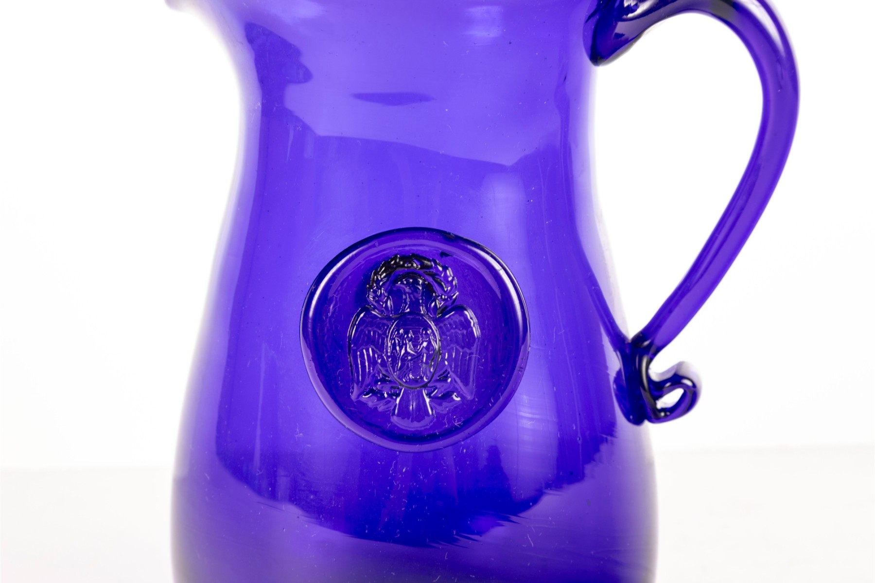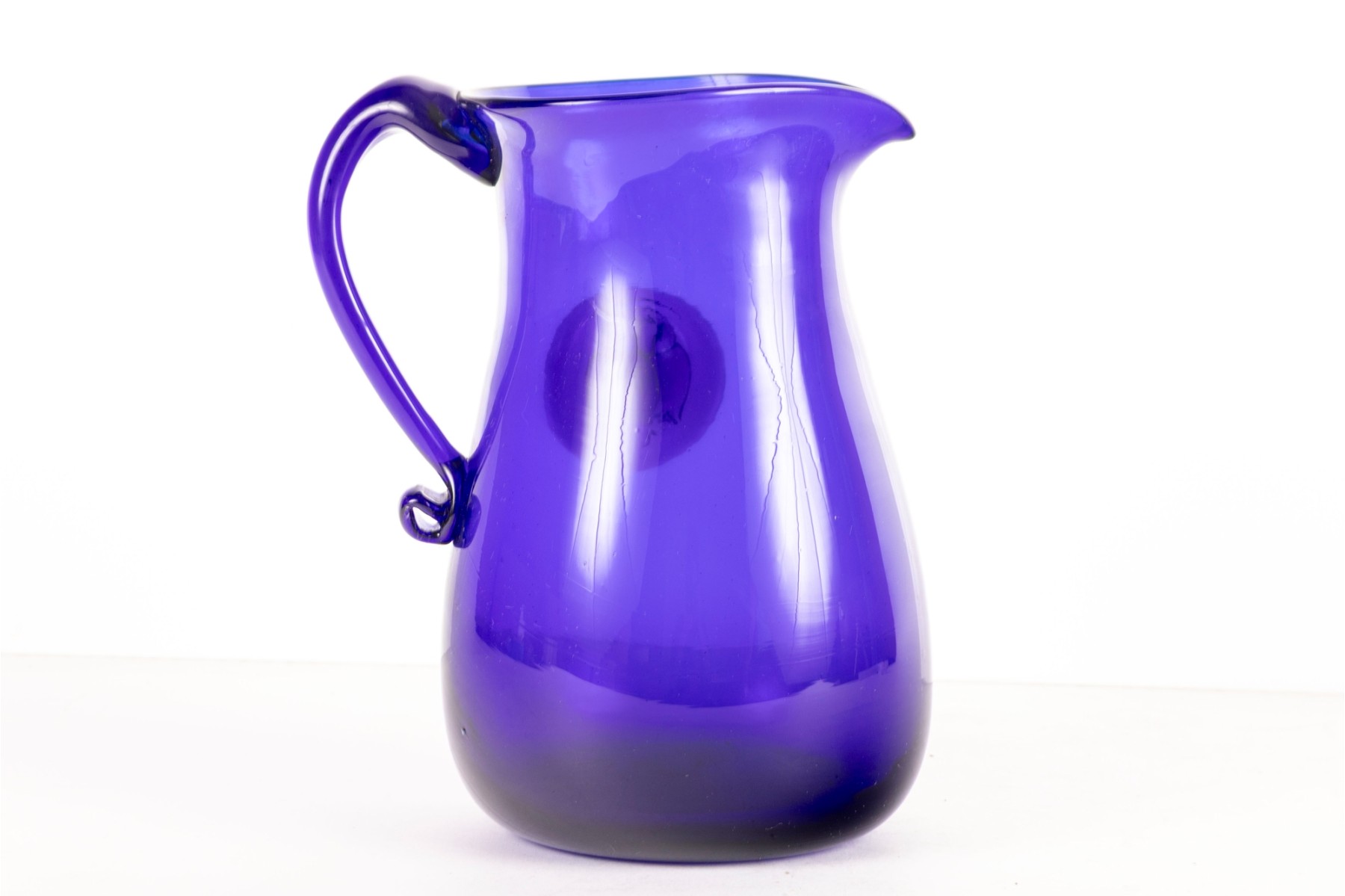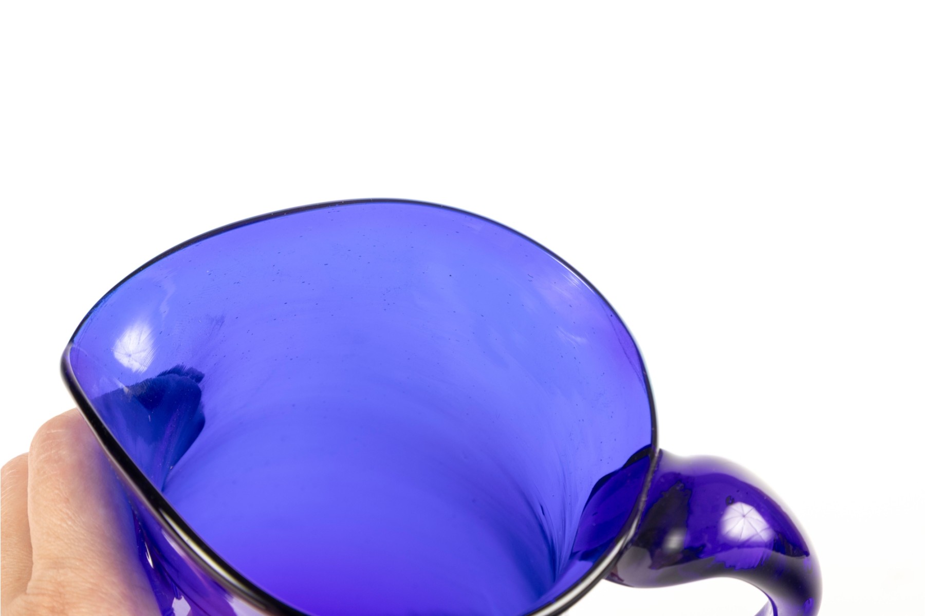 A striking, 8" tall, hand-blown cobalt blue glass pitcher from the 2016 Williamsburg Triennial, featuring a graceful, vintage-inspired form with a shaped handle and flared spout.
