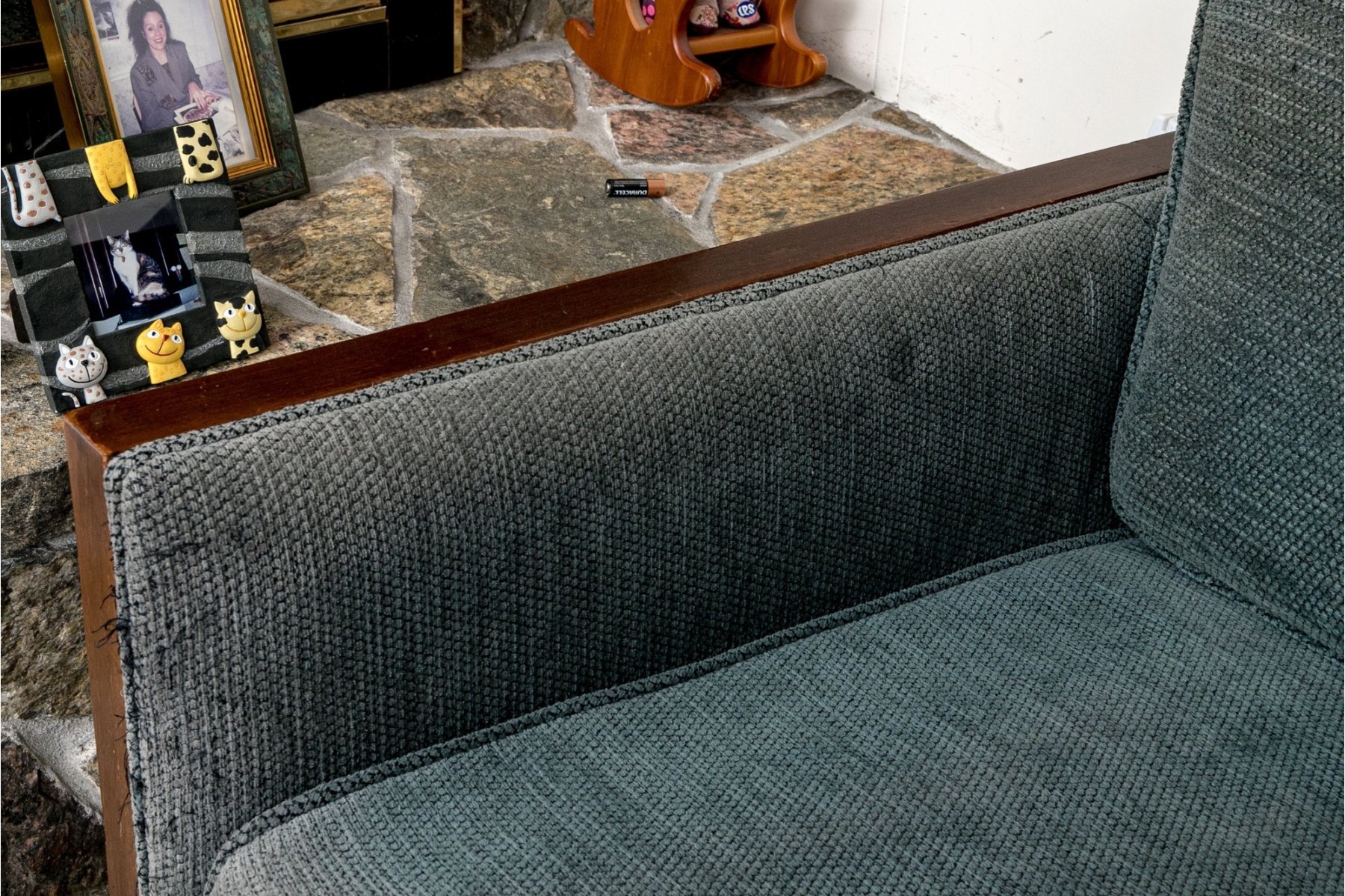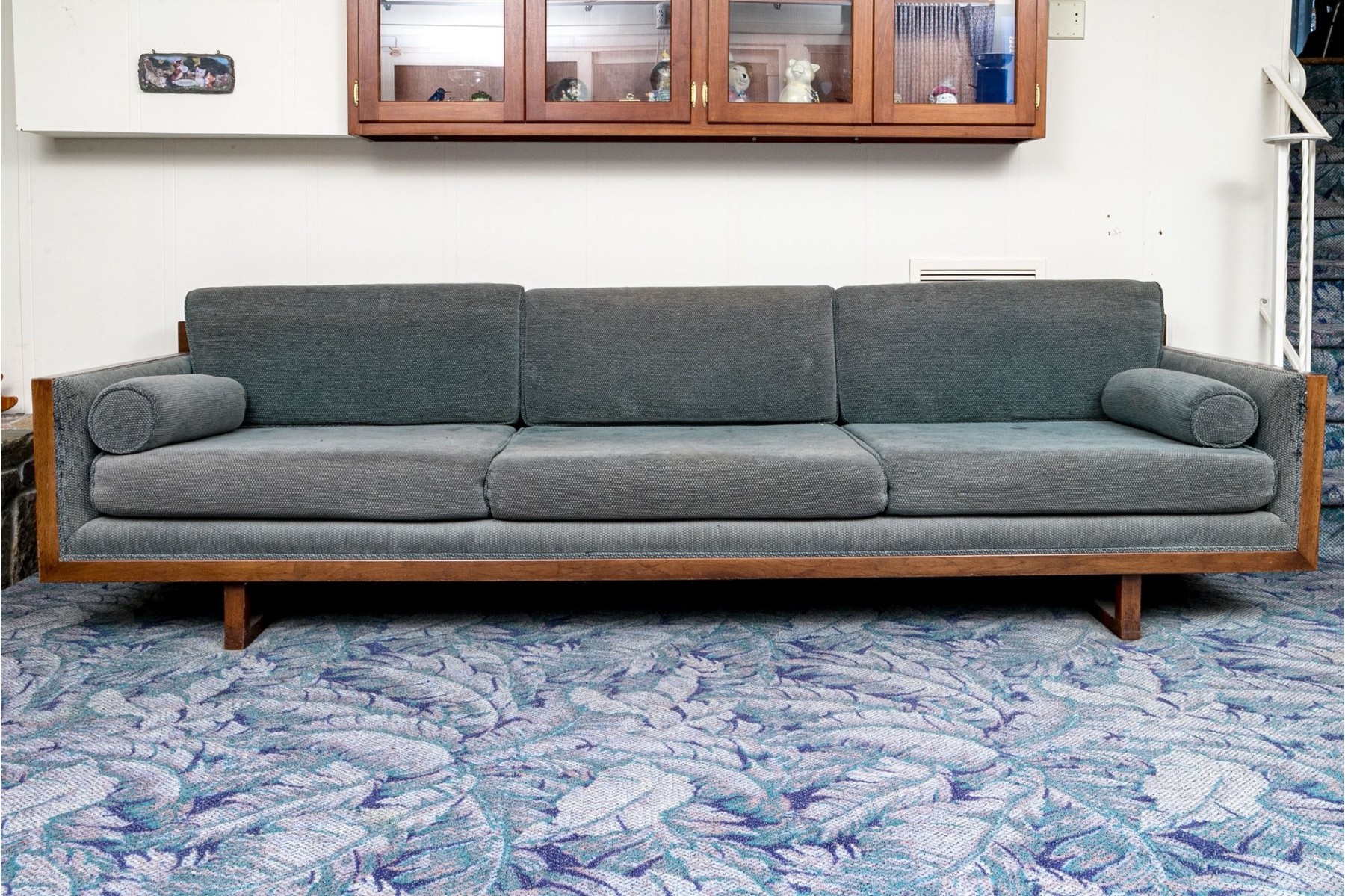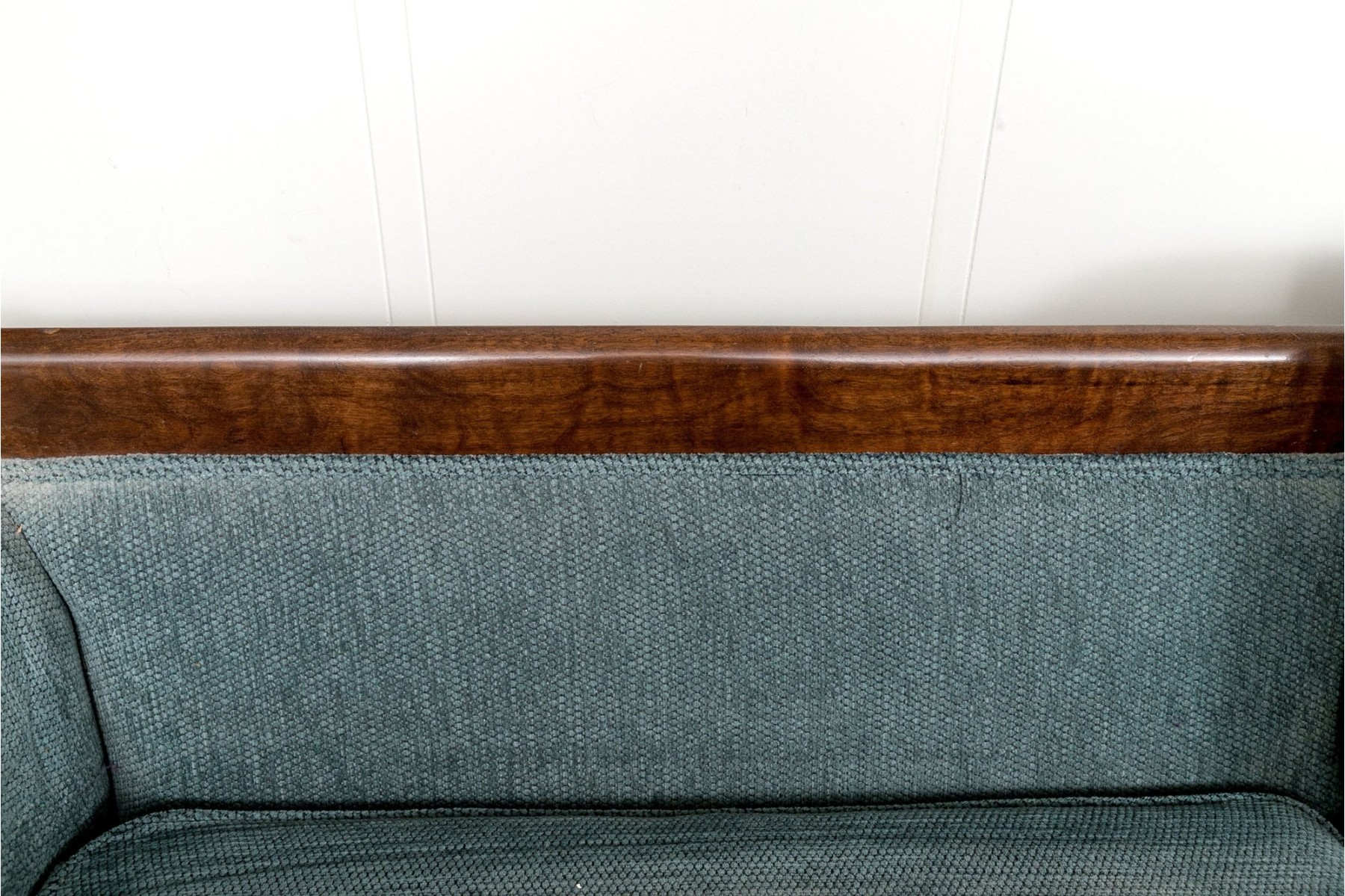 A handsome sofa overall. Some frayed threads along the edge of the right arm upholstery and minor finish wear to the frame.