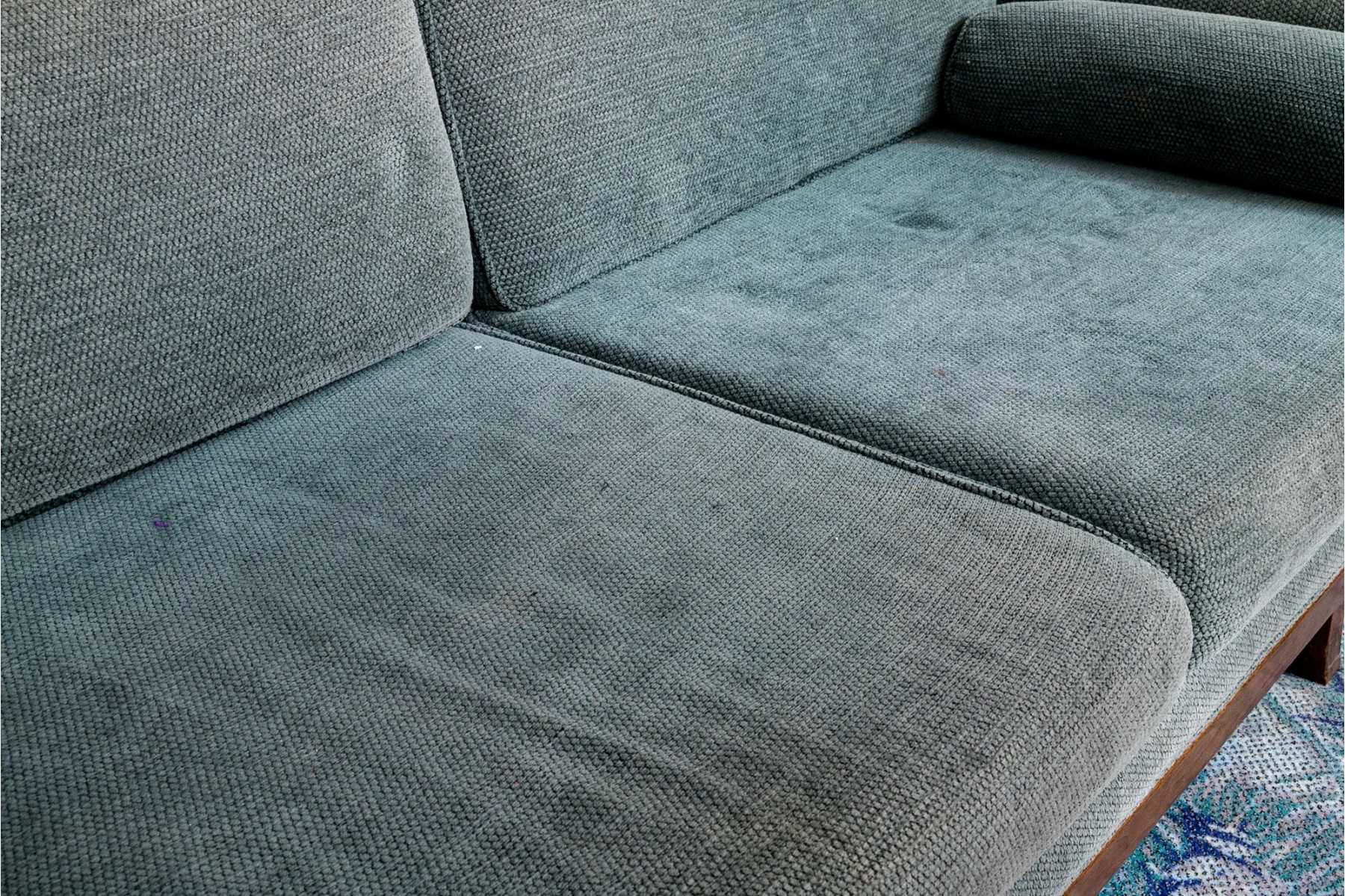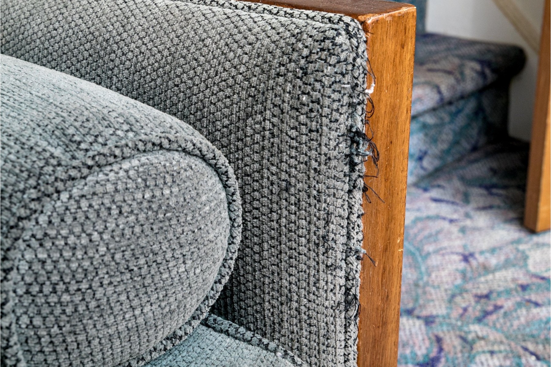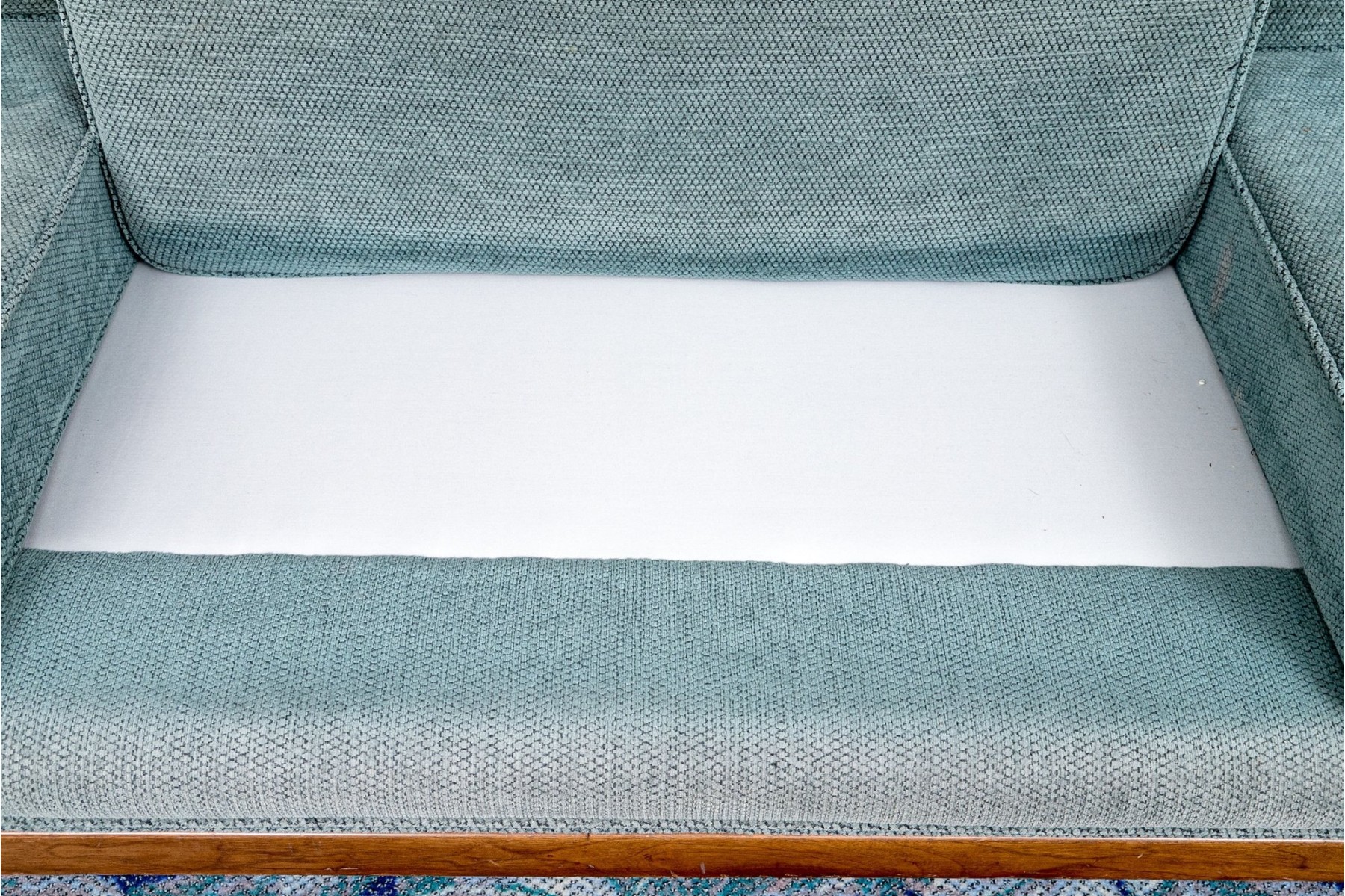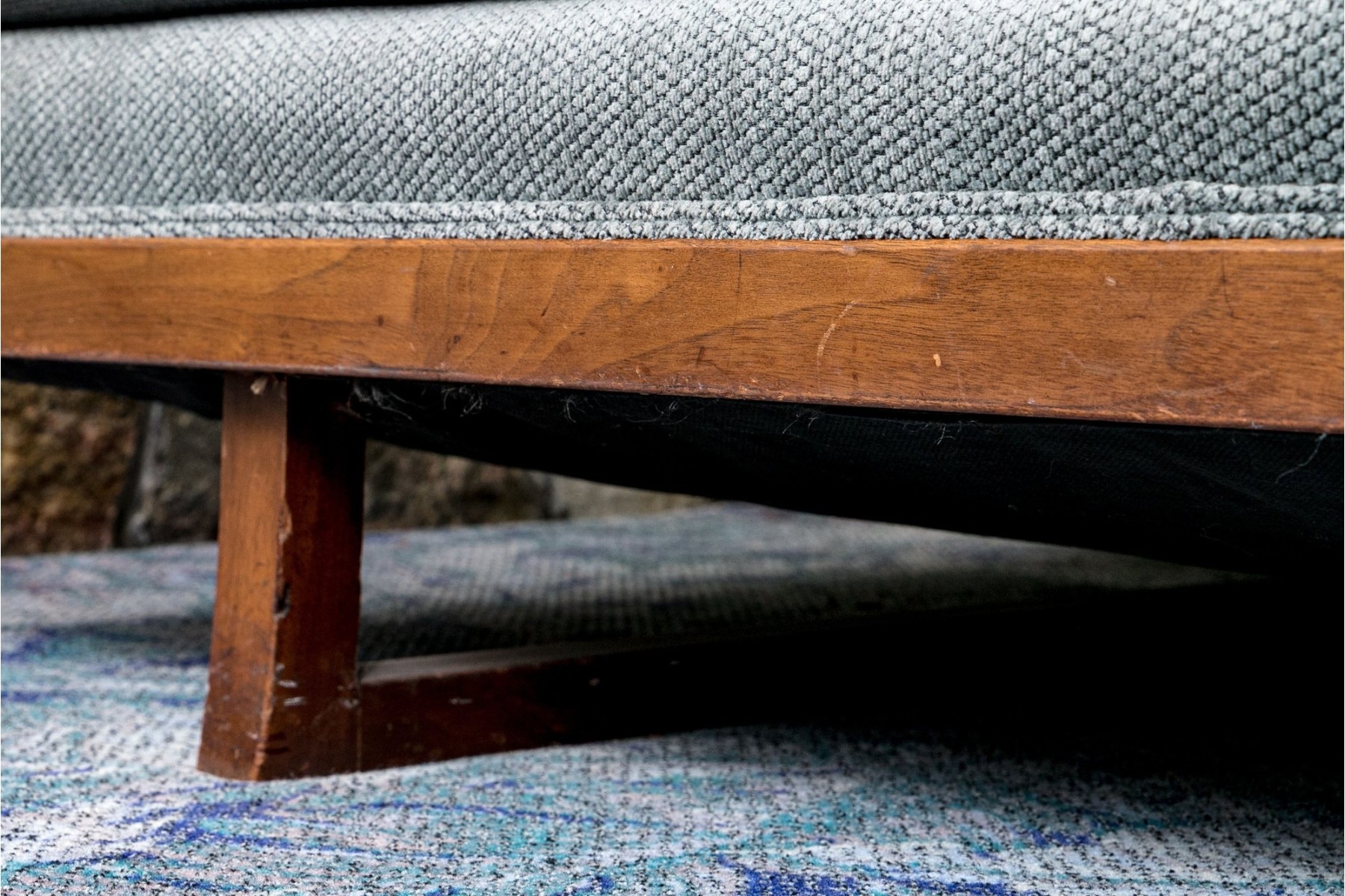 A handsome sofa overall. Some frayed threads along the edge of the right arm upholstery and minor finish wear to the frame.