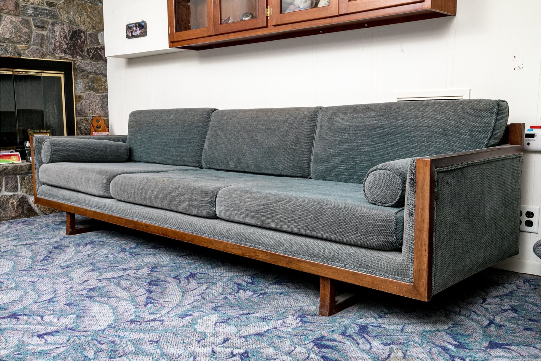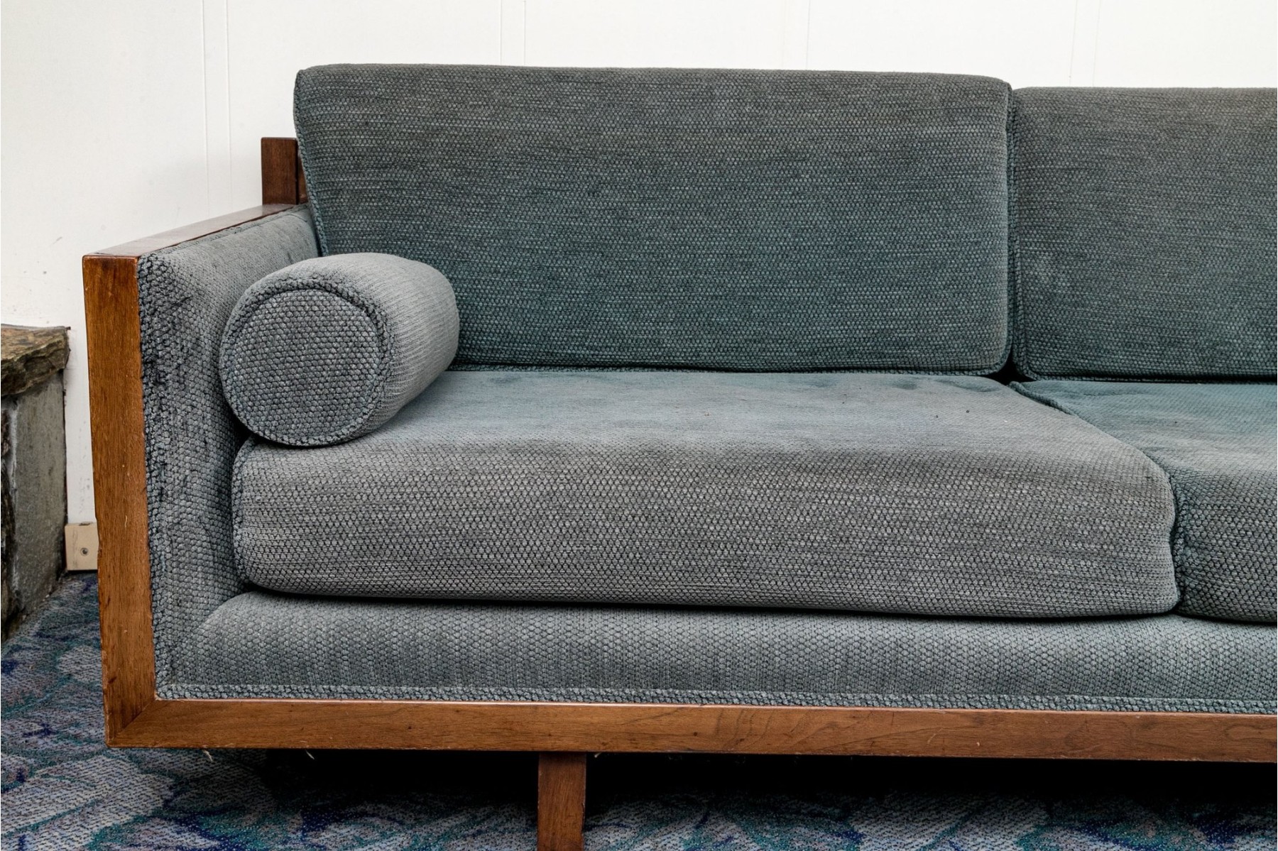 A fabulous vintage sofa with great mid-century modern Milo Baughman style, well crafted with a long straight back, rail arms with a walnut finished exposed wood frame, and three loose back and seat cushions accompanied by two bolster pillows im matching slate blue upholstery. Finished with a straight apron raised over sleigh legs.