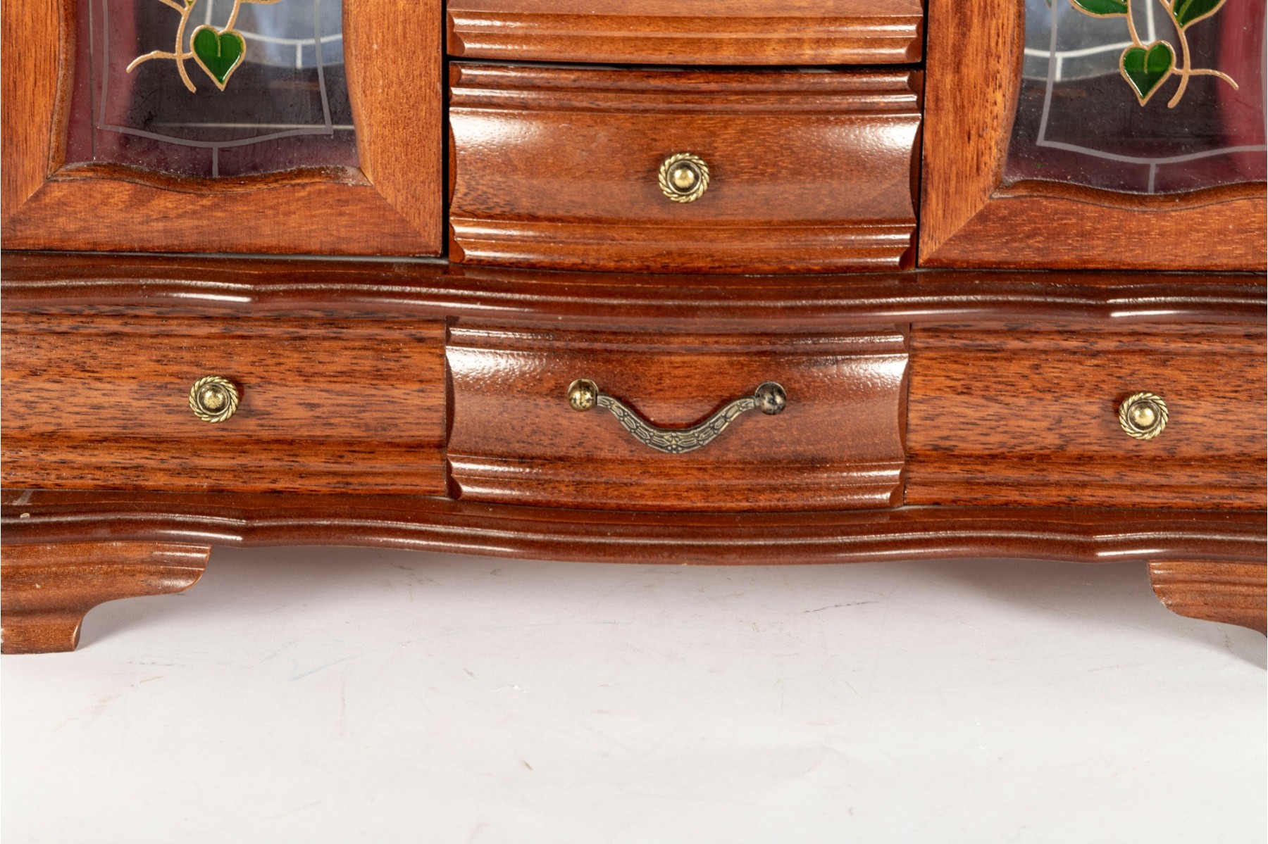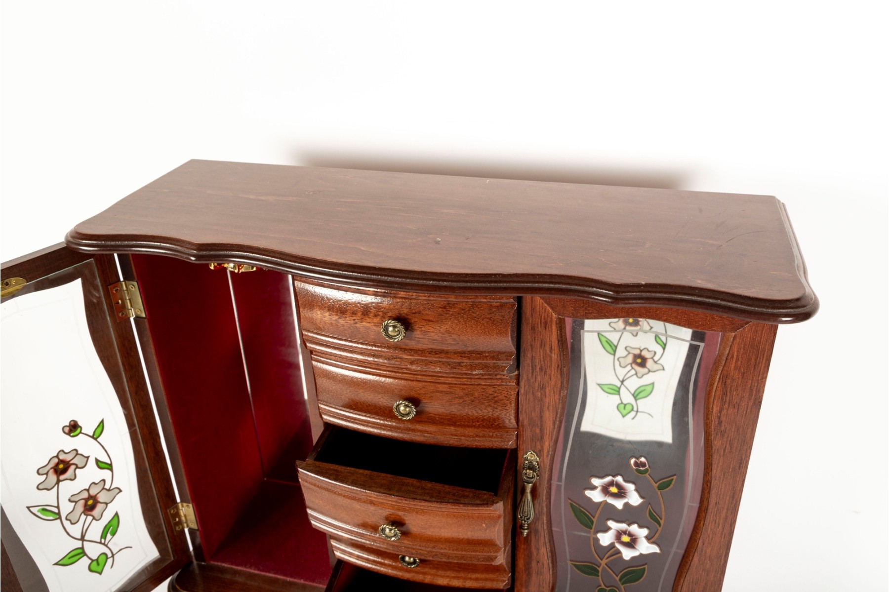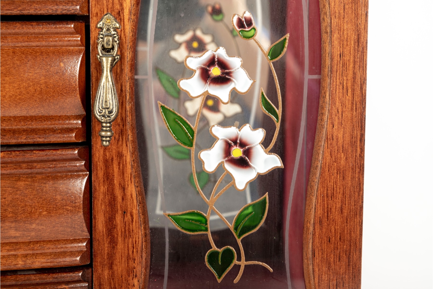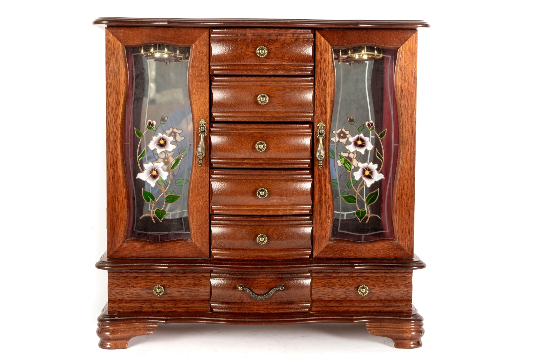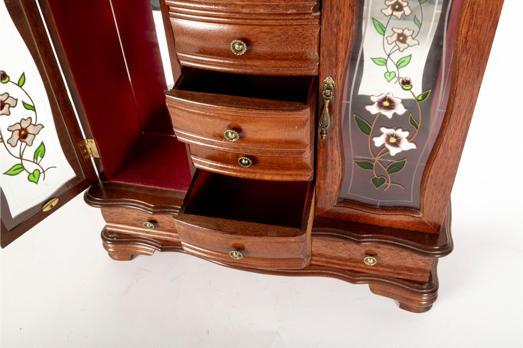 This vintage jewelry armoire features a traditional design with a rich wood finish. It has a central bank of drawers flanked by curved glass doors, each decorated with floral stained-glass-style motifs. The armoire includes brass hardware and stands on curved feet, combining functional storage with decorative appeal