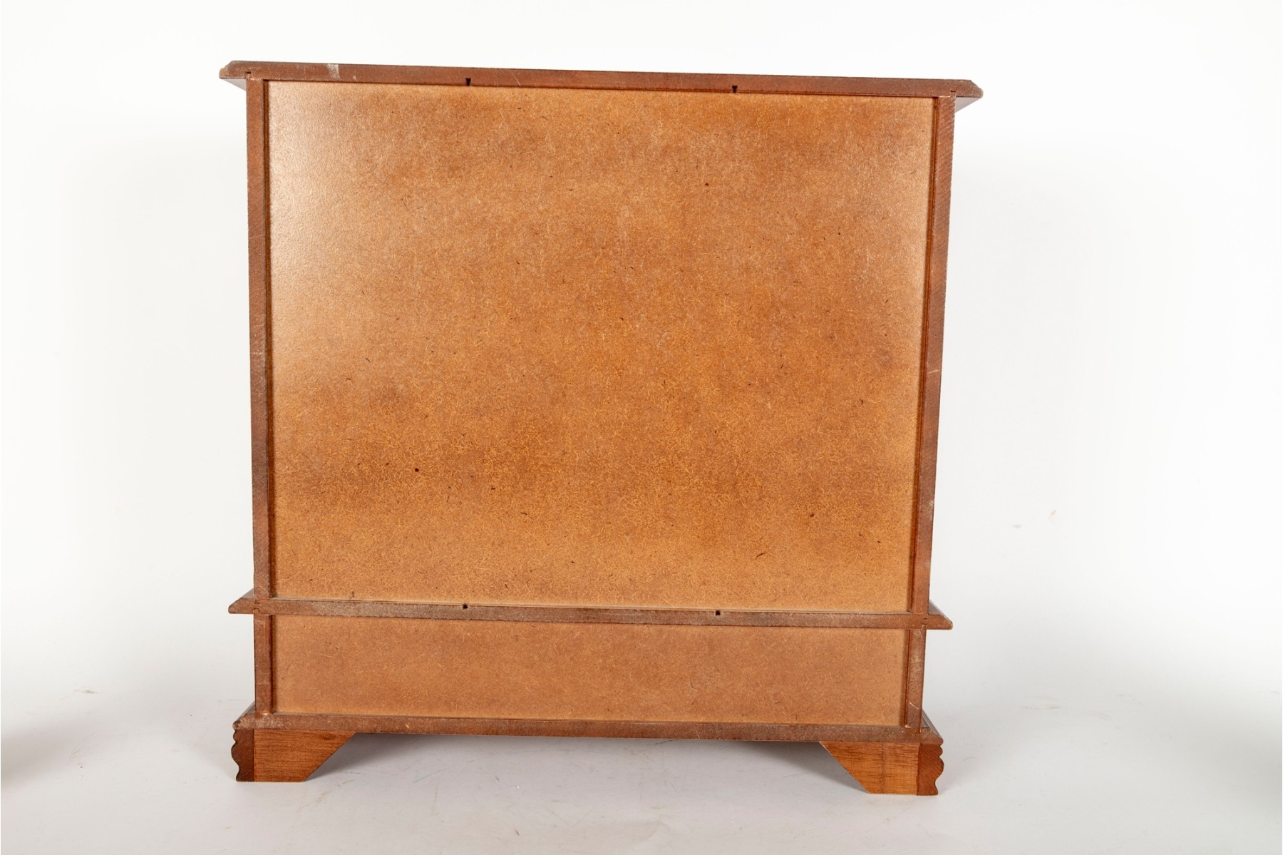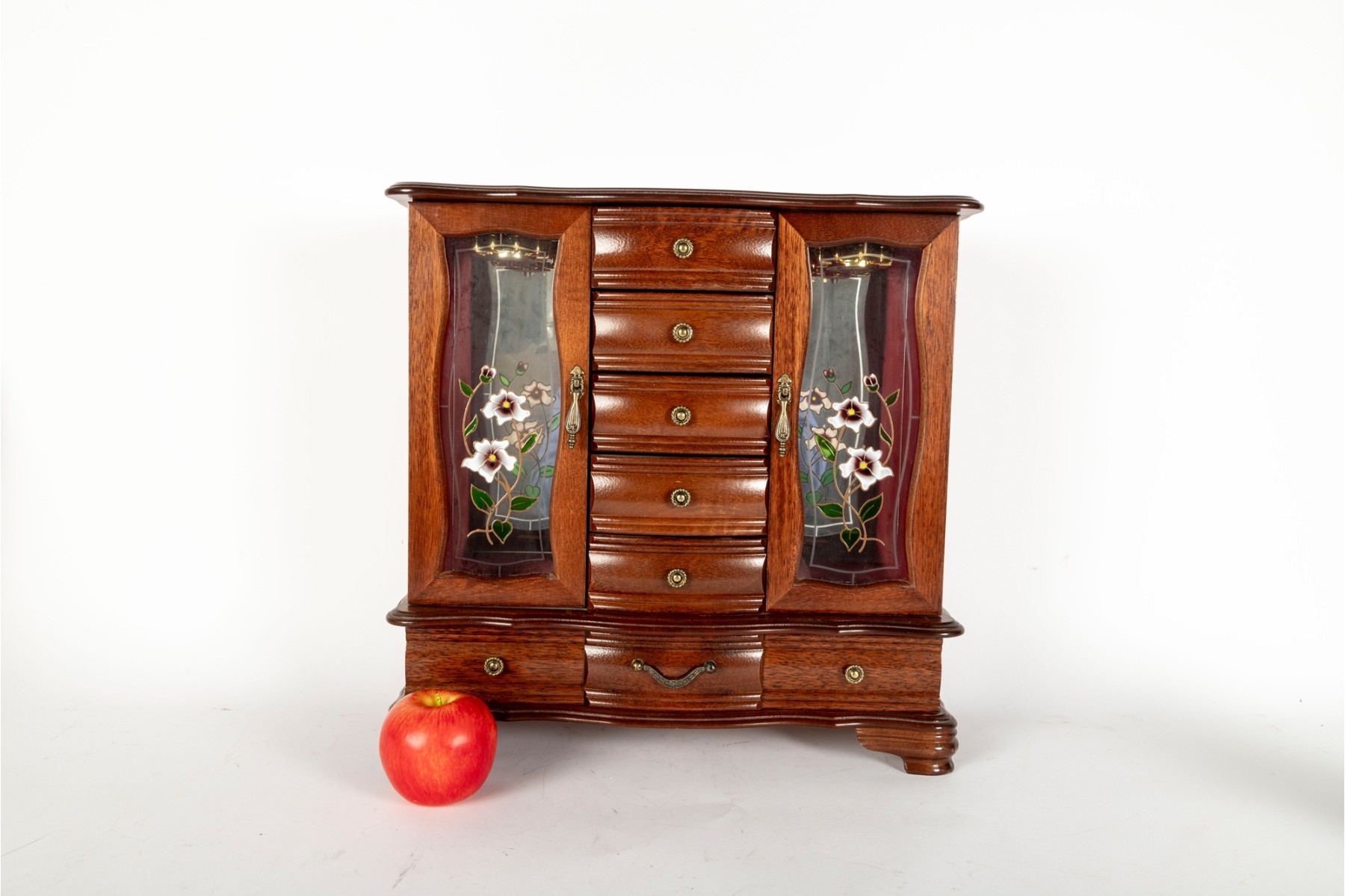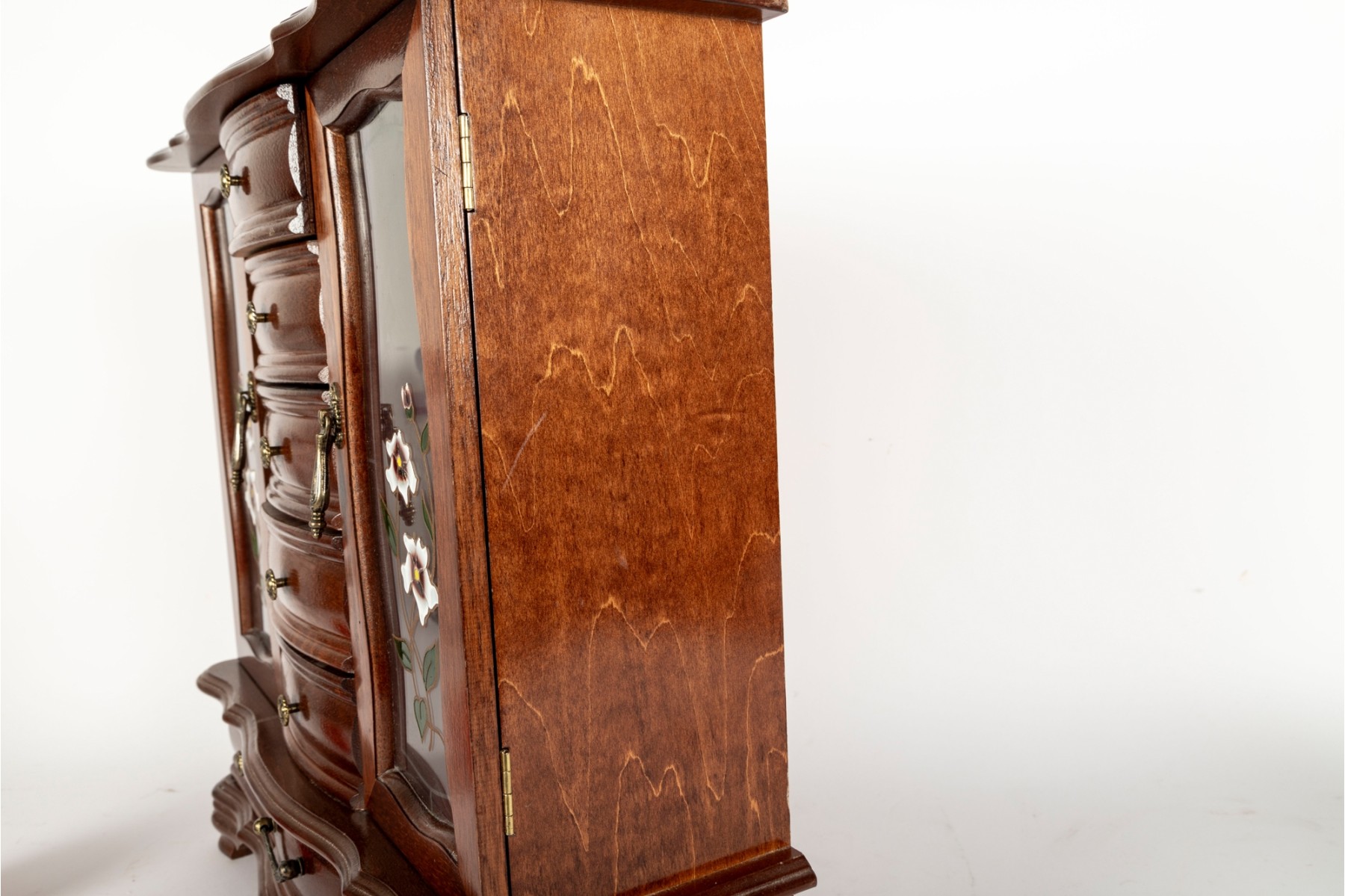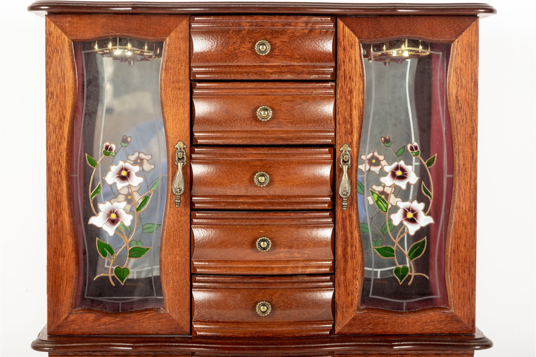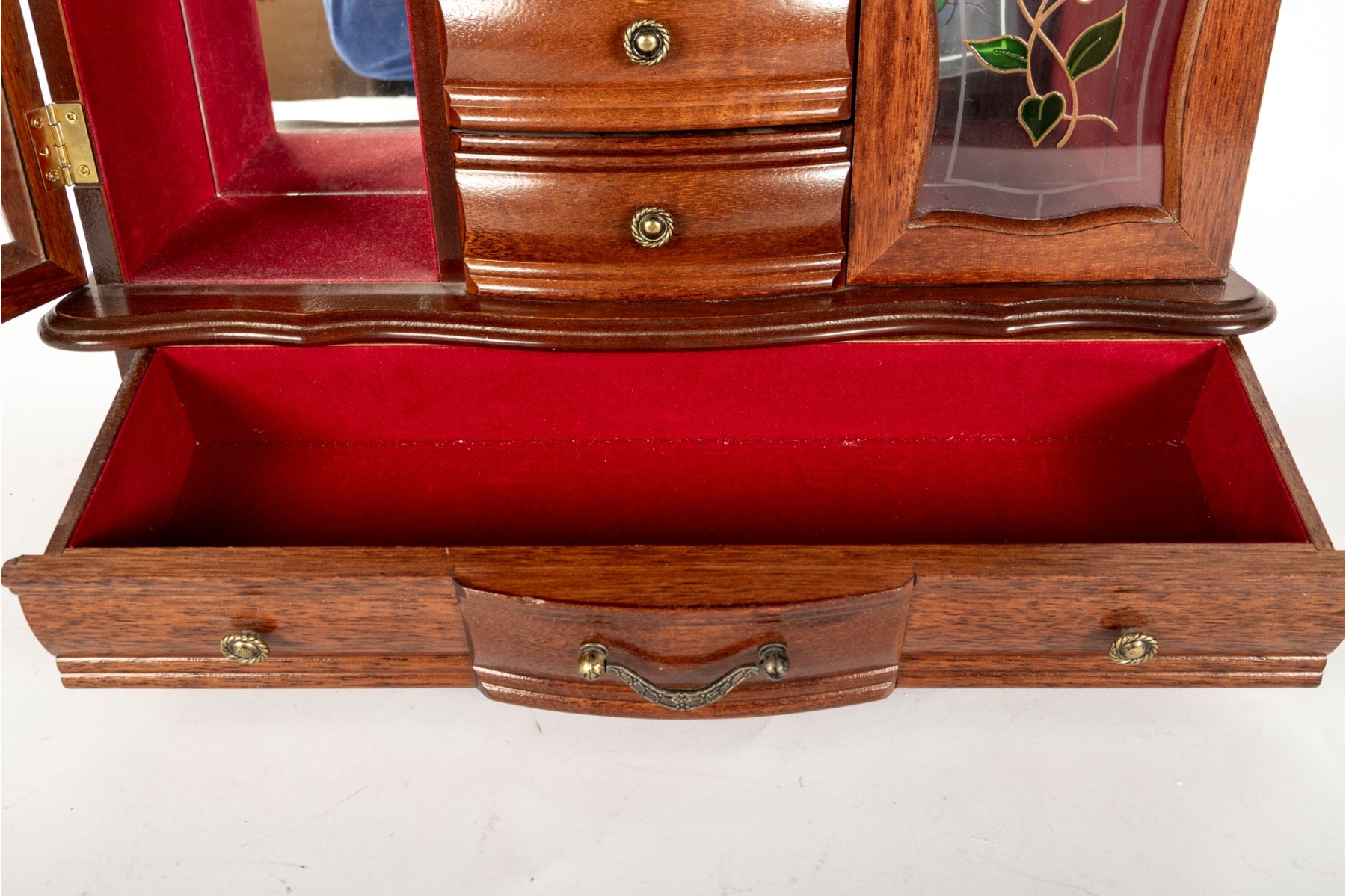 This vintage jewelry armoire features a traditional design with a rich wood finish. It has a central bank of drawers flanked by curved glass doors, each decorated with floral stained-glass-style motifs. The armoire includes brass hardware and stands on curved feet, combining functional storage with decorative appeal