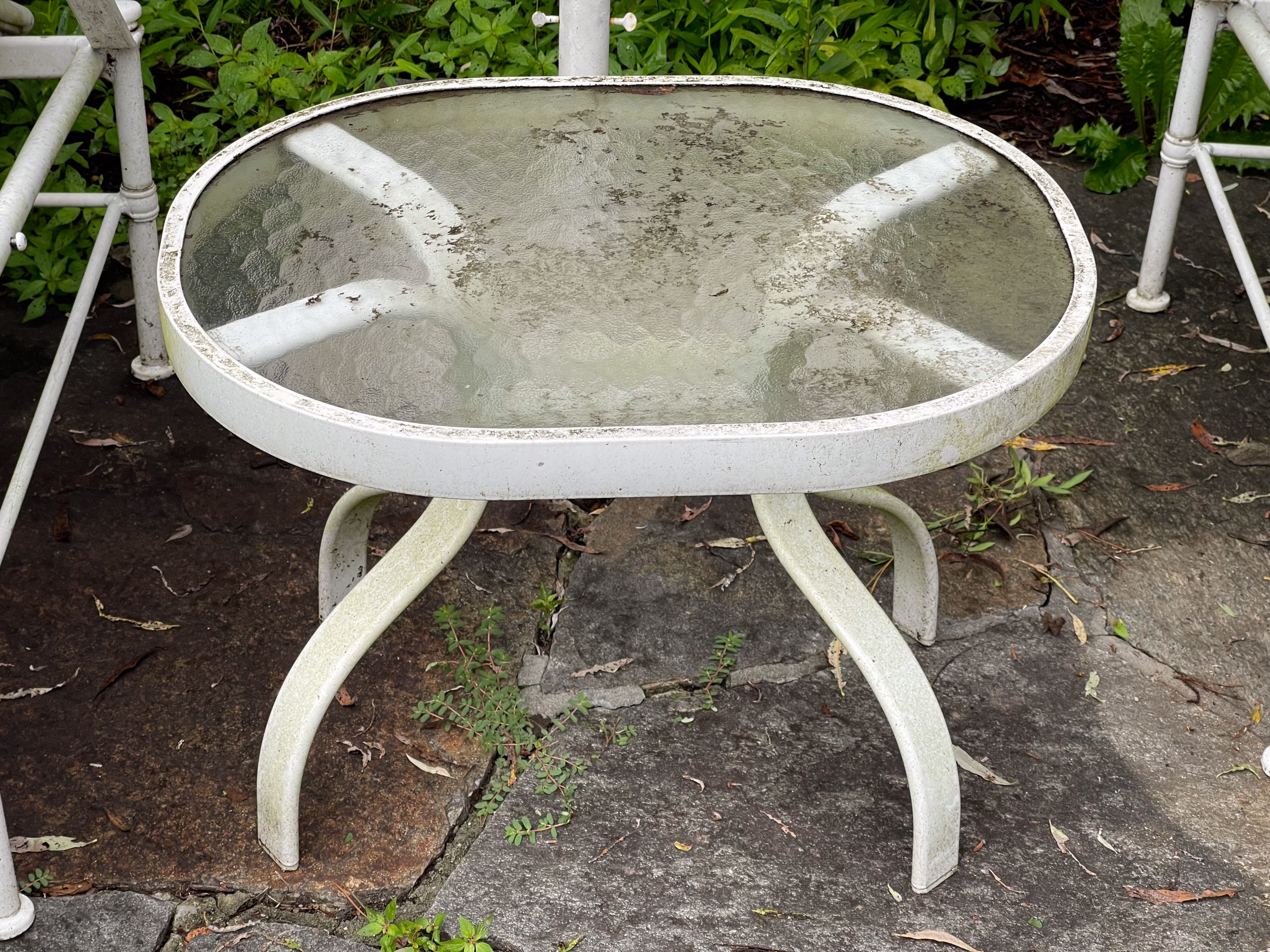 - A small oval aluminum table with mottled glass surface (17 1/2" H x 24 1/2" W x 19 1/2" D)