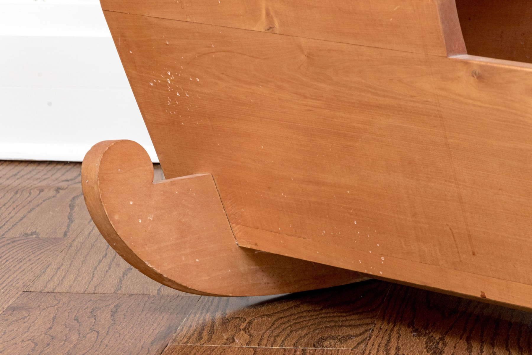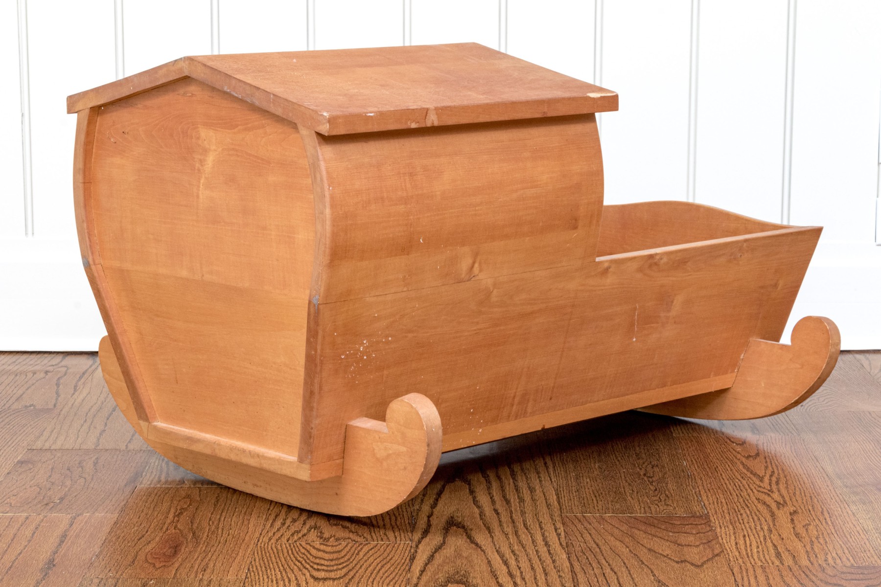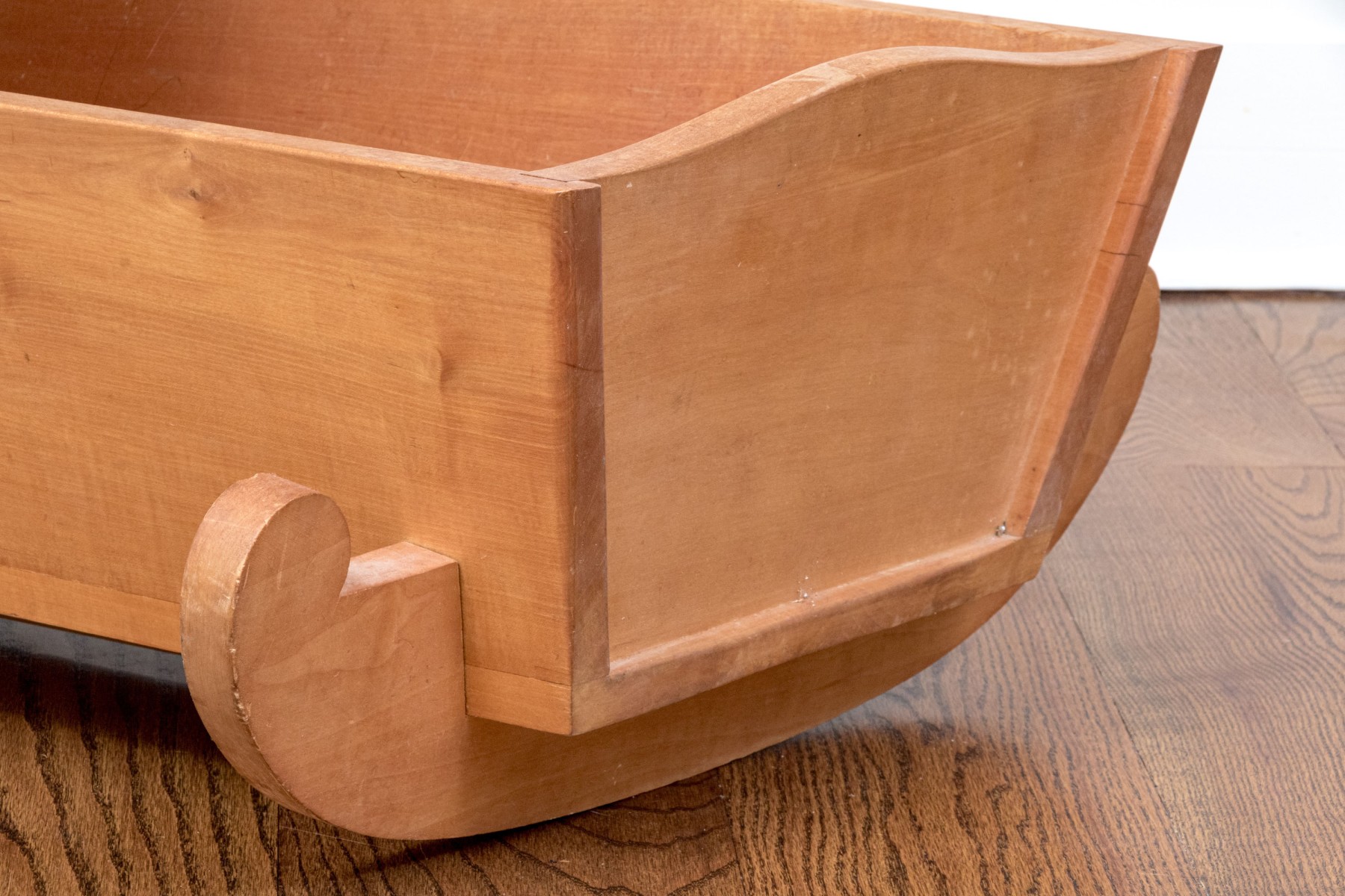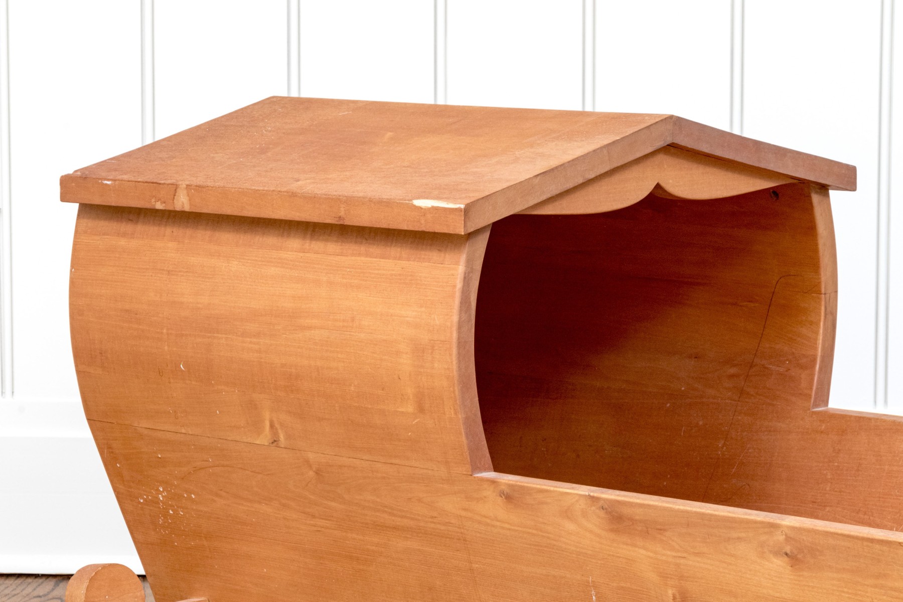 Wonderfully carved and natural finished with two carved supports to rock the baby which can lay in the well formed compartment with peaked roof above one end with decorative scalloped mantle.