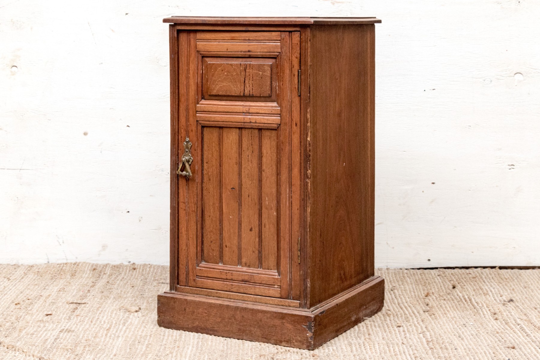Door has a brass handle which acts as key, when it is turned the door opens. There are two interior drawers.