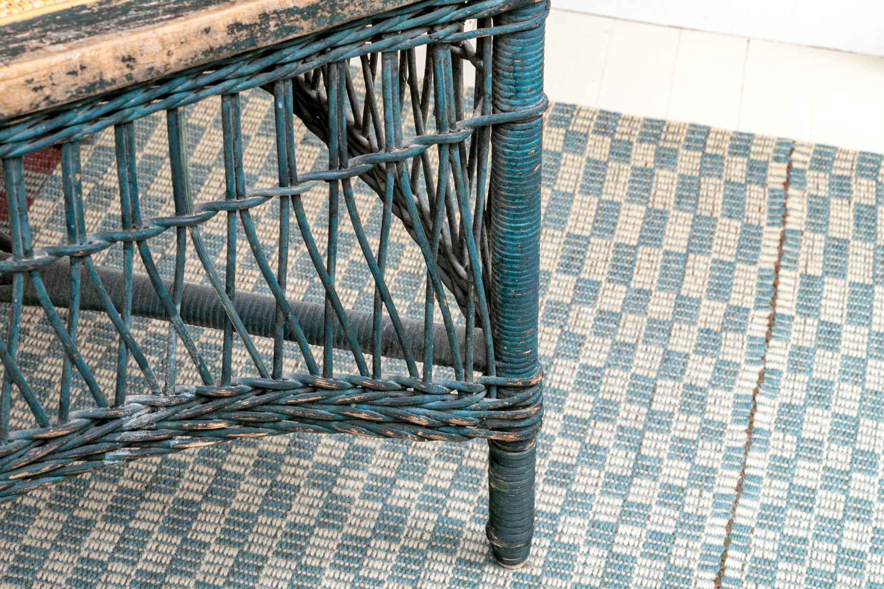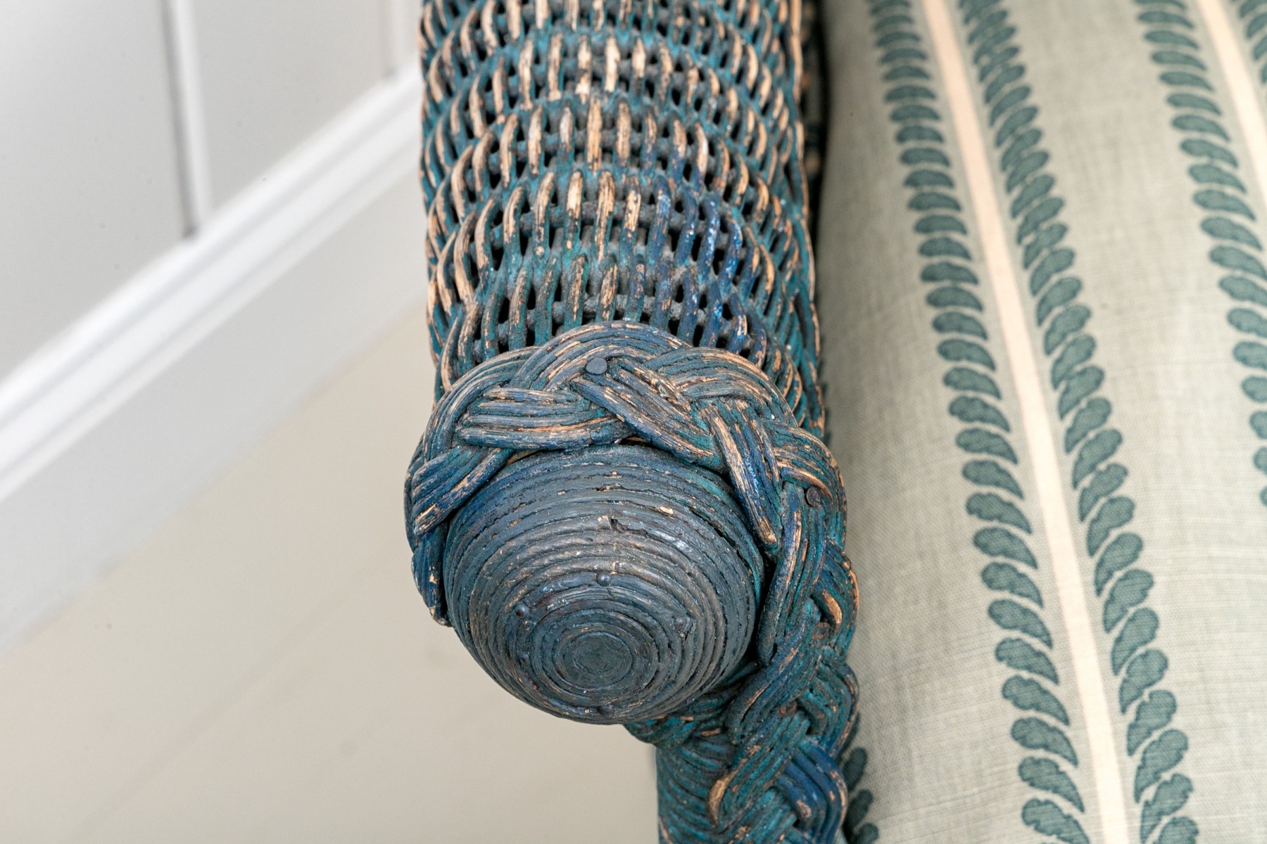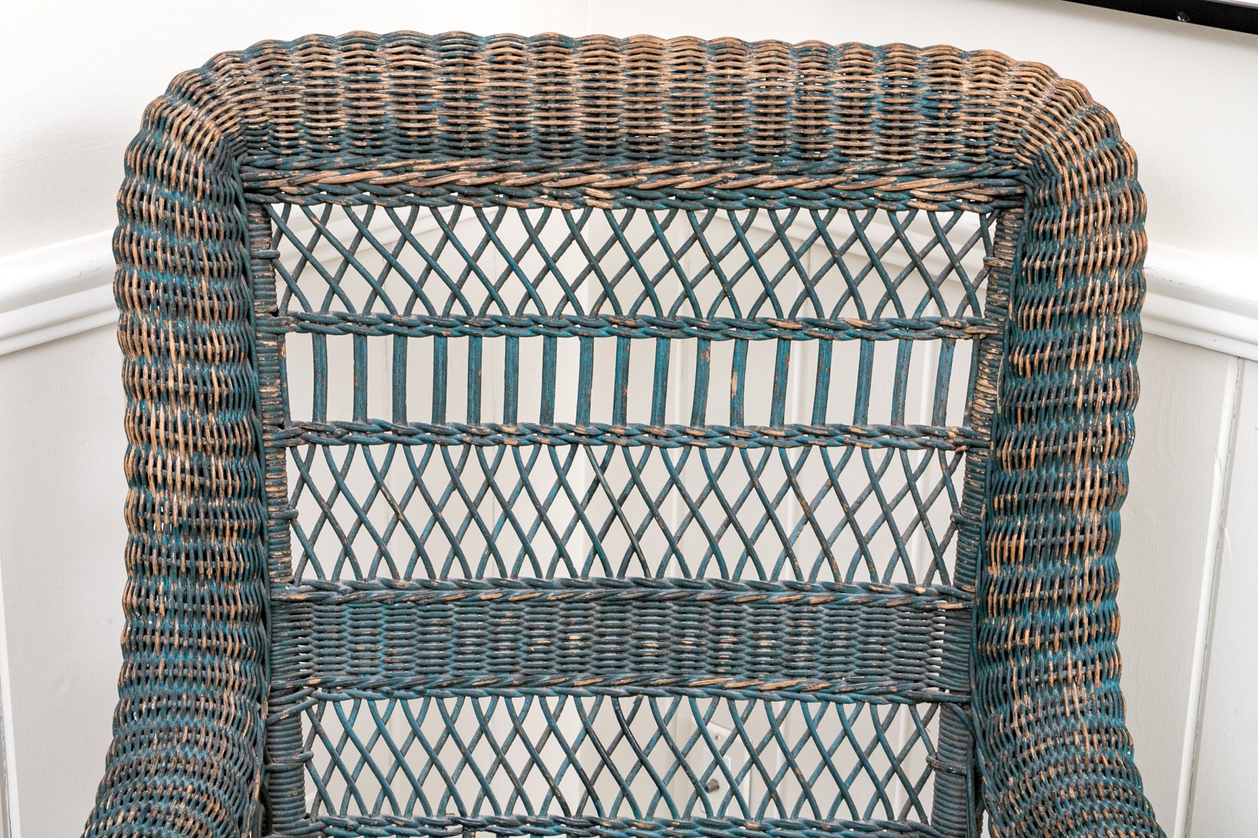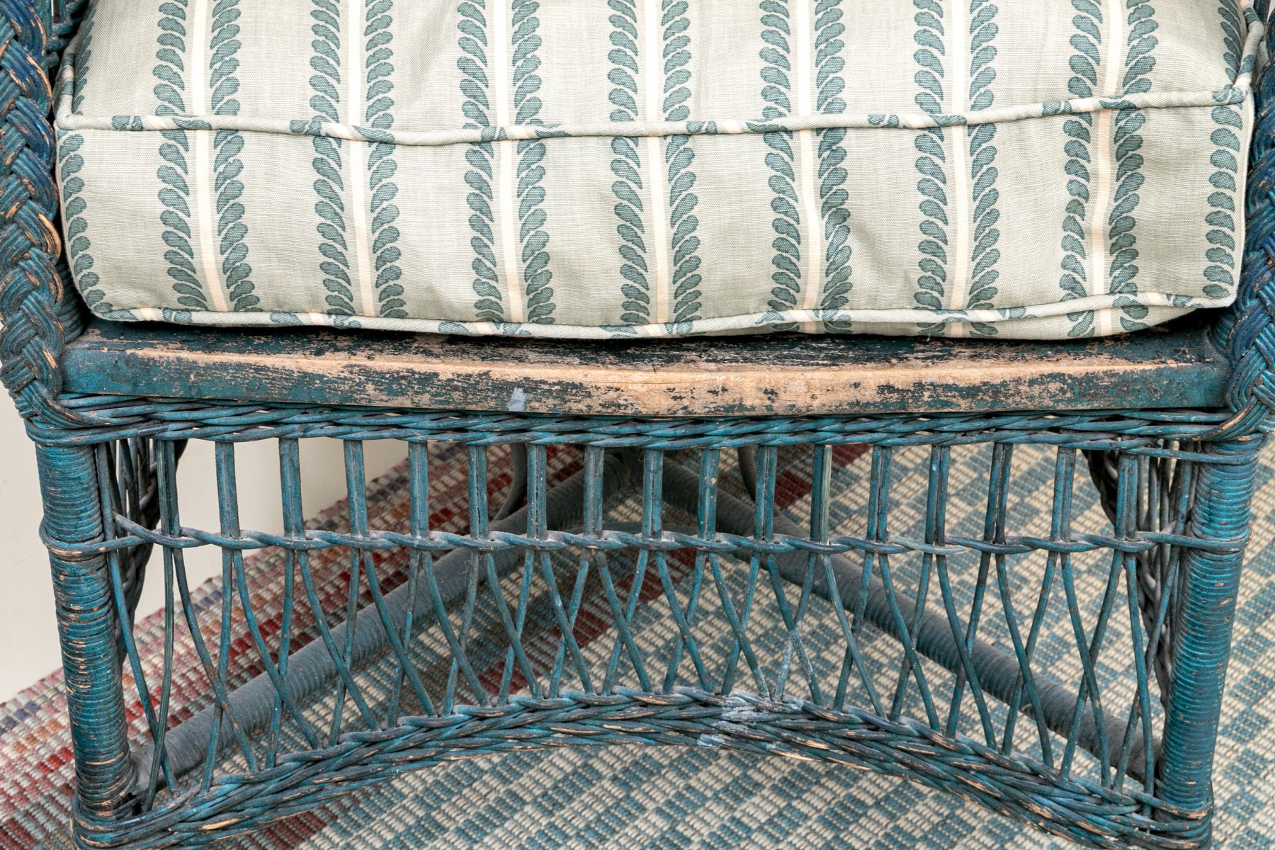Paint finished woven wicker armchair. Standing upon four legs with X form stretcher supports the chair has wonderful openwork woven apron above the legs. The chair has well woven arms and seat back top rail. The chair in a blue finish.