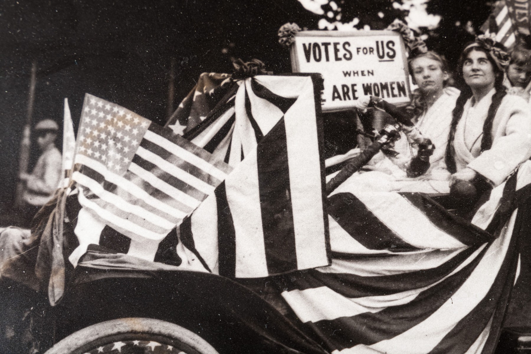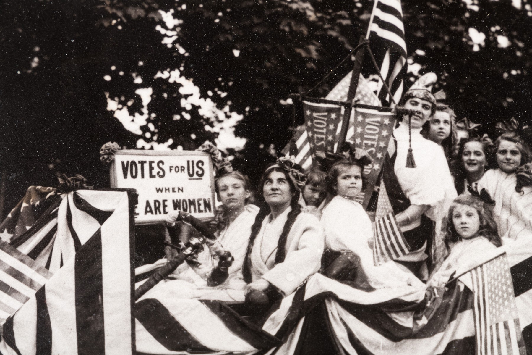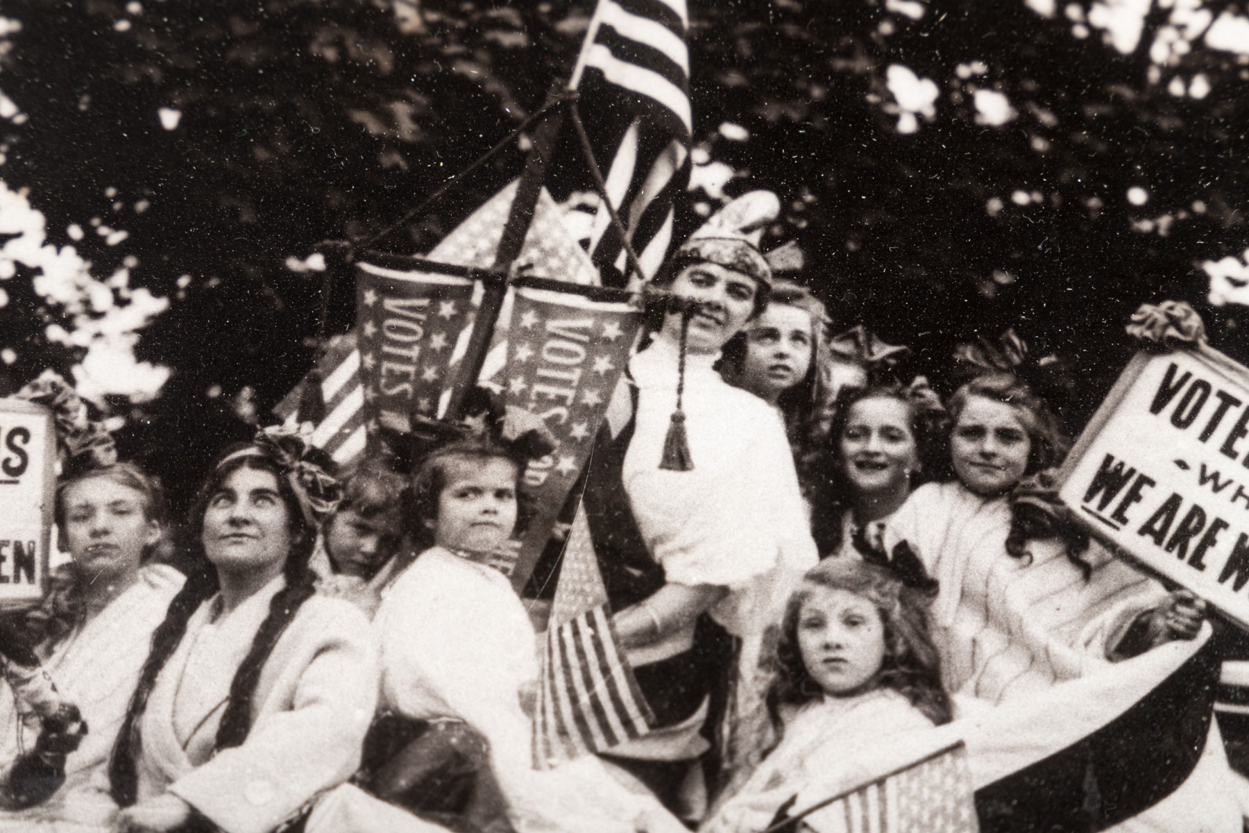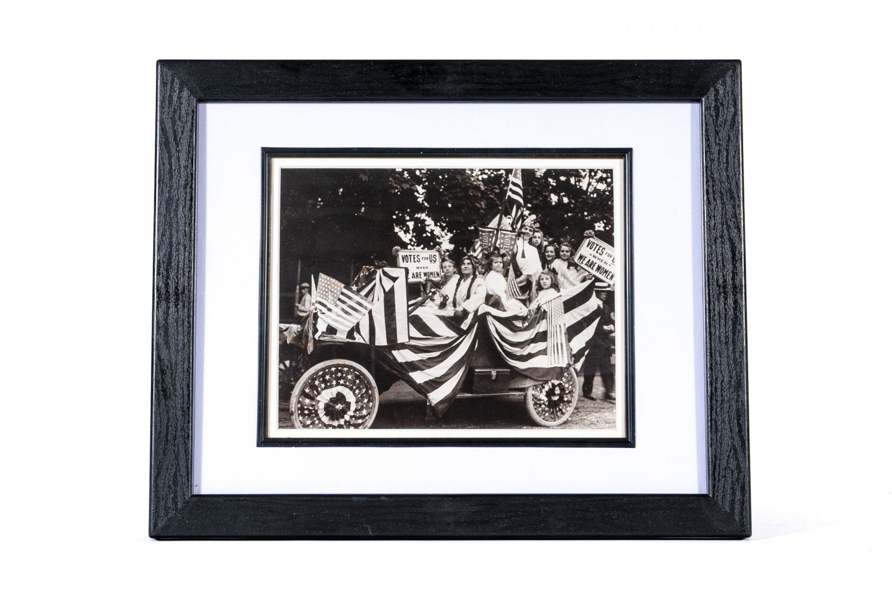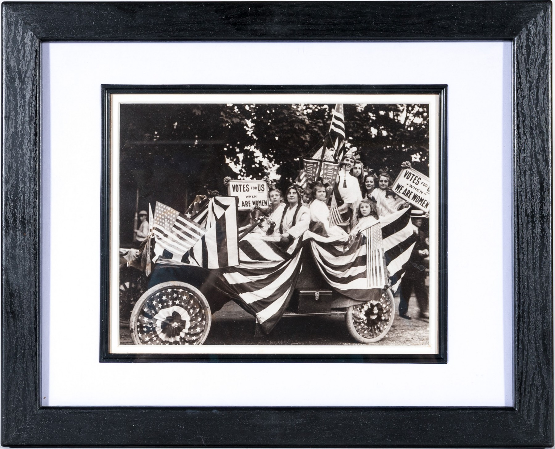 Vintage framed photo of women's voting rights movement. The photo is antique, with an attribution on the back. the frame is modern.