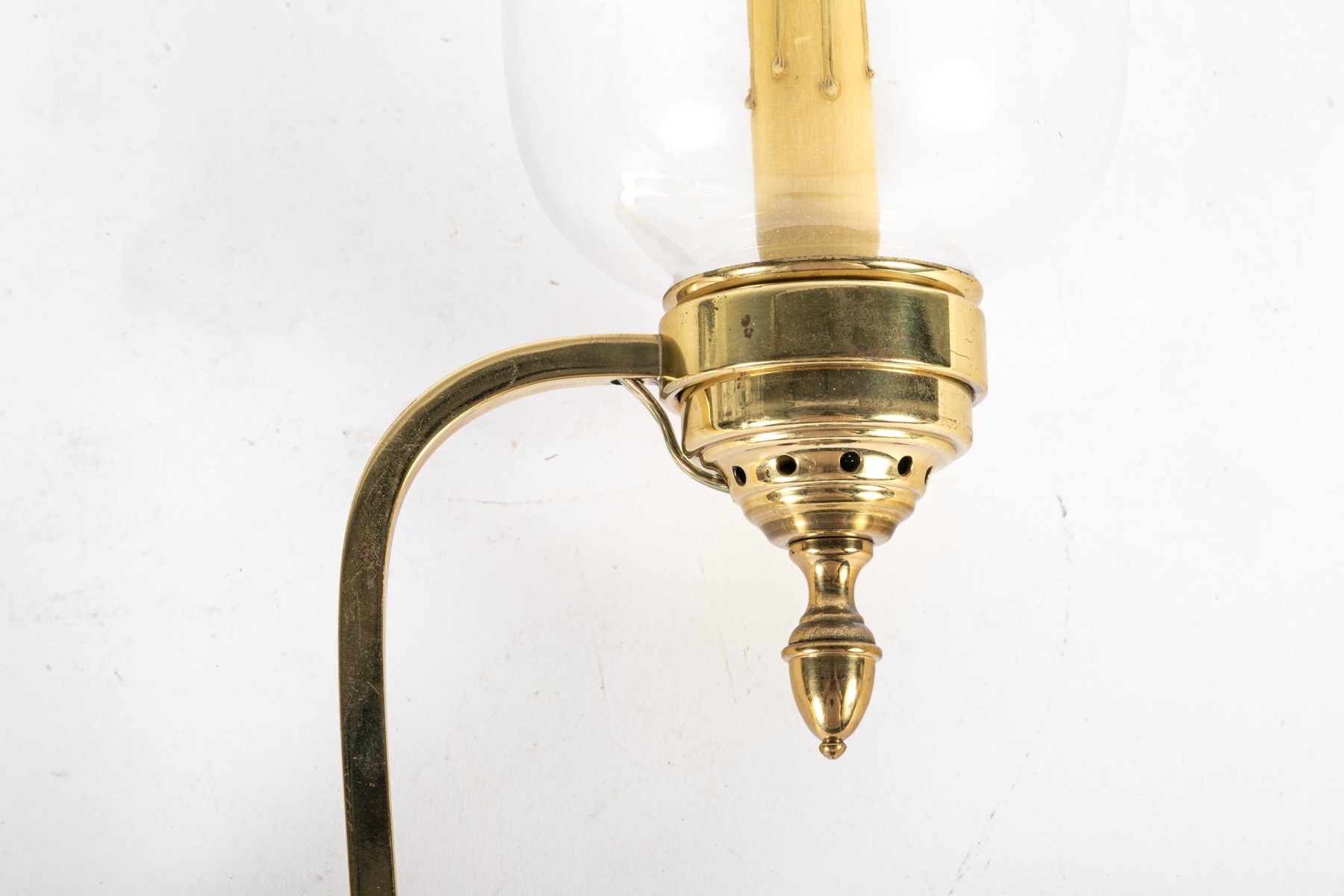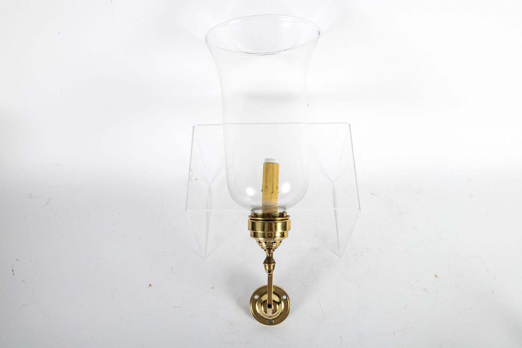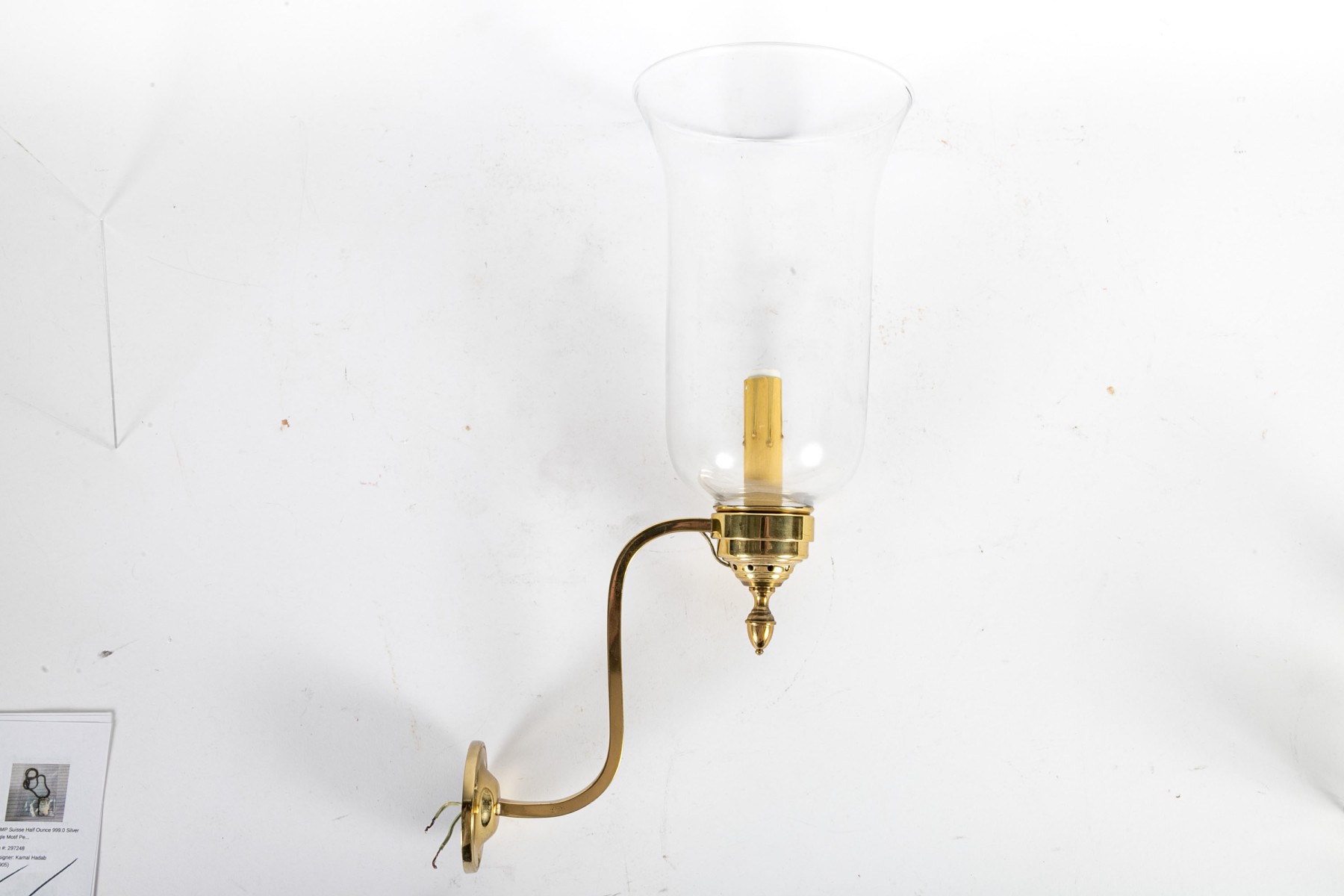 An elegant Virginia Metalcrafters electric wall sconce displaying a simple curving arm supporting a font-like nozzle with a cream-yellow candle-shaped socket. Topped with a tall, flared crystal hurricane shade.