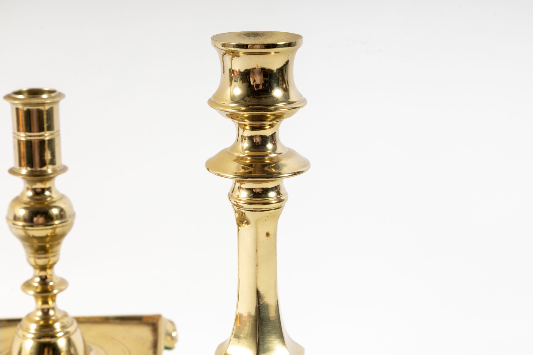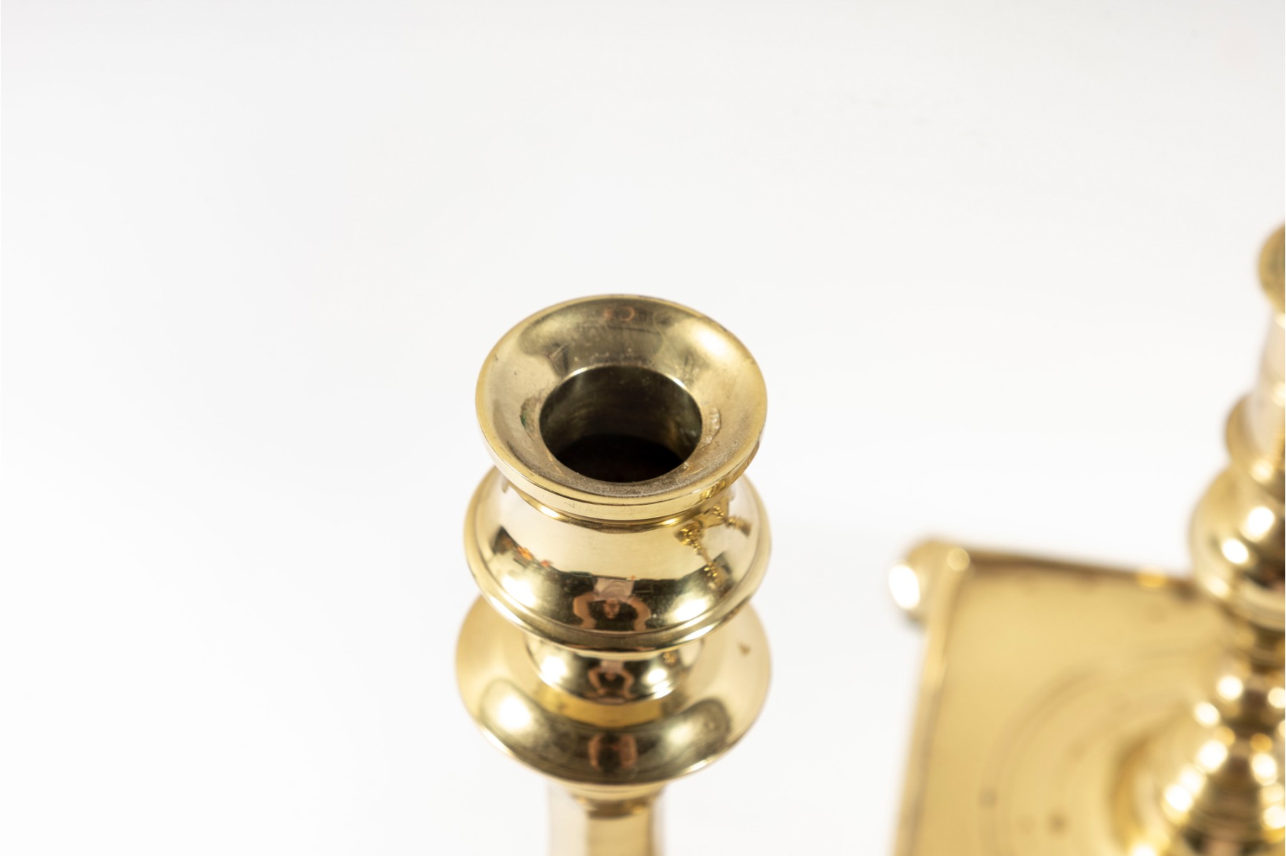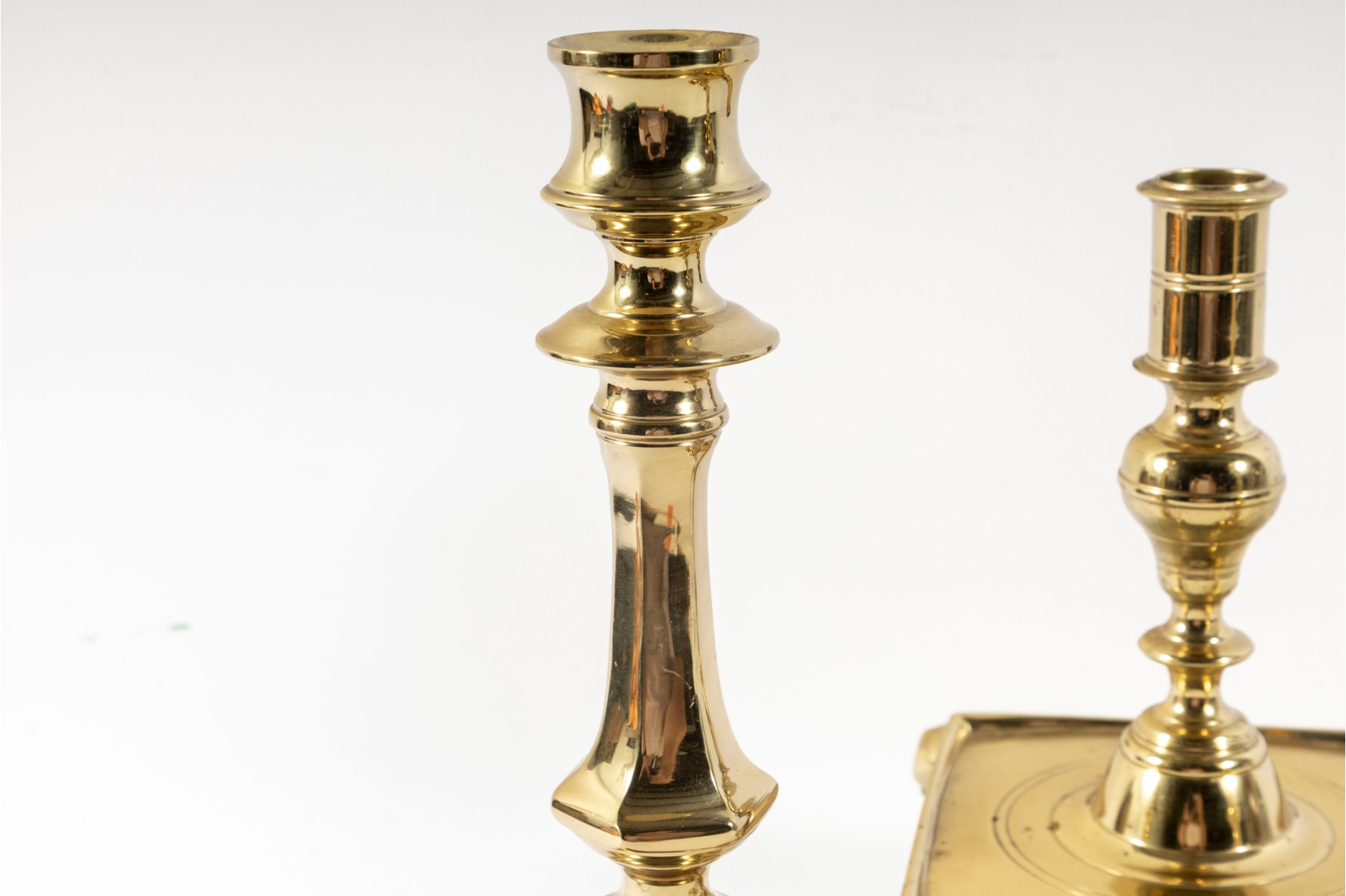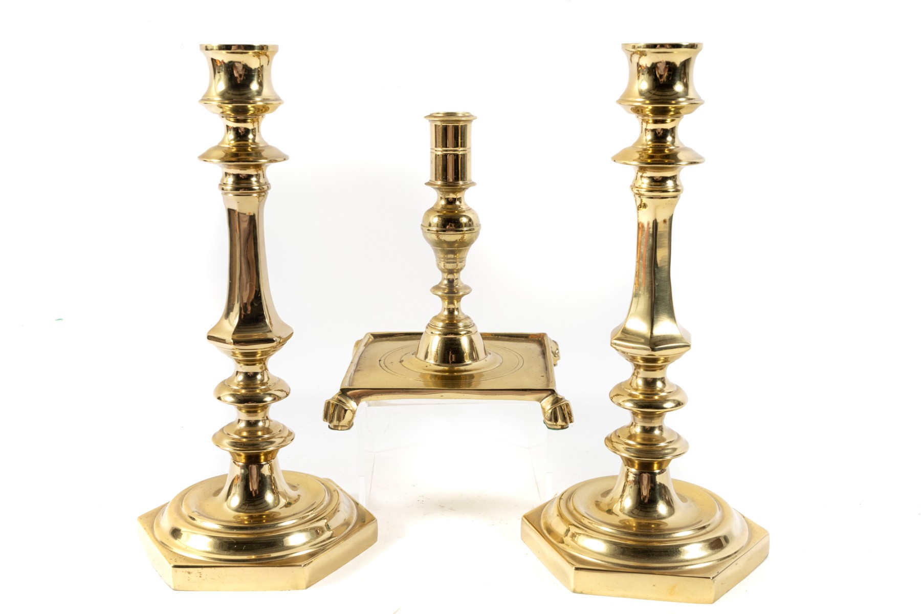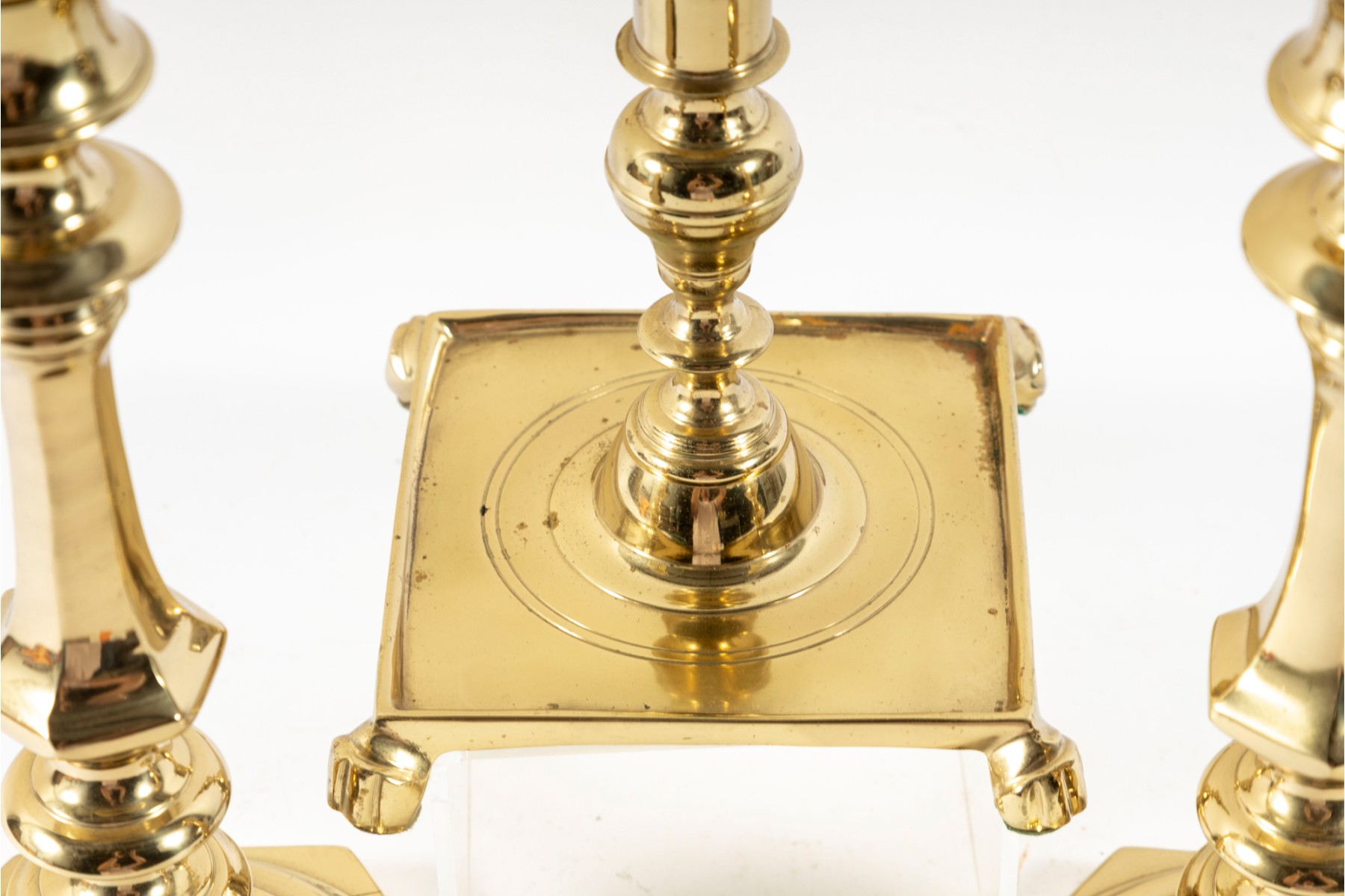 A trio of vintage Virginia Metalcrafters solid brass candlestick holders with column forms, one footed. All items are stamped with the Virginia Metalcrafters insignia.